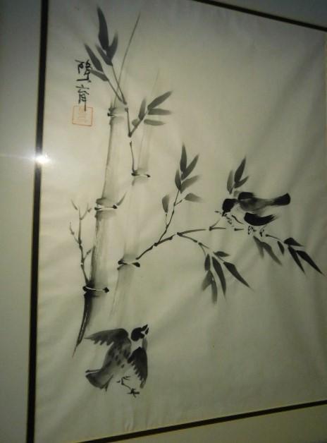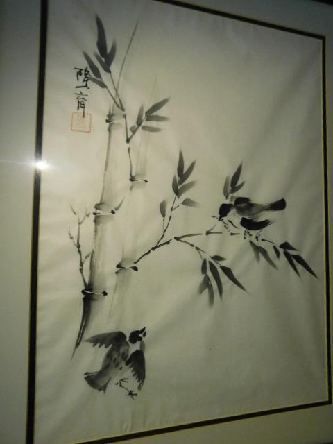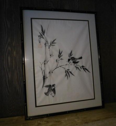 Framed Asian Art Birds in Bamboo Branch 22"x29"
