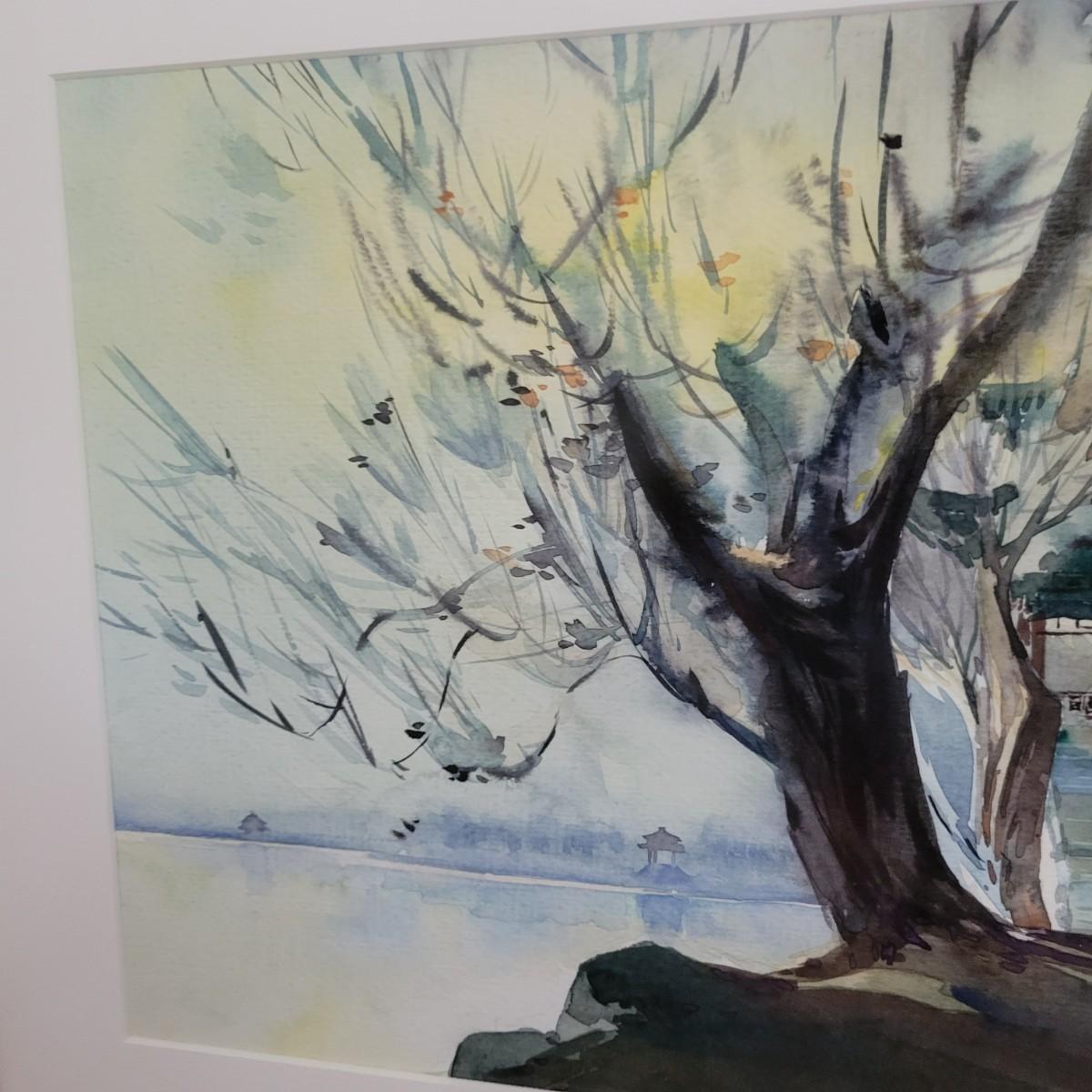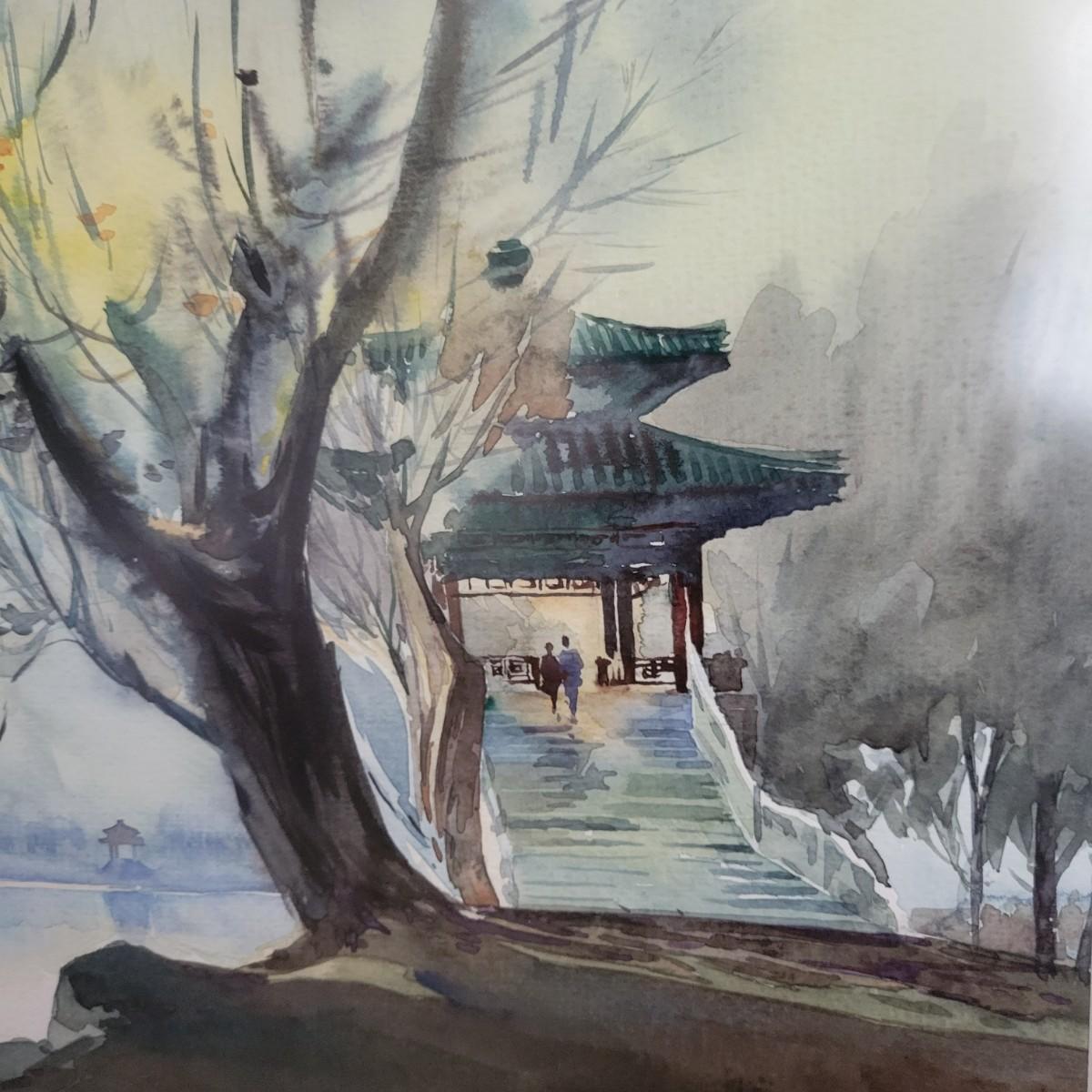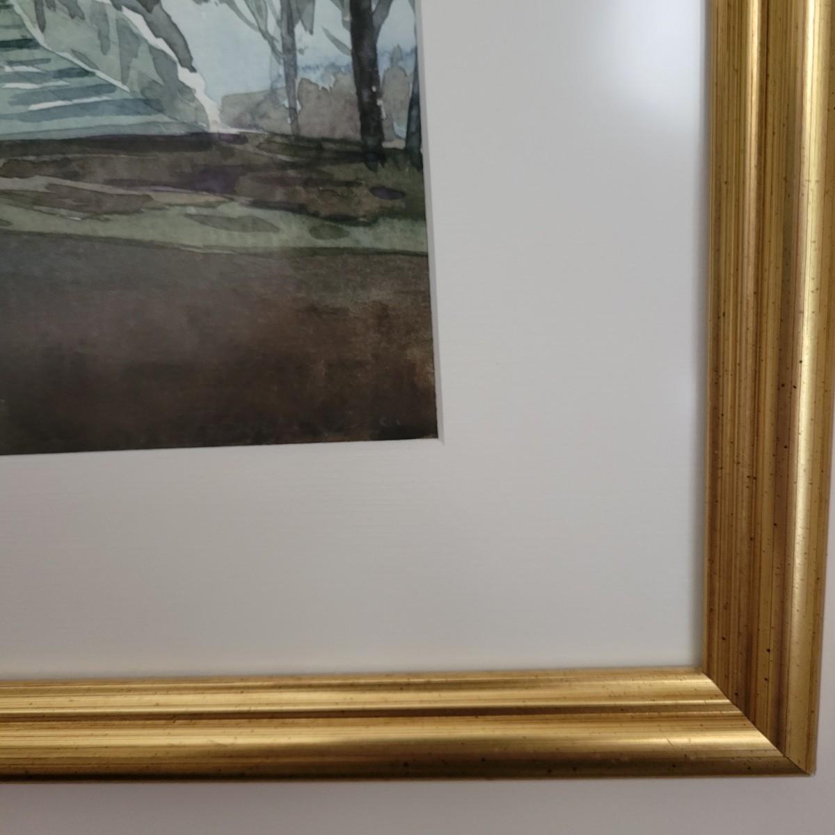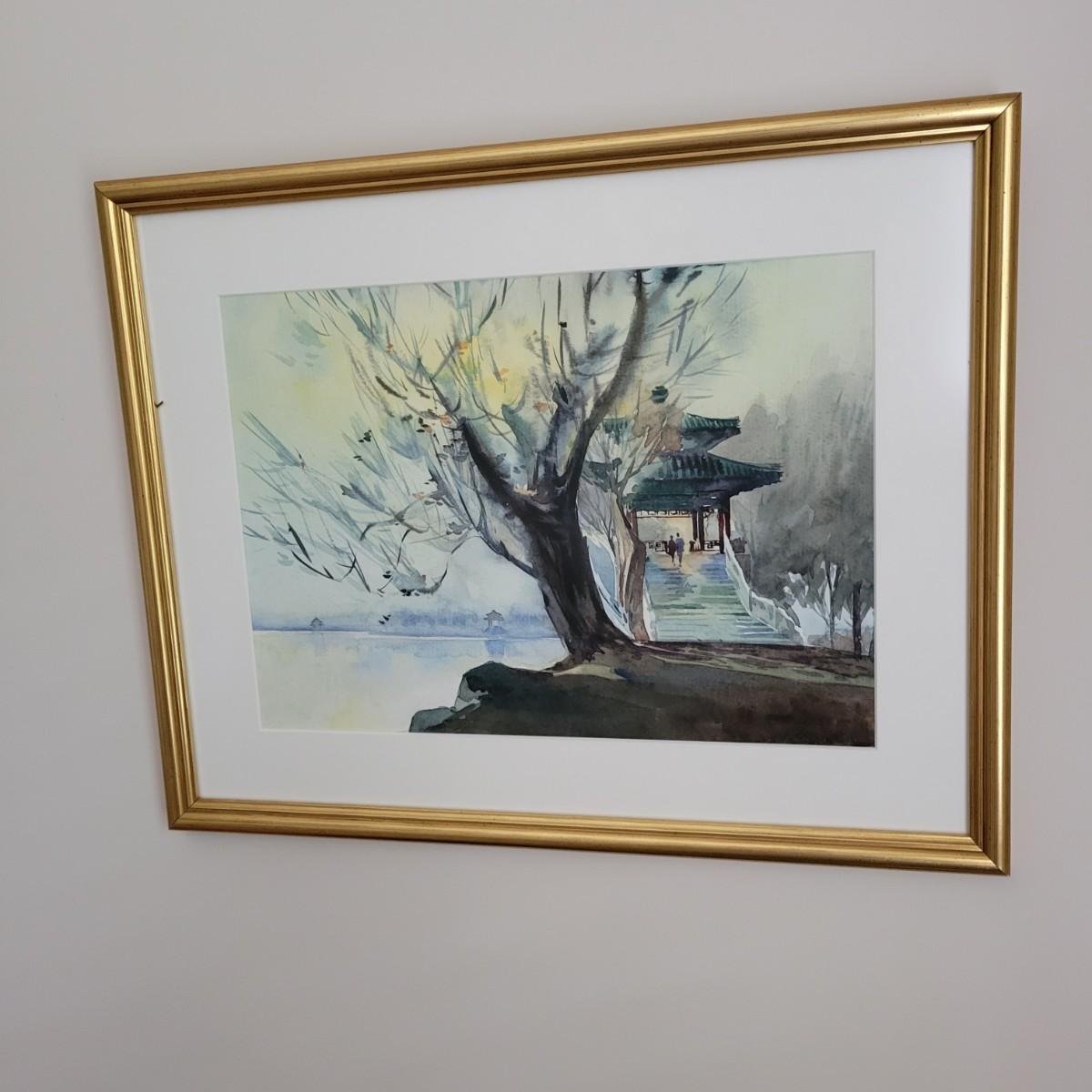 An original watercolor color of an Asian landscape. It is framed on a simple wooden frame with a gold finish, a single cream colored mat and has non glare glass. It measures approximately 19.5" x 1" x 15.5"H. Shipping available. Shipping can be costly. We suggest contacting our preferred local shipping provider, Postage Express, with dimensions and getting an estimate before bidding: (828) 670-5501 or postageexpress@yahoo.com.