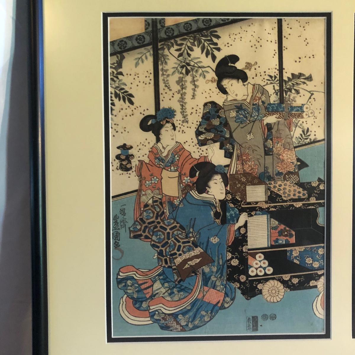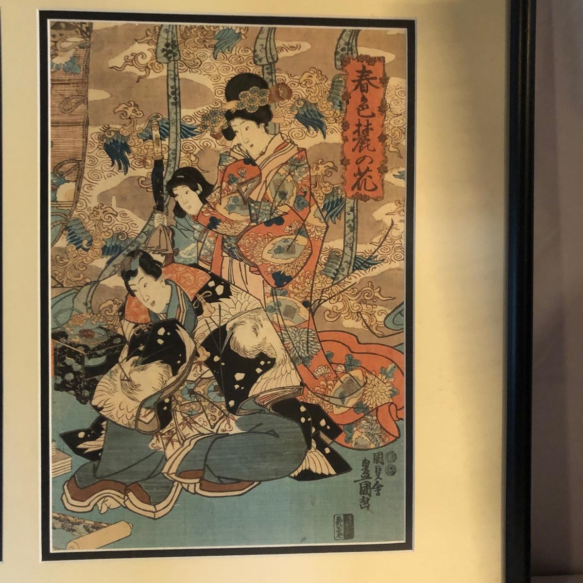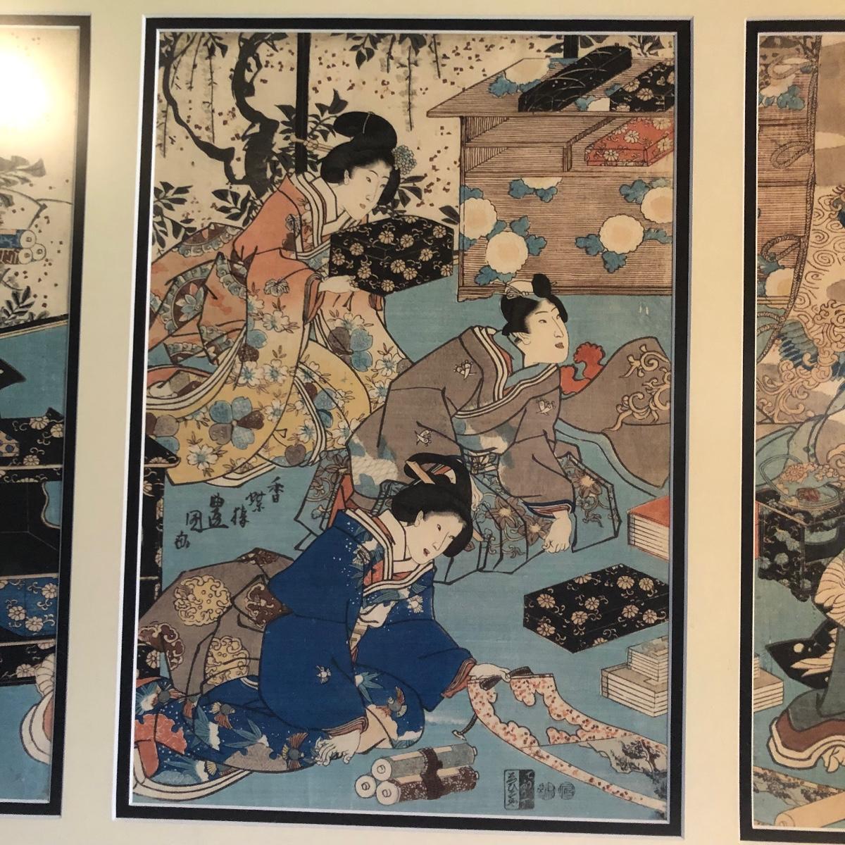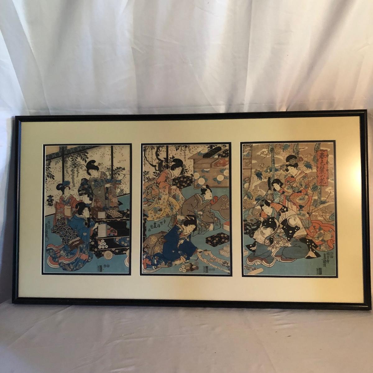 Lot includes a framed and matted three panel Asian print. Frame measures 21” x 38.5”.