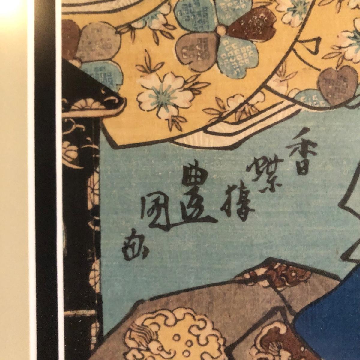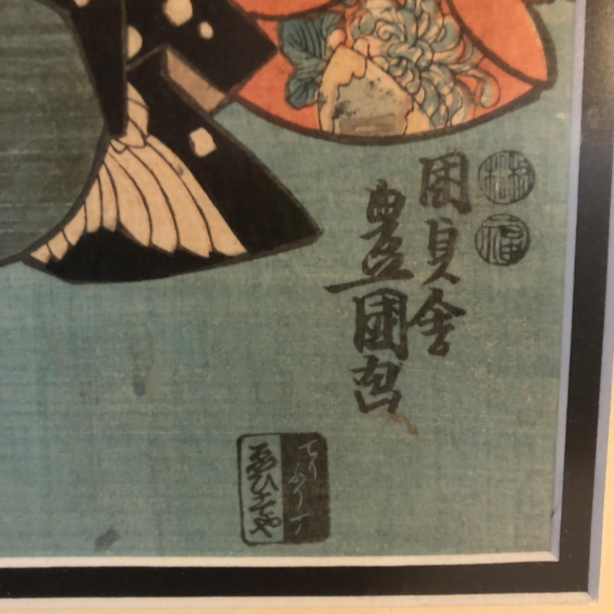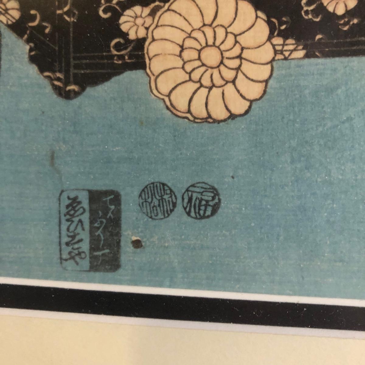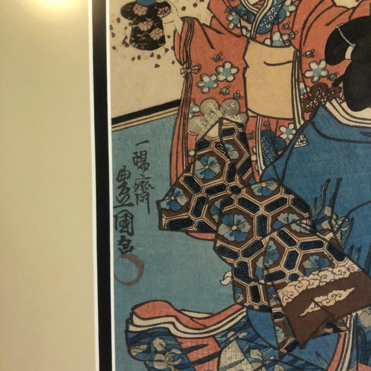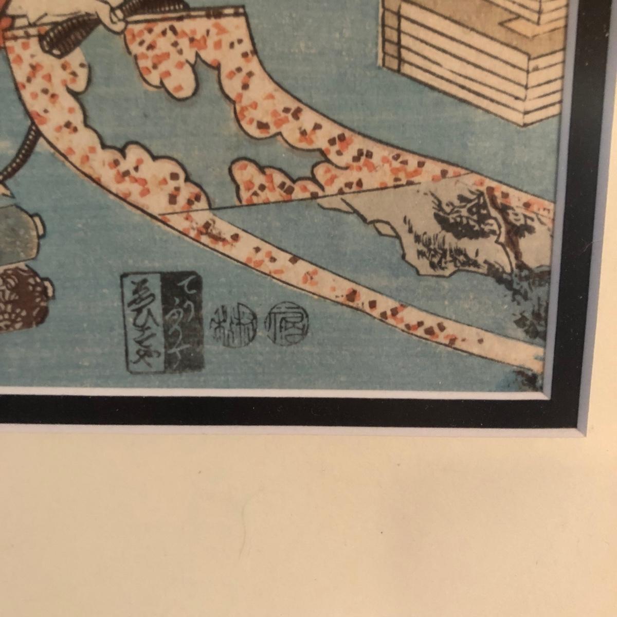 Lot includes a framed and matted three panel Asian print. Frame measures 21” x 38.5”.