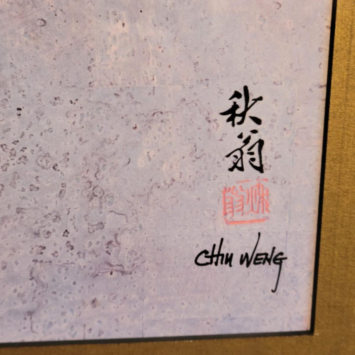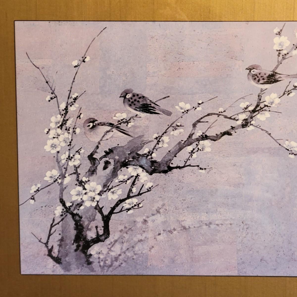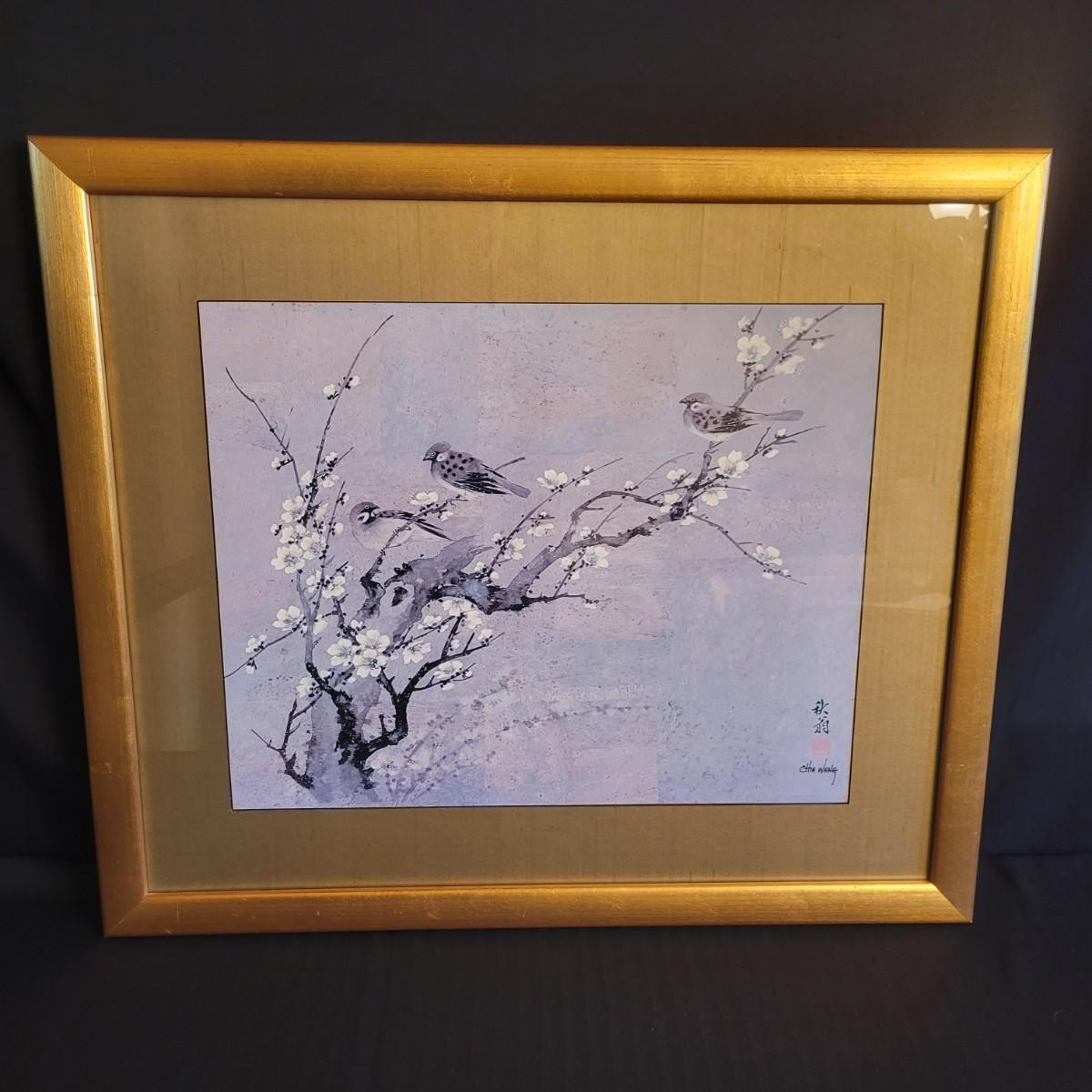 A framed Asian print by Chin Weng that depicts birds on a cherry tree. It's framed with a single gold colored black core mat with a wooden frame with a gold leaf finish. It measures approximately 28.5" x 24.5"H. Shipping available