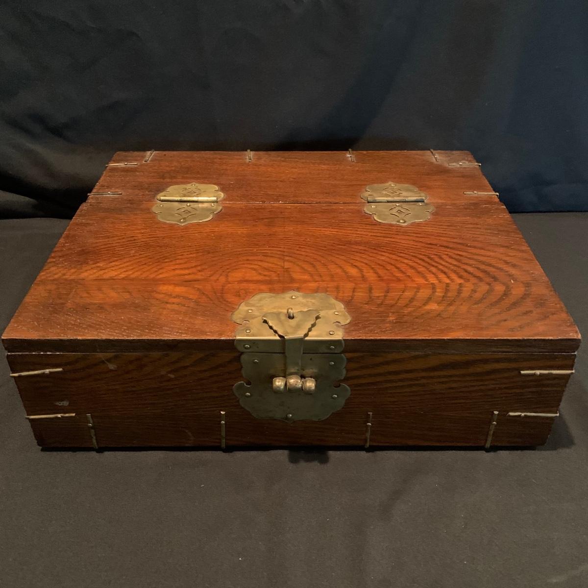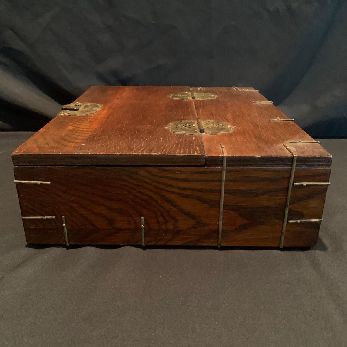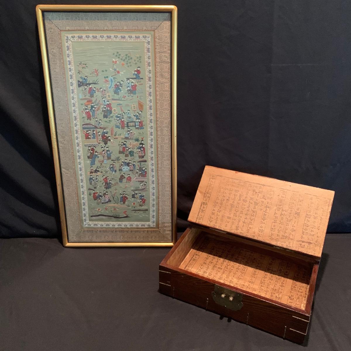 Lovely framed Asian silk and wooden box. Silk is framed in gold painted frame behind glass. Wooden box opens from the top and features printed Korean Hangukmal. Box has metal framing and small closure that could potentially lock. Framed silk measures, 14” x 27”. Shipping available. Shipping can be costly. We suggest contacting our preferred local shipping provider, Postage Express, with dimensions and getting an estimate before bidding: (828) 670-5501or postageexpress@yahoo.com.
