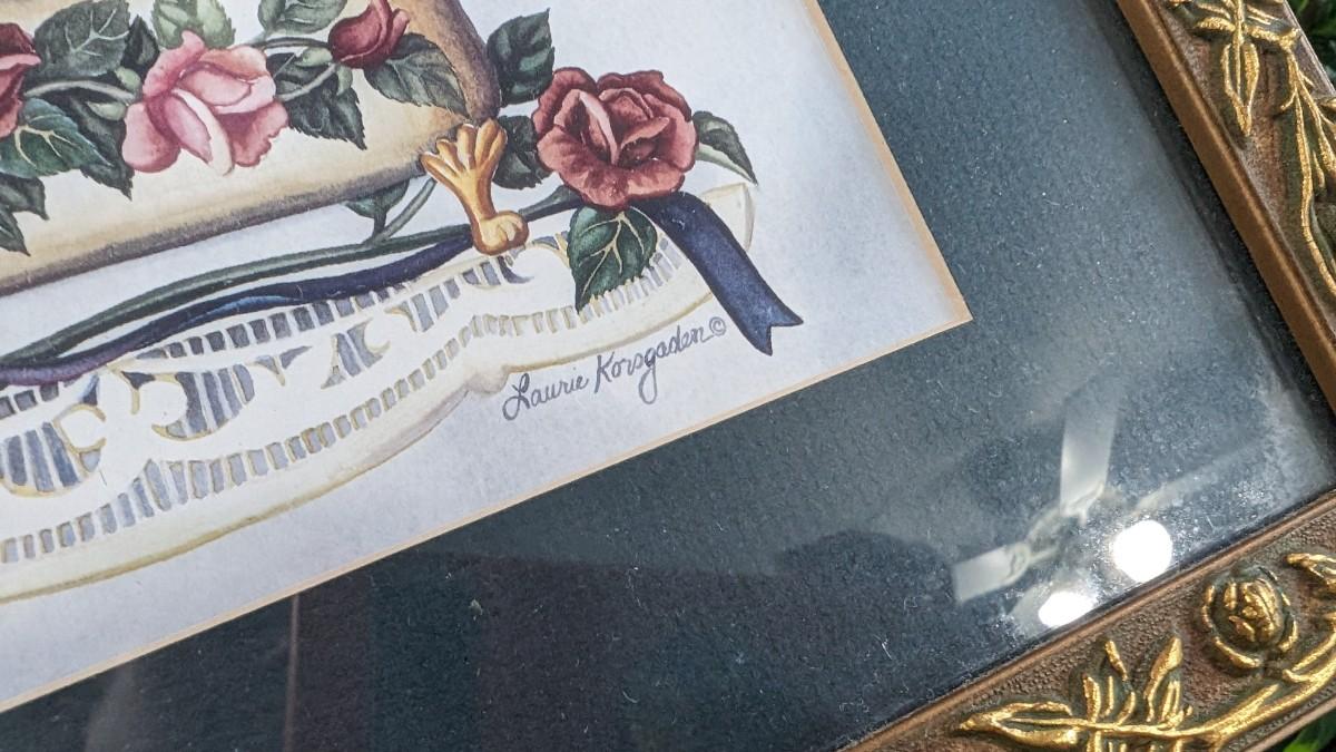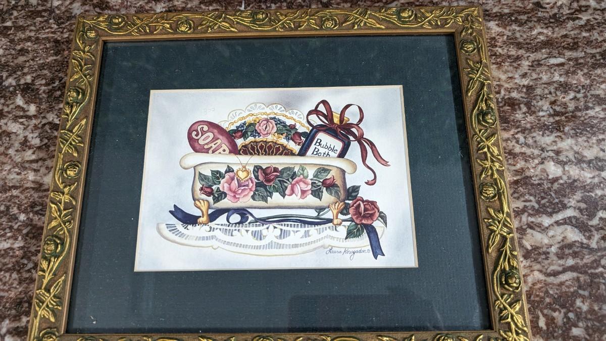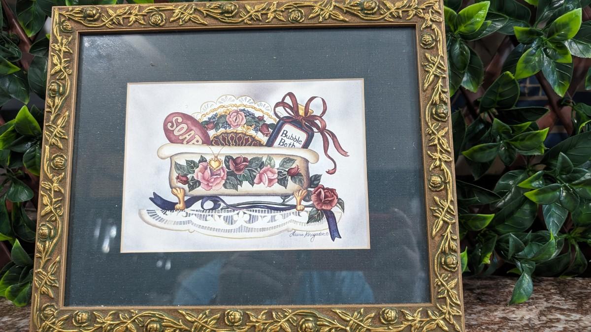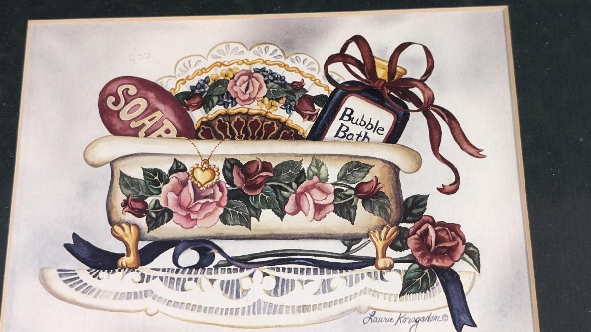 Framed Bathroom Art Soap Bubble Bath Antique Tub Roses Lace Doilies