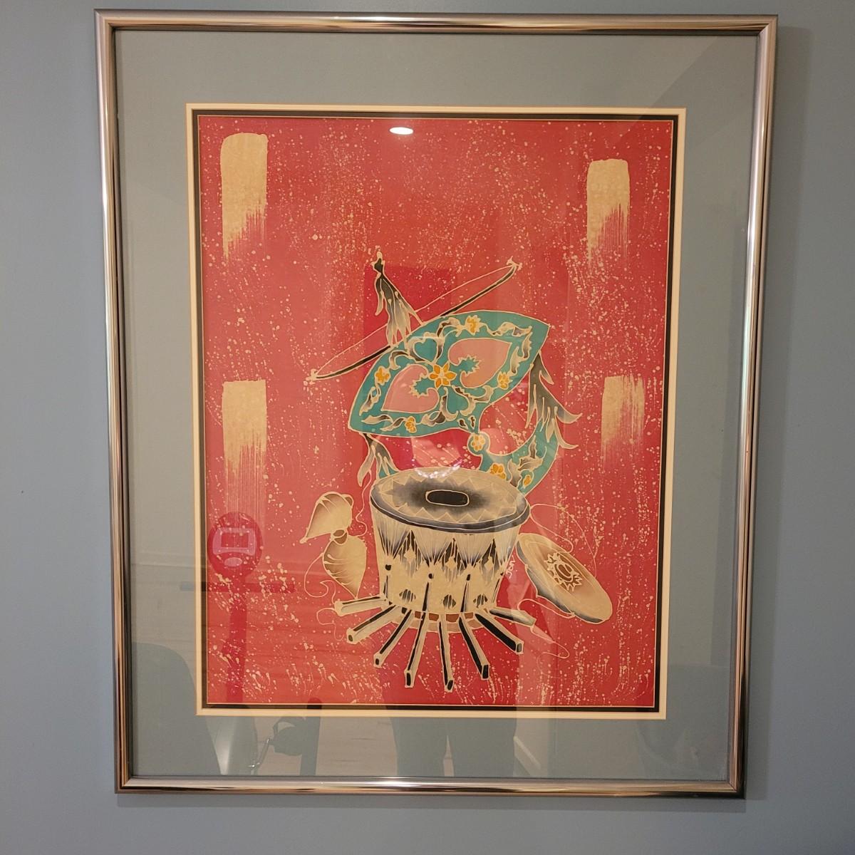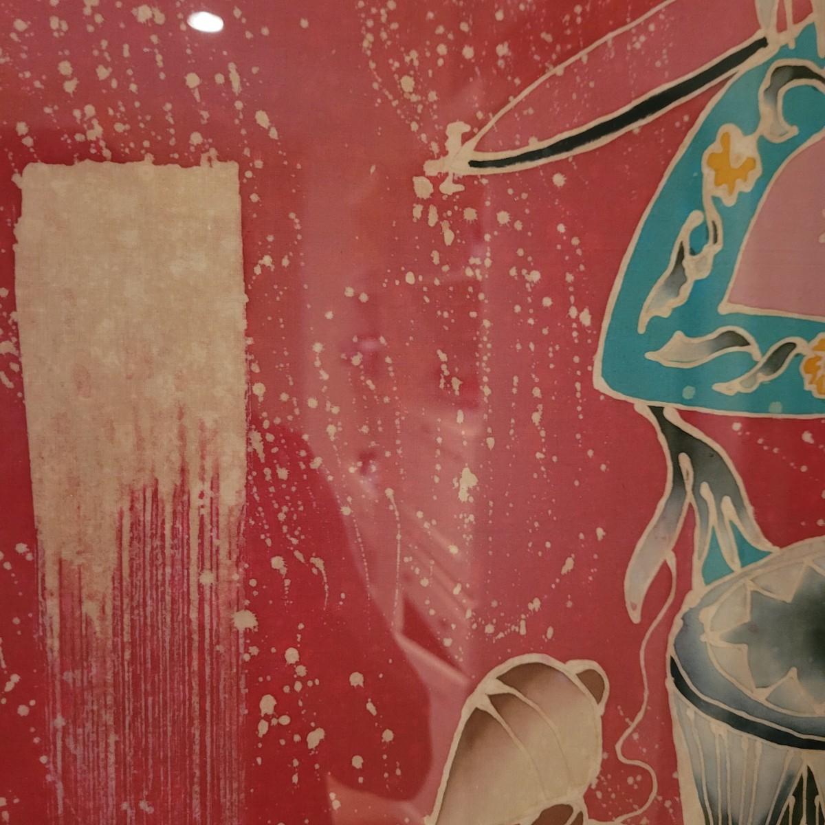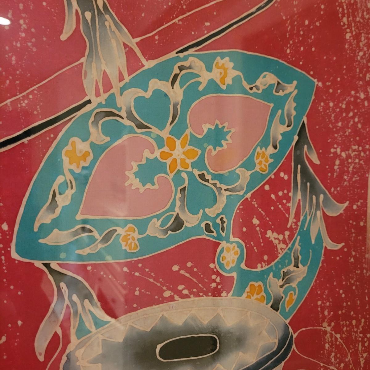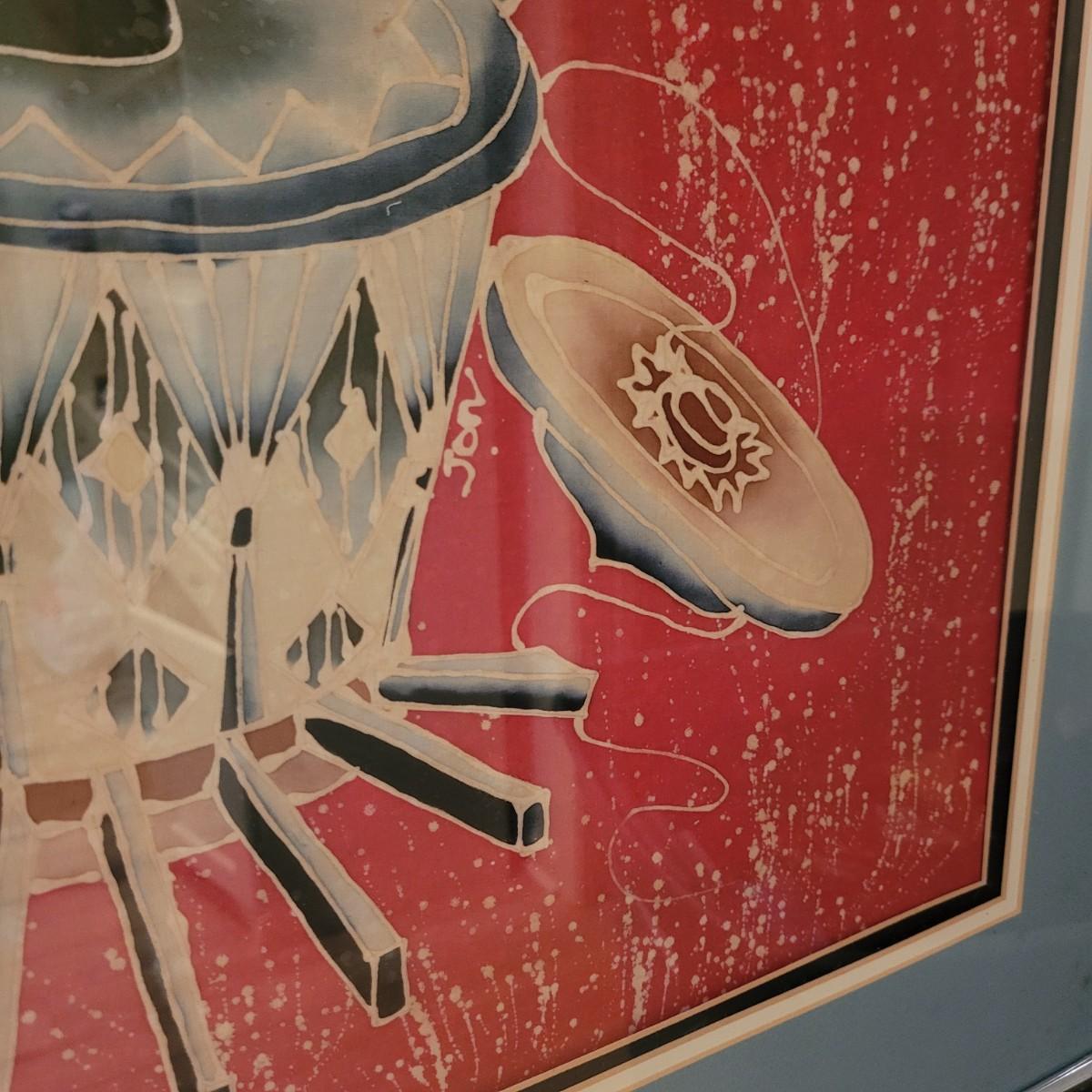 This bright and vivid batik print makes a statement with deep reds contrasting with turquoise, pink and bluish gray hues. Double matted. Metal frame has some scratches (see photos) and there is a small accumulation of dust on the glass. Measures approximately 30.5" x 36.5"H. Shipping available. Shipping art can be costly. We suggest contacting our preferred local shipping provider, Postage Express, with dimensions and getting an estimate before bidding: (828) 670-5501or postageexpress@yahoo.com.