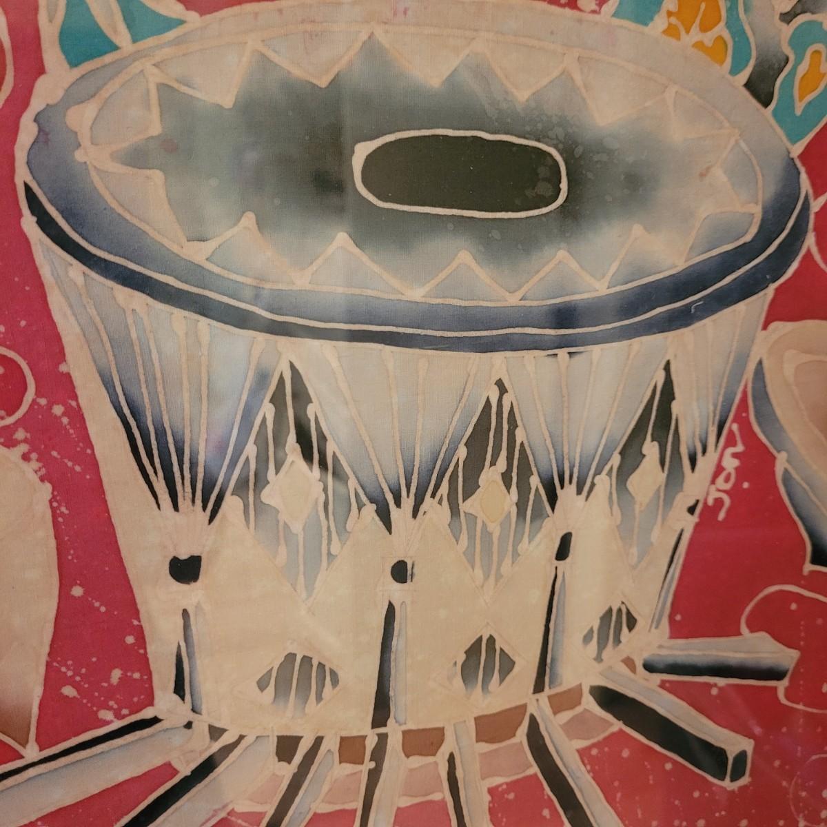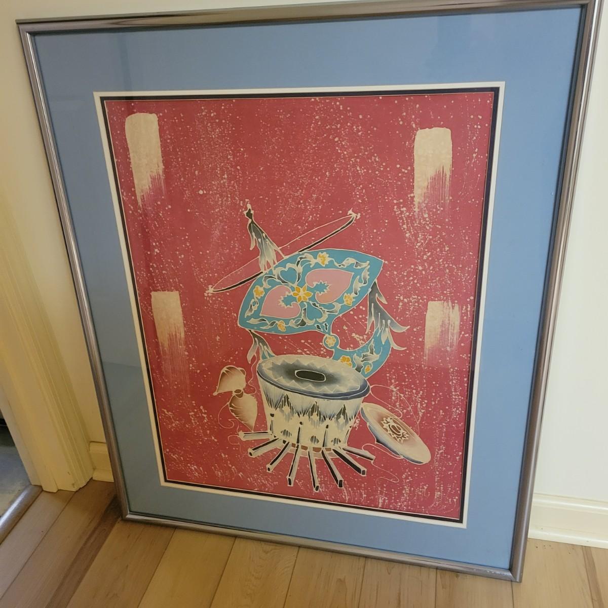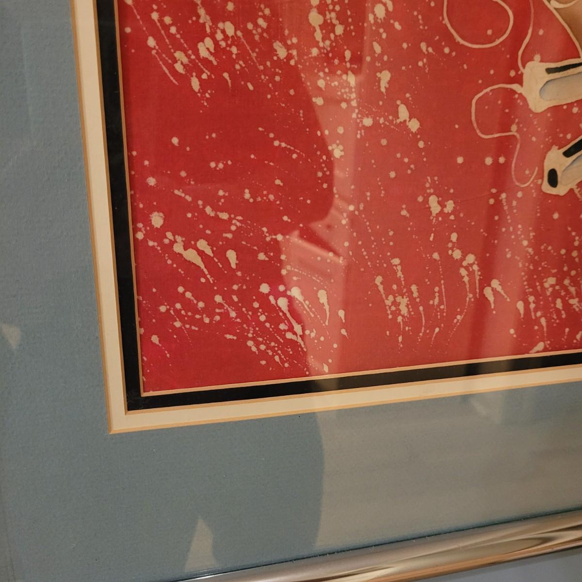 This bright and vivid batik print makes a statement with deep reds contrasting with turquoise, pink and bluish gray hues. Double matted. Metal frame has some scratches (see photos) and there is a small accumulation of dust on the glass. Measures approximately 30.5" x 36.5"H. Shipping available. Shipping art can be costly. We suggest contacting our preferred local shipping provider, Postage Express, with dimensions and getting an estimate before bidding: (828) 670-5501or postageexpress@yahoo.com.