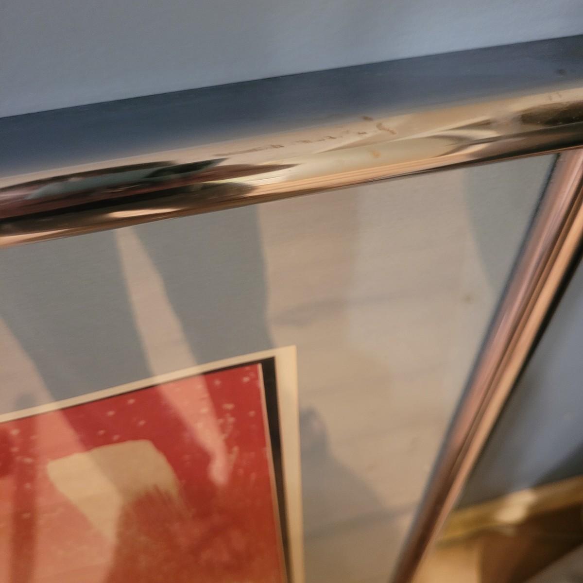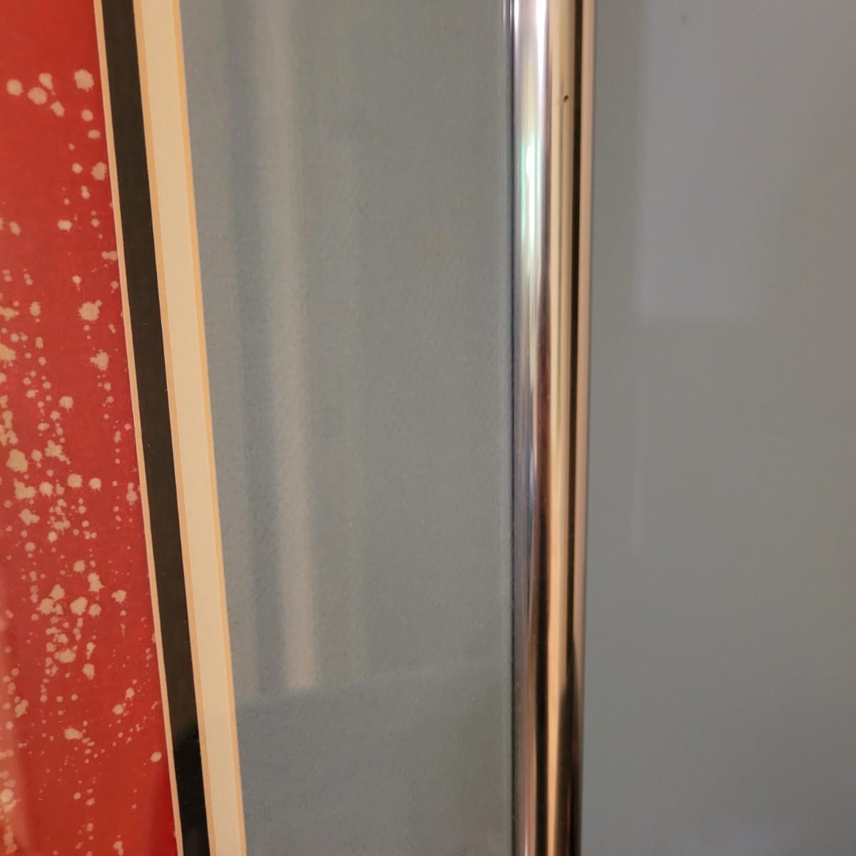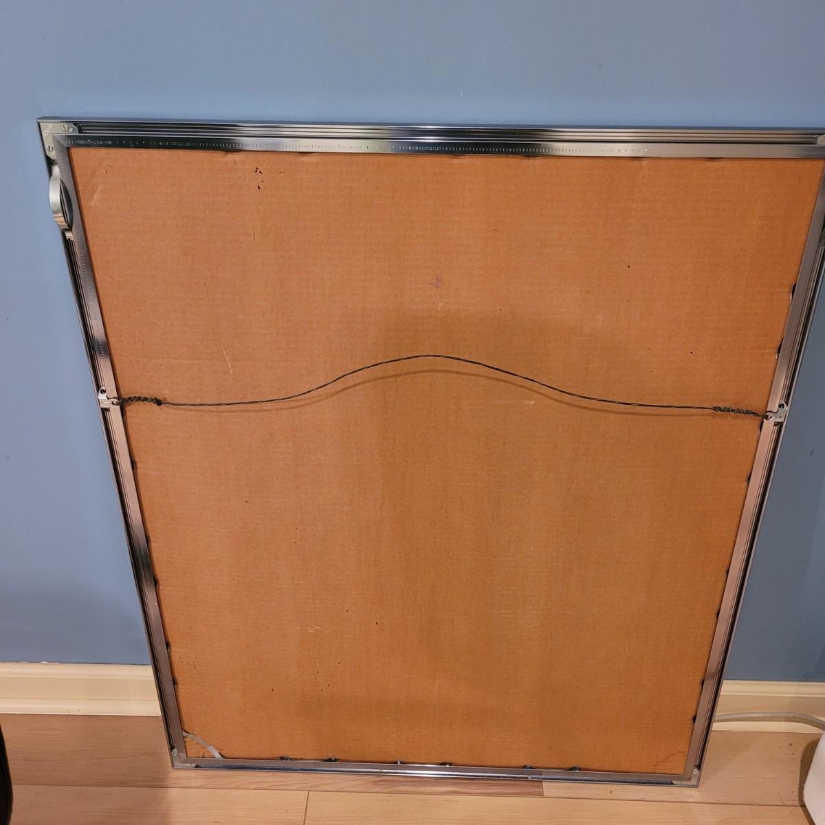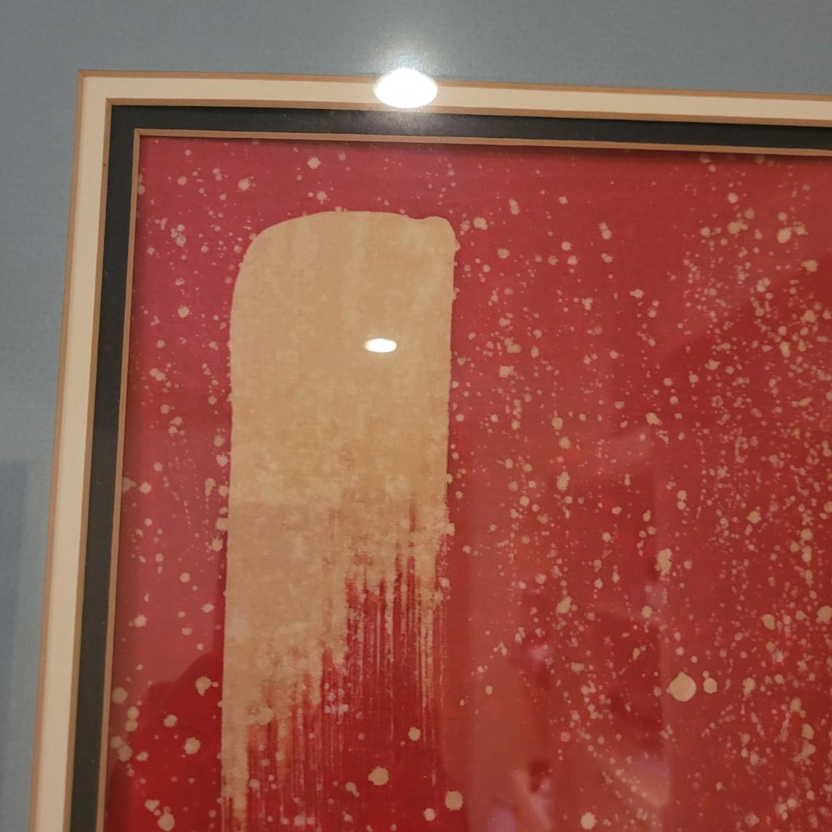 This bright and vivid batik print makes a statement with deep reds contrasting with turquoise, pink and bluish gray hues. Double matted. Metal frame has some scratches (see photos) and there is a small accumulation of dust on the glass. Measures approximately 30.5" x 36.5"H. Shipping available. Shipping art can be costly. We suggest contacting our preferred local shipping provider, Postage Express, with dimensions and getting an estimate before bidding: (828) 670-5501or postageexpress@yahoo.com.