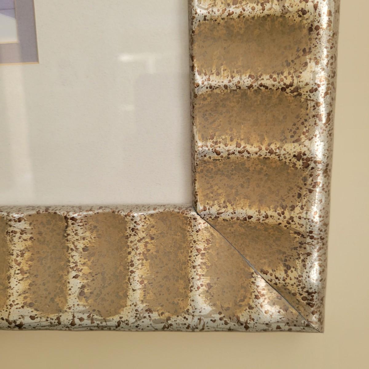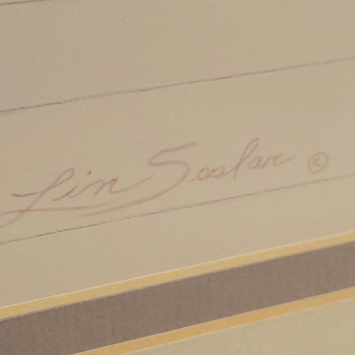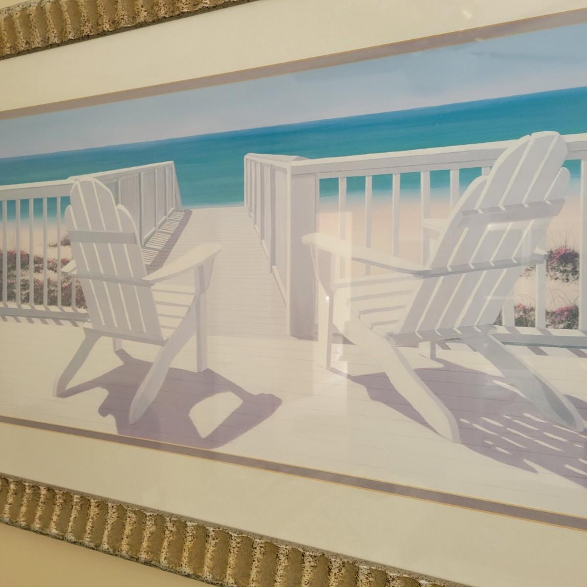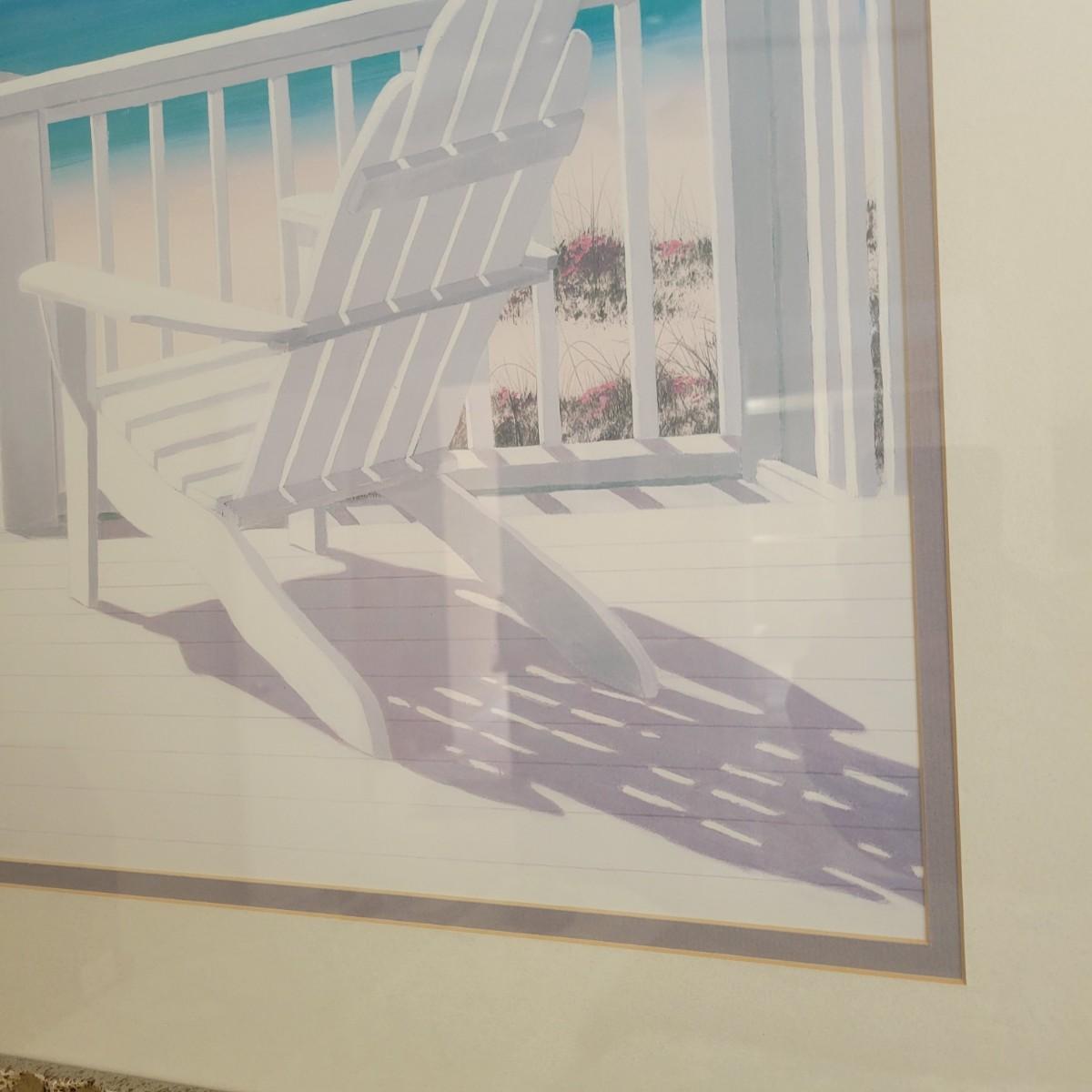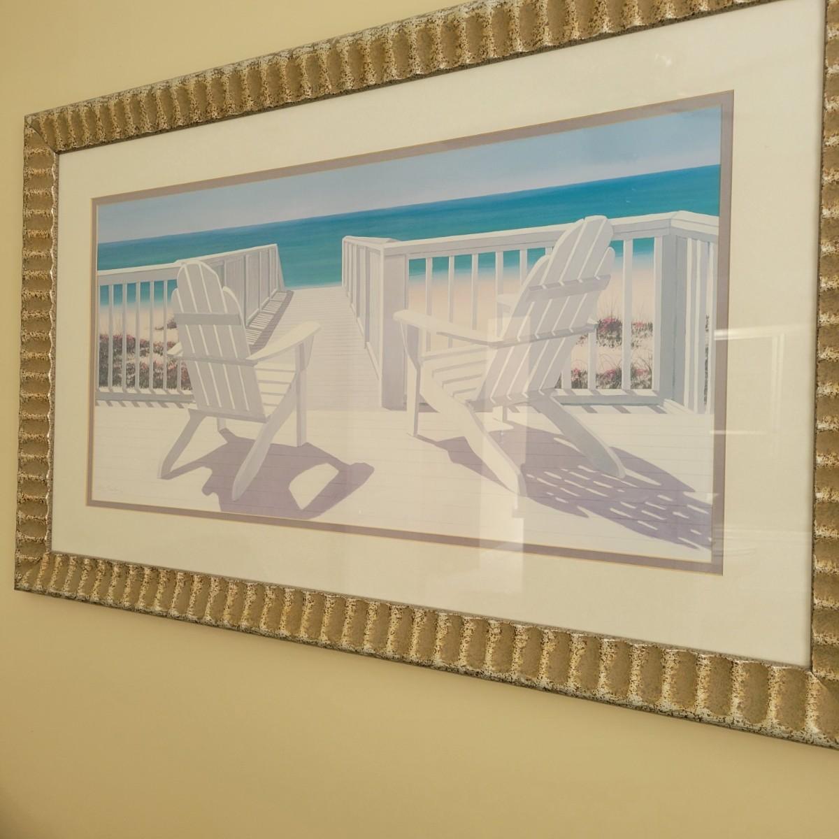 A framed beach print in good condition with no notable damage. This piece features a wooden, modern silver frame with a double mat. This print shows a signature that reads "Lin Seslar". The frame measures approximately 42.5" x 26.5" x 1.5". Shipping available. Shipping art can be costly. We suggest calling our local UPS with dimensions and getting a quote before bidding: (828) 252-6930.