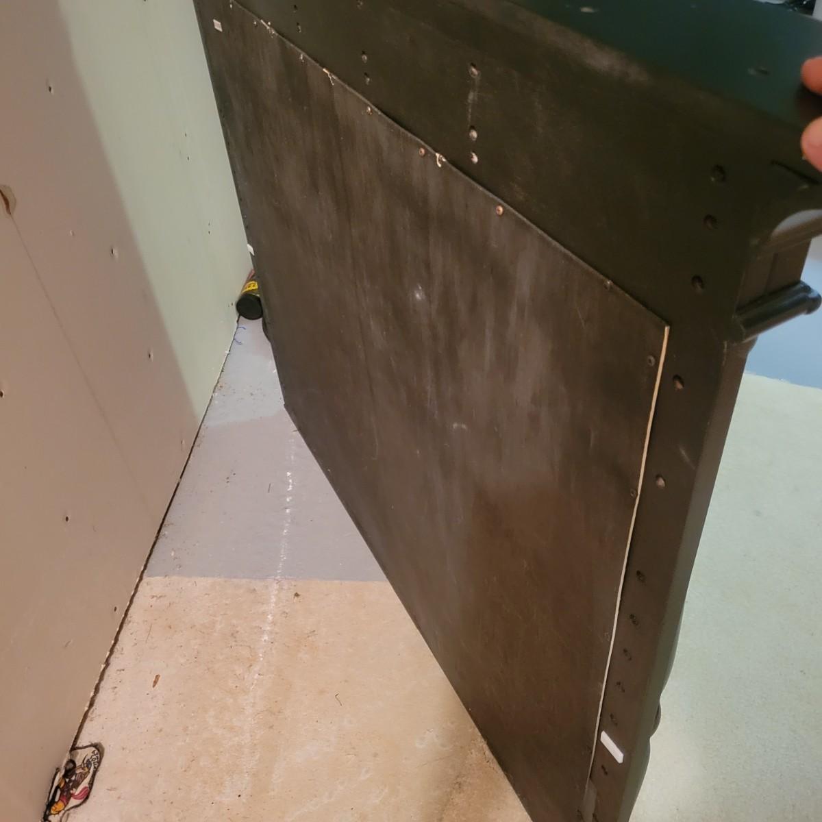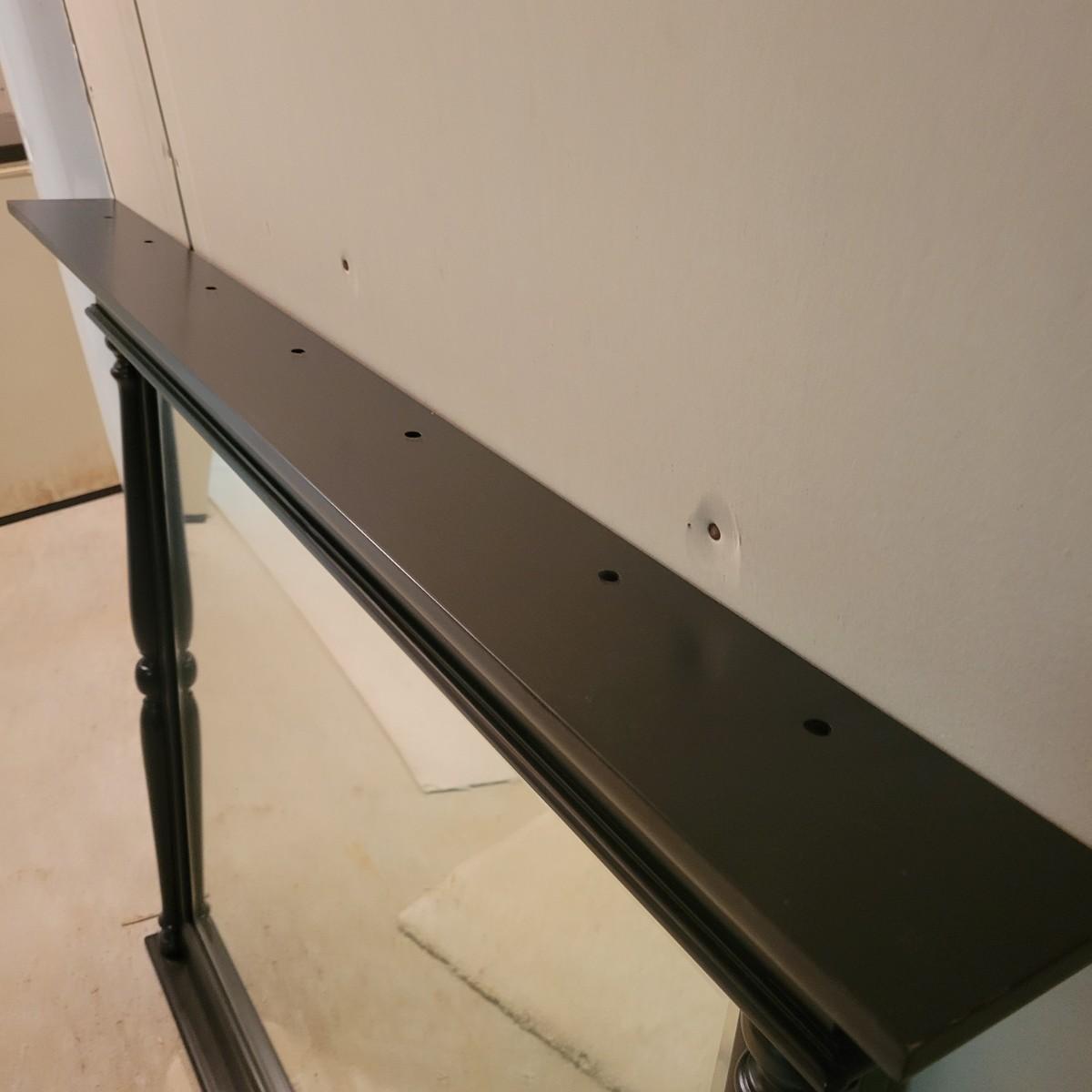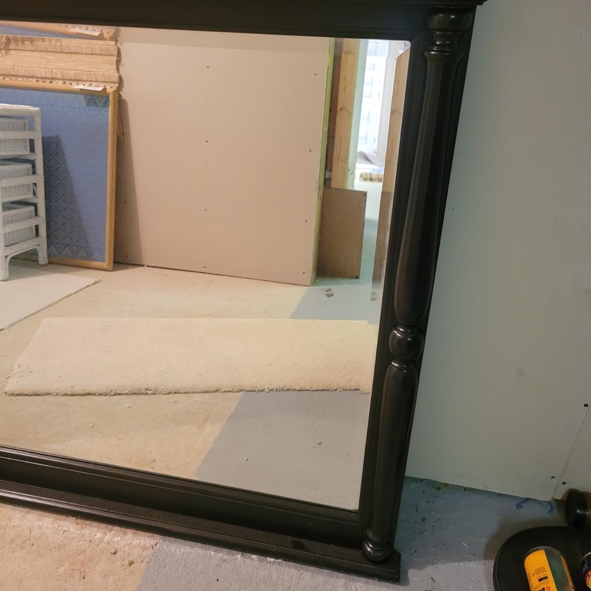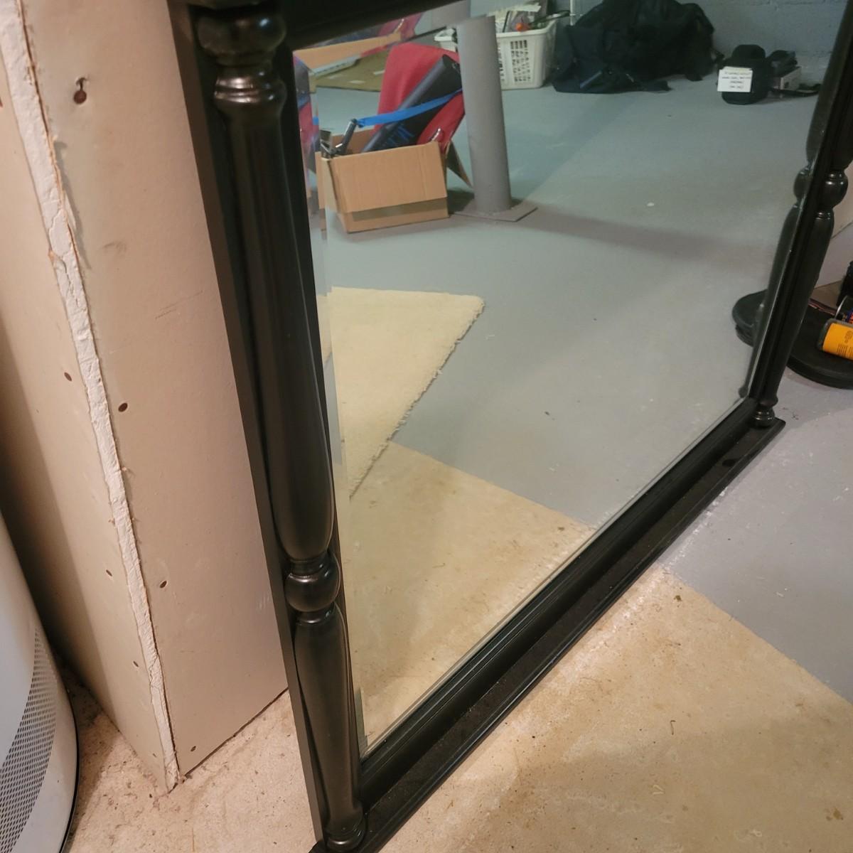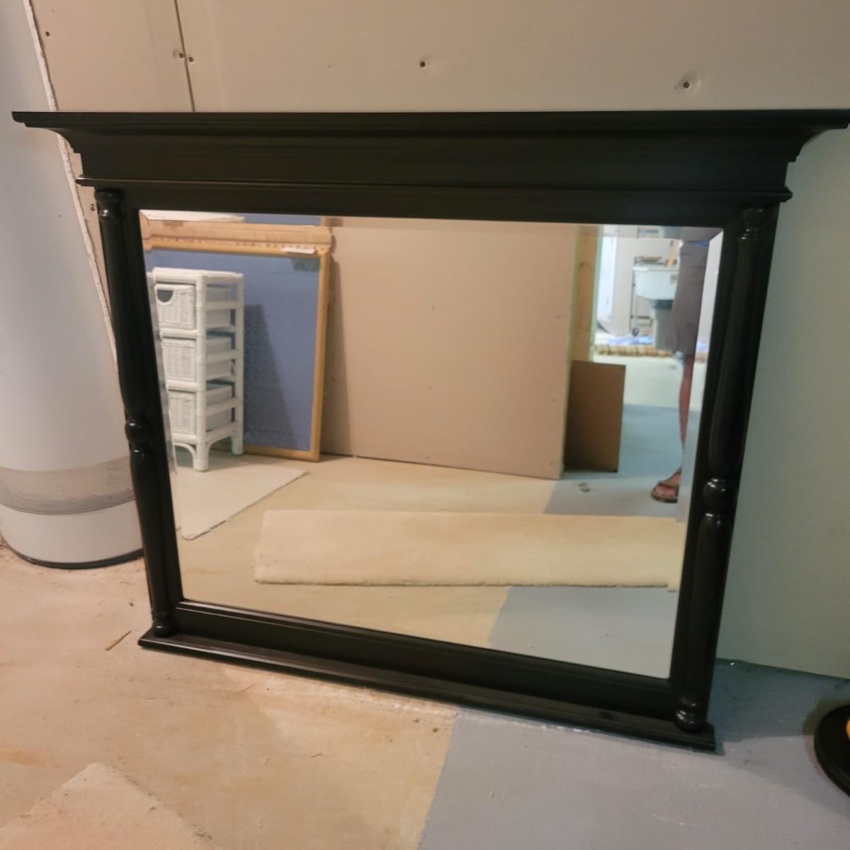 A large beveled mirror designed to install above a dresser that is in this auction. It has a .75" bevel encased in a wooden black finished frame that matches the dresser. This mirror does not come with mounting or hanging hardware. Measures approximately 49" x 4.5" x 41"H. Local pickup only