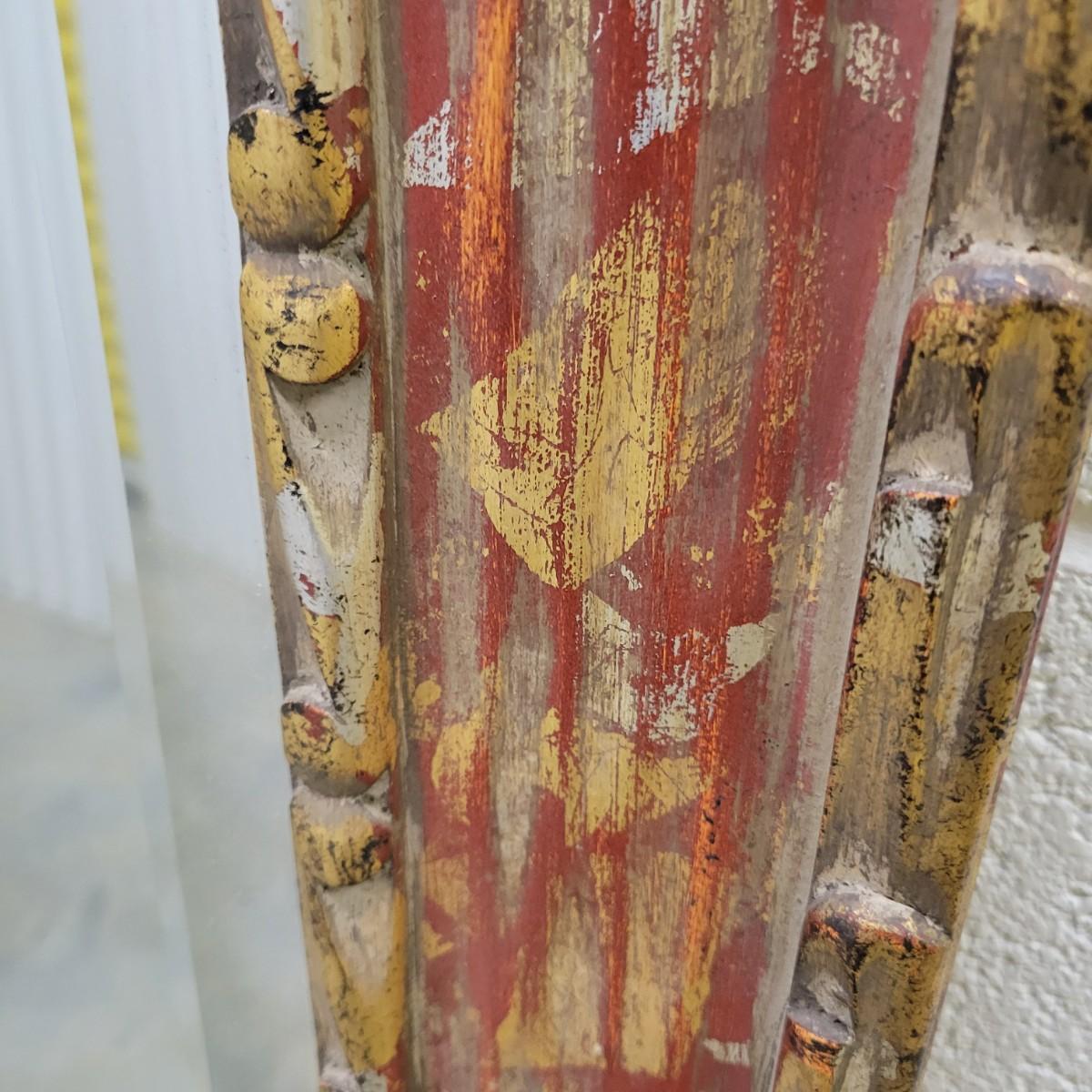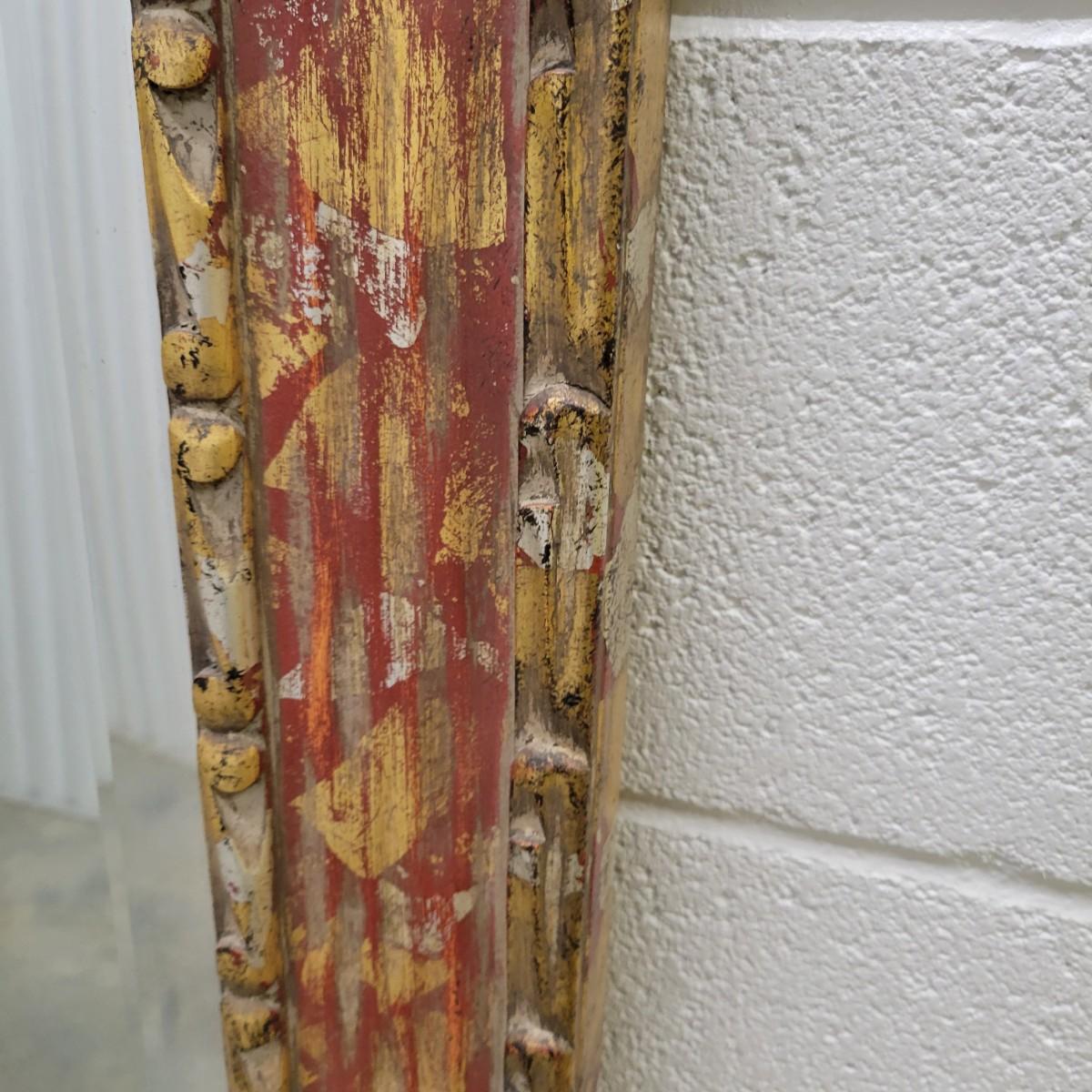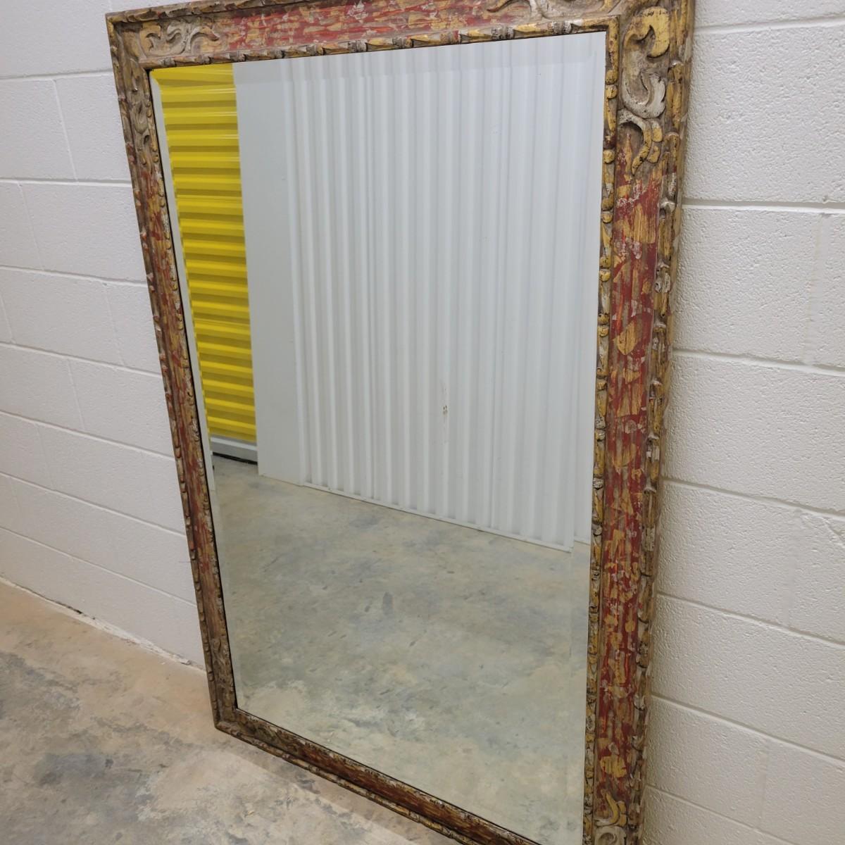 A large beveled mirror in a carved gold frame with silver and red highlights in good condition. Currently setup to be hung horizontal, but could easily be vertical. Bevel measures 1' and the frame measures approximately 53.5" x 40" x 1.5" Local pickup only
