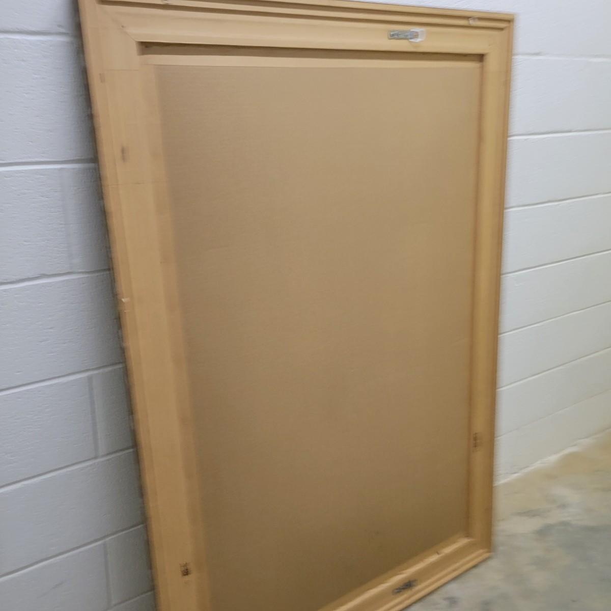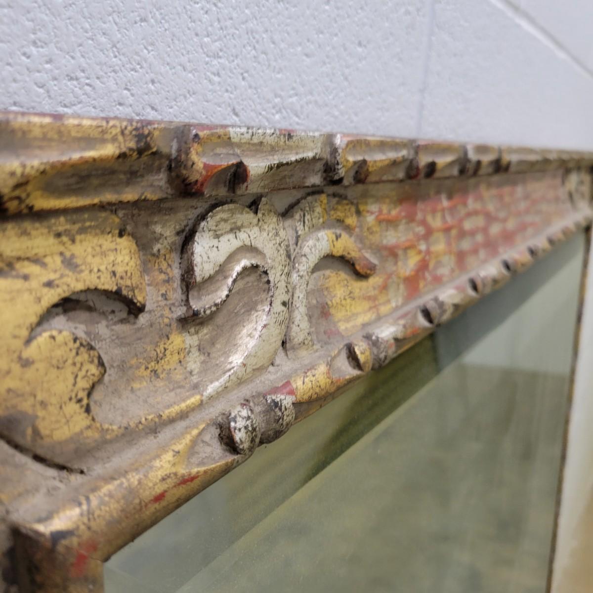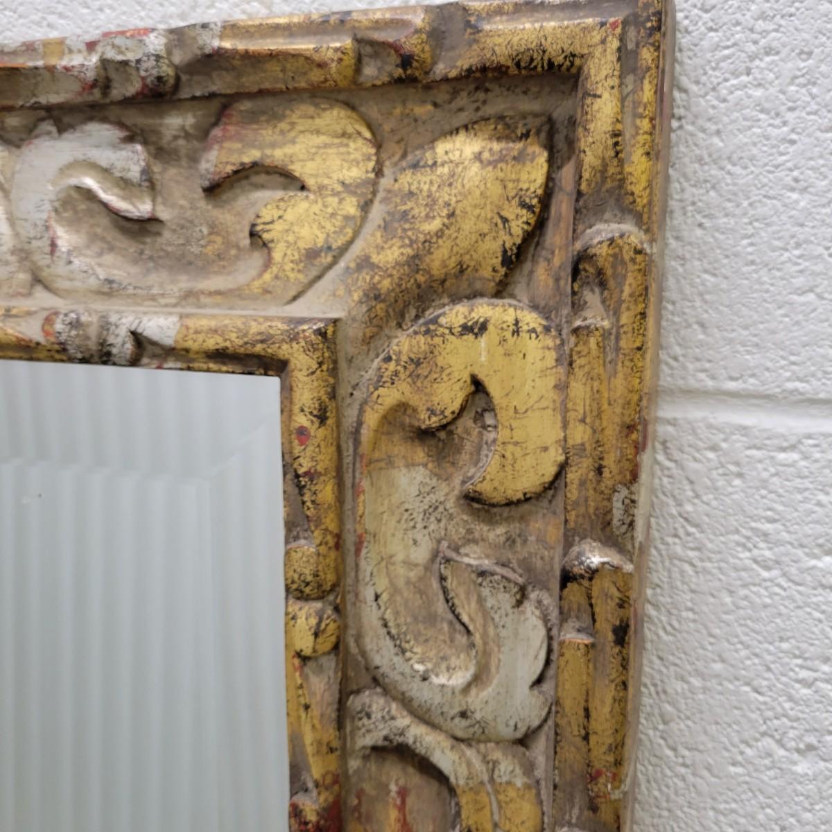 A large beveled mirror in a carved gold frame with silver and red highlights in good condition. Currently setup to be hung horizontal, but could easily be vertical. Bevel measures 1' and the frame measures approximately 53.5" x 40" x 1.5" Local pickup only