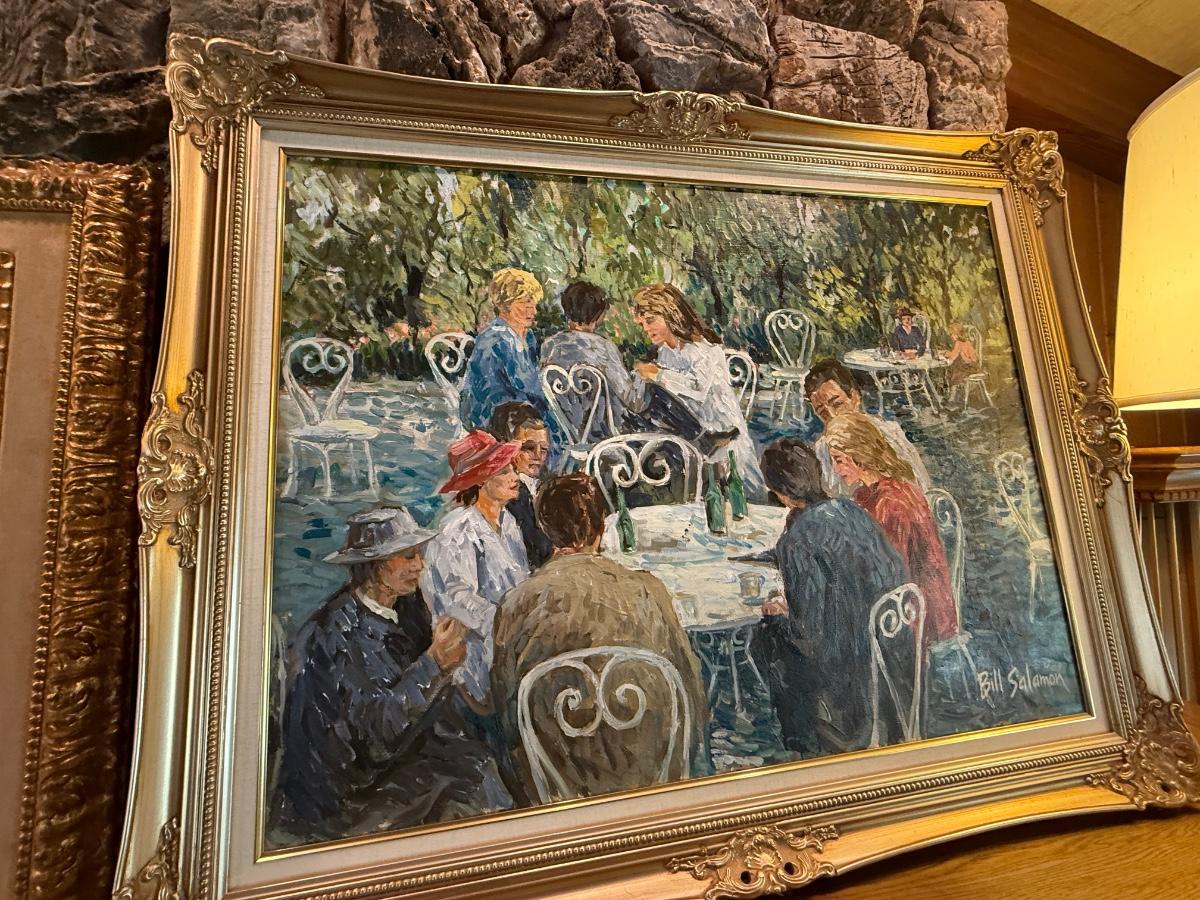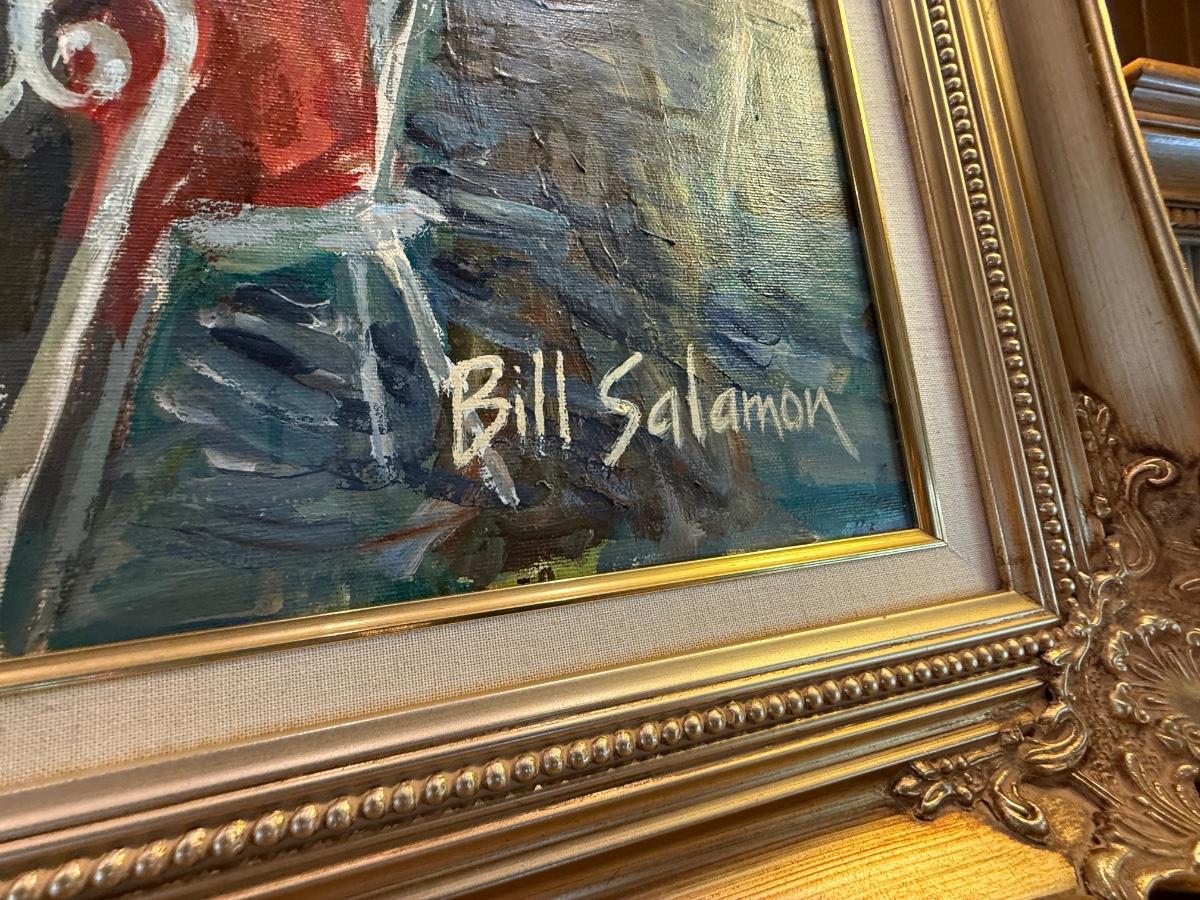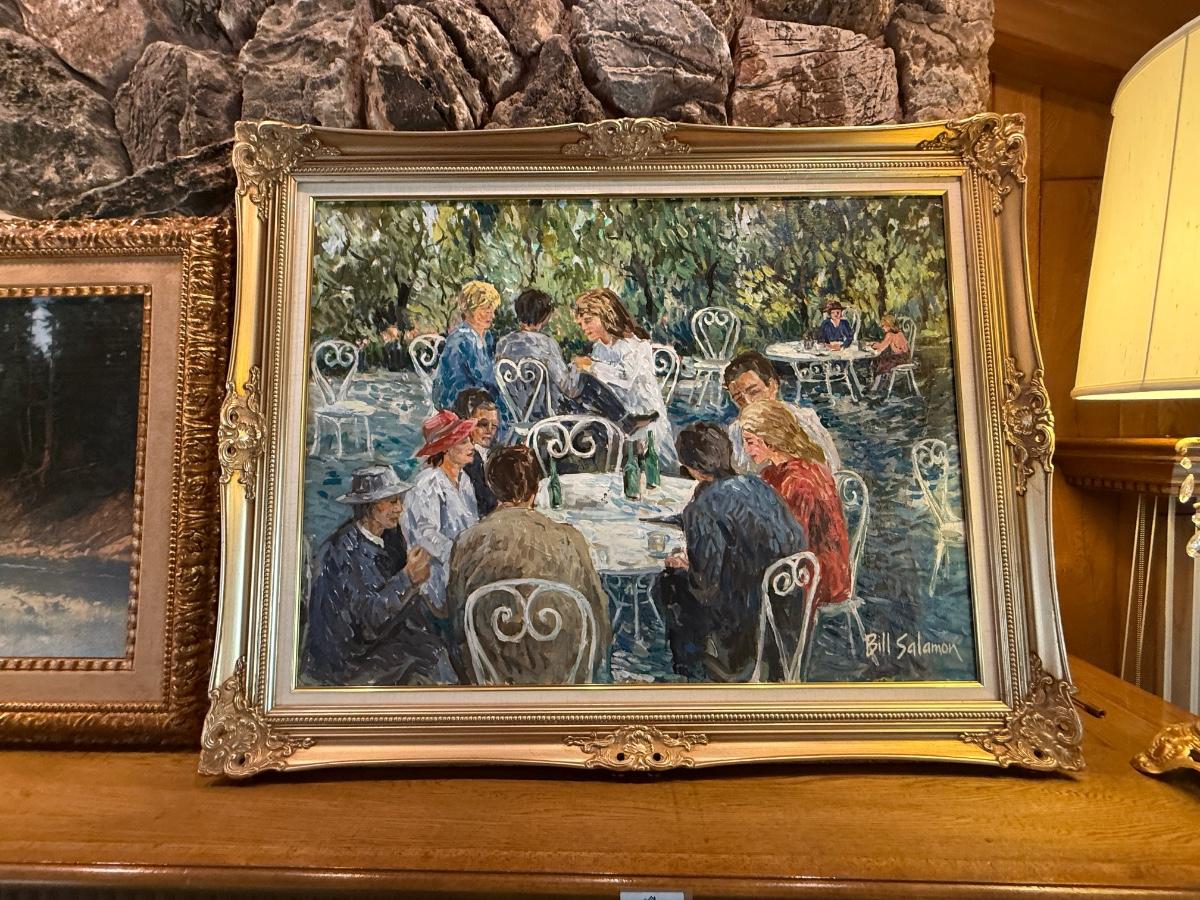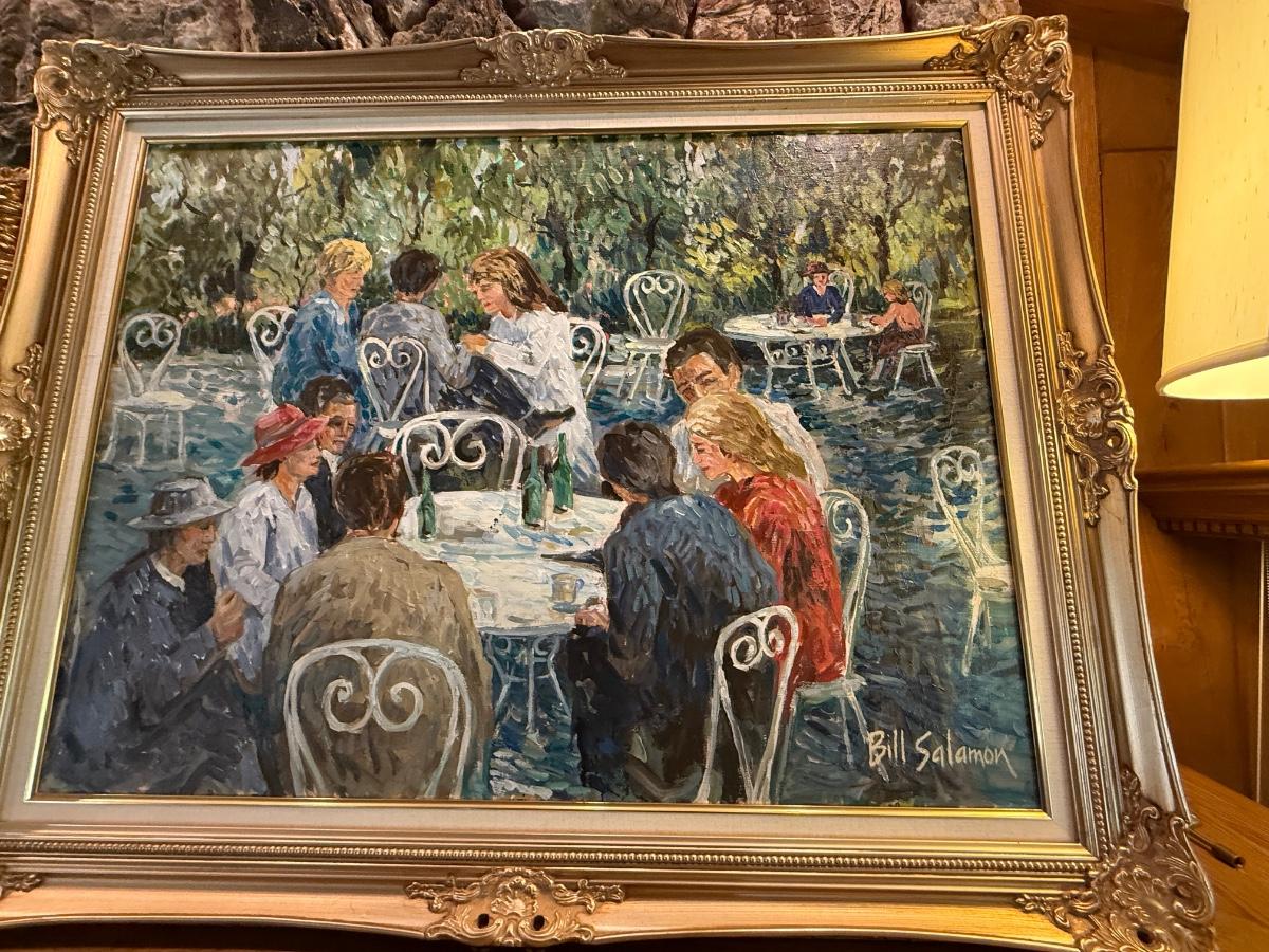 Bill Salamon 1927 - 2011 artist original oil painting measures Approx. 48” wide by 38” tall in gold ornate frame of outdoor cafe scene.