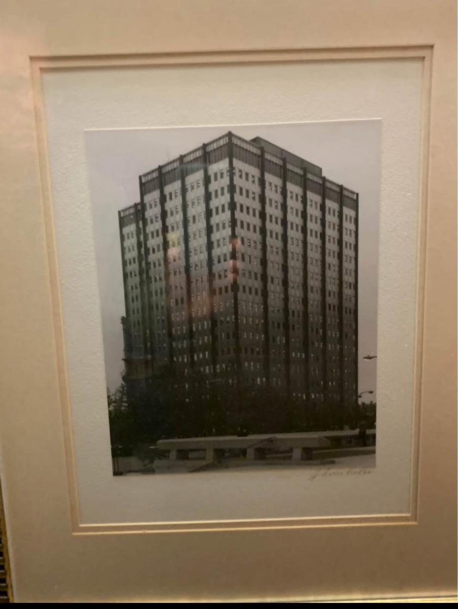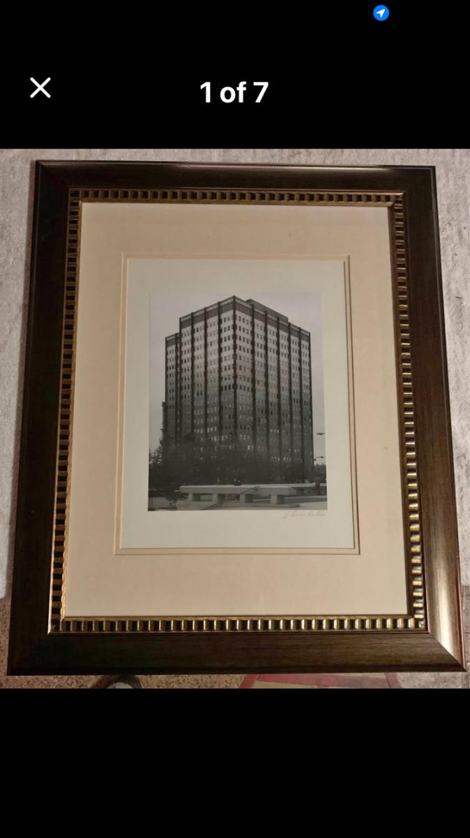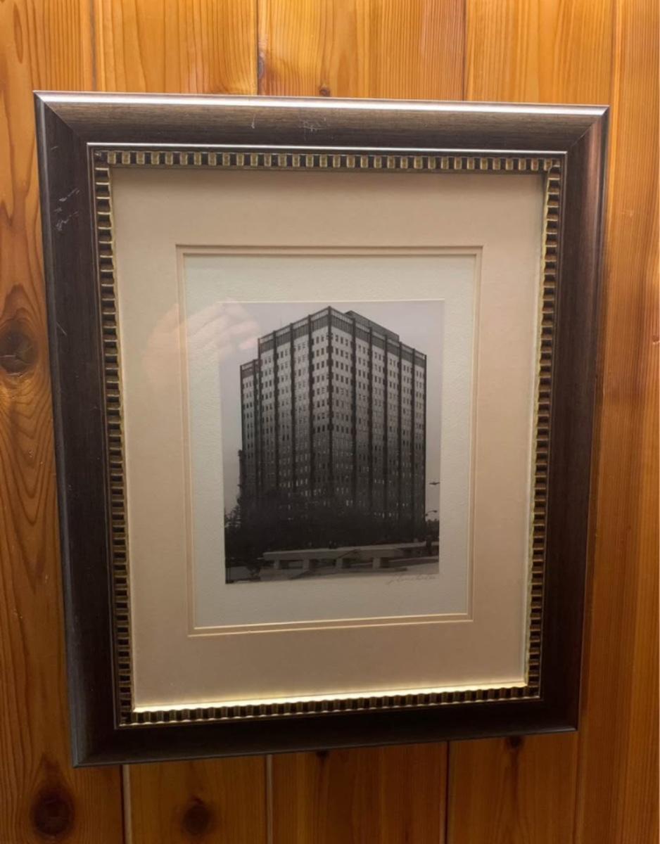 Striking black-and-white architectural photograph framed in a modern dark wood frame with gold beaded detail. Soft neutral matting adds a clean, contemporary look that works well in offices, hallways, apartments, or minimalist décor. Ready to hang and sized perfectly for small wall spaces at 18×22.