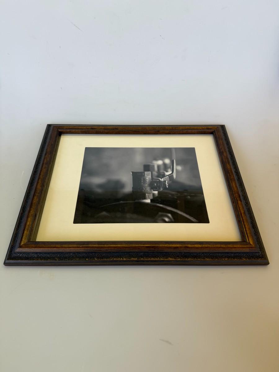 Professionally framed black & white photo with rustic wooden frame and cream matting.
