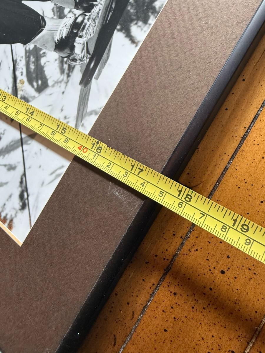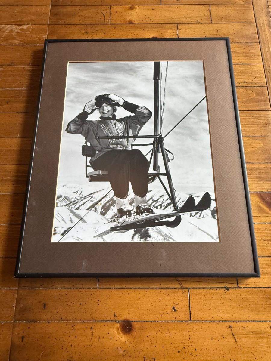 Vintage-style black and white photo of a woman on a ski lift, framed with brown matte.