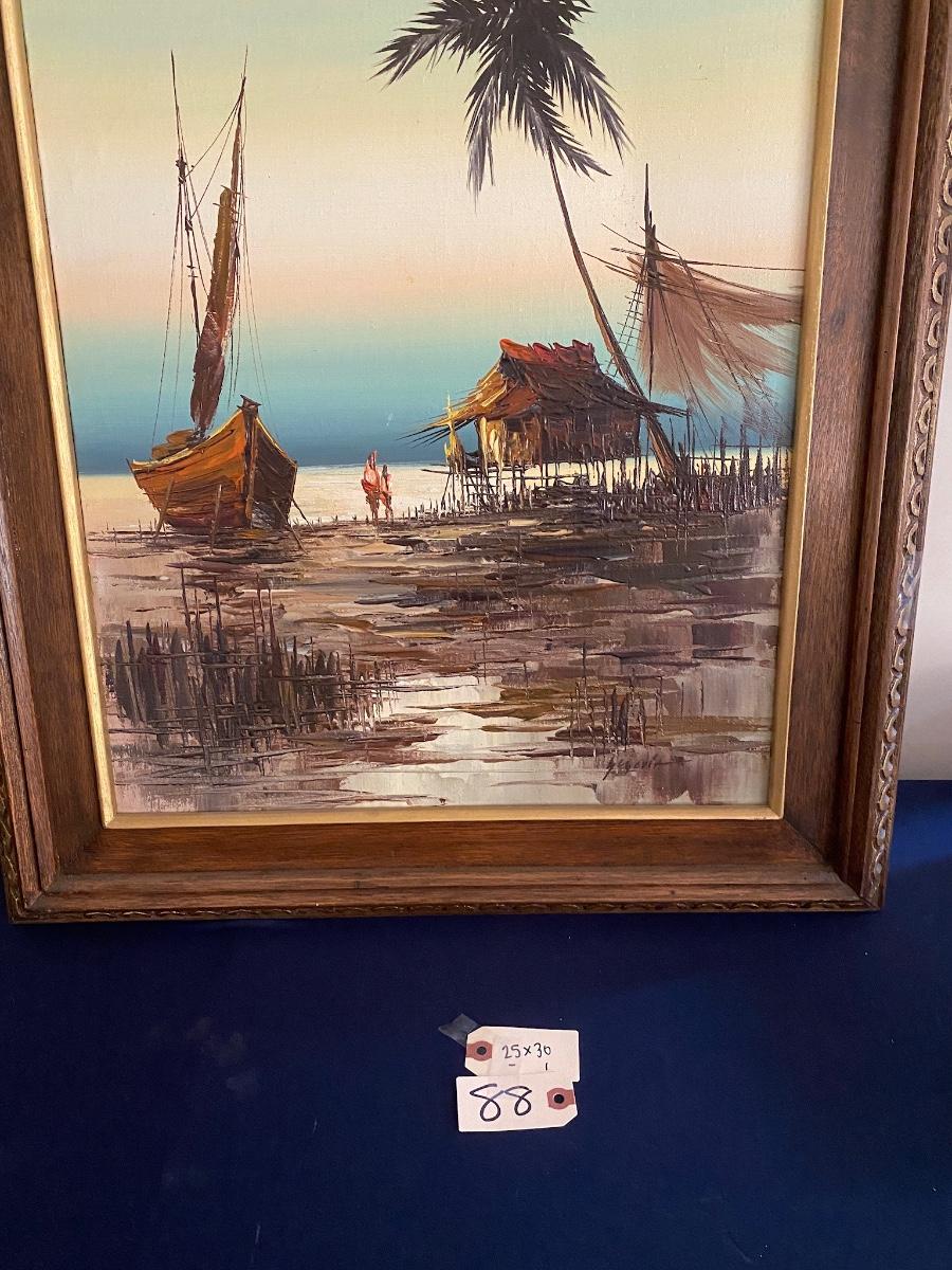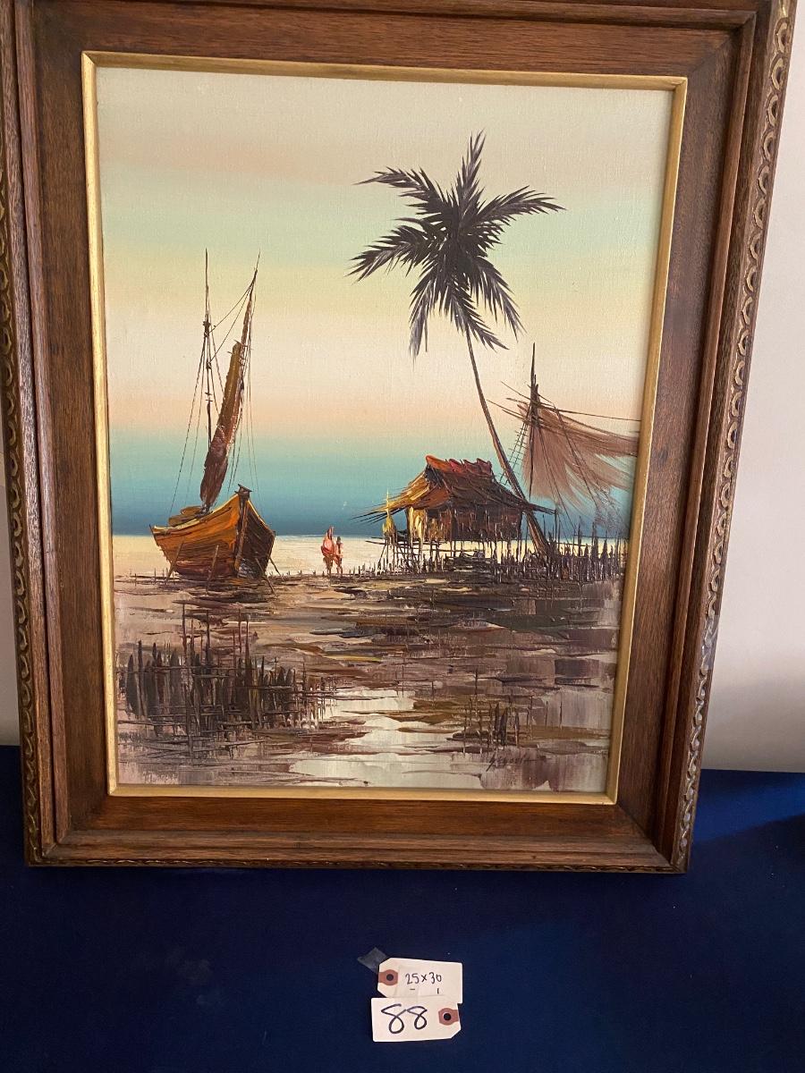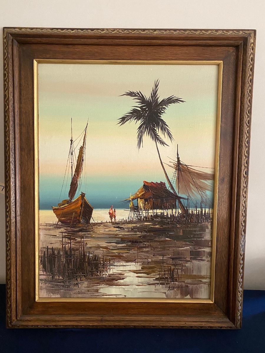 Framed Boat Scene Print, Signed, 25x30