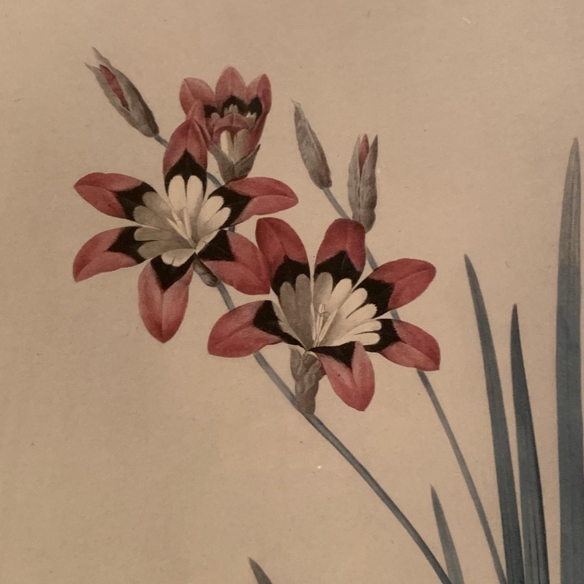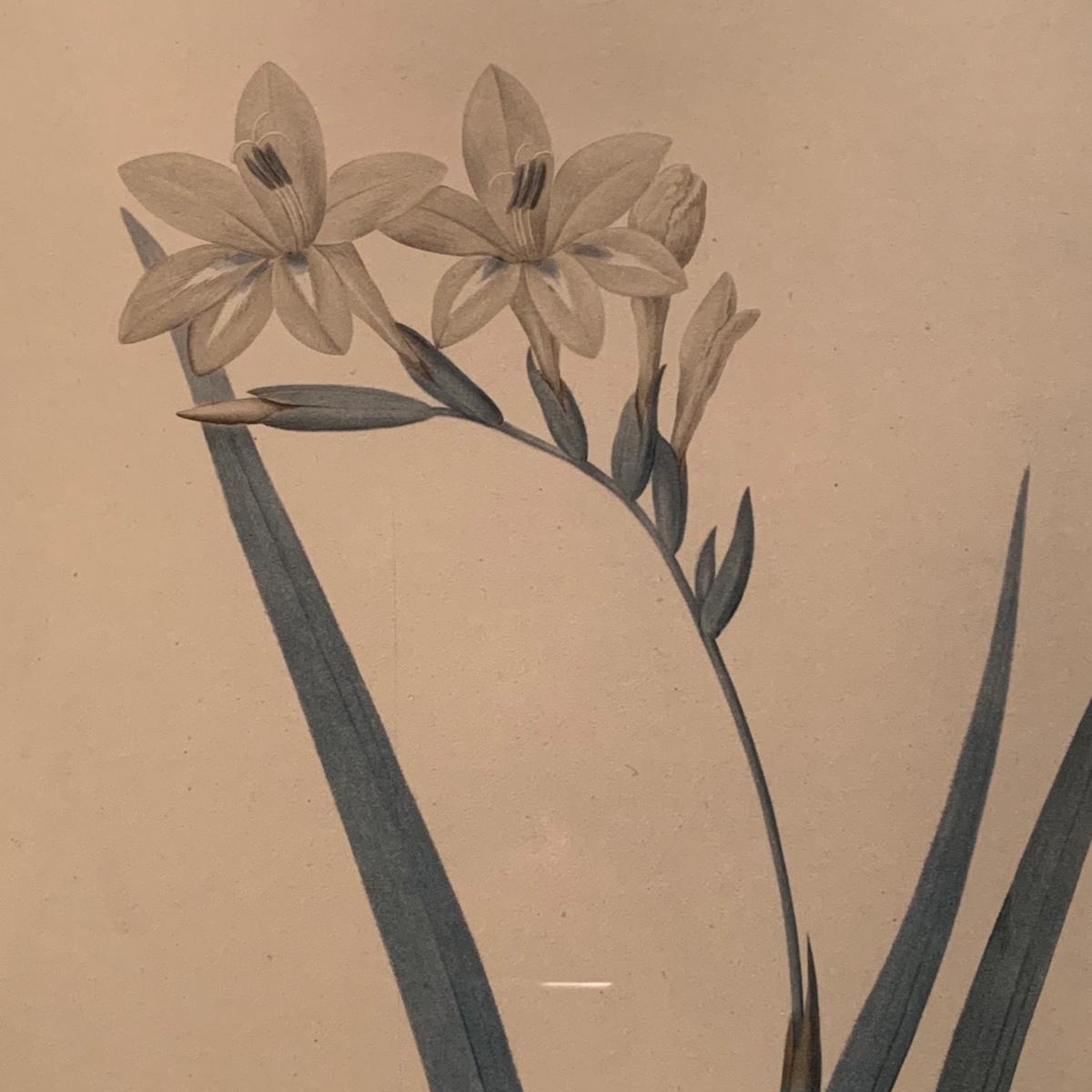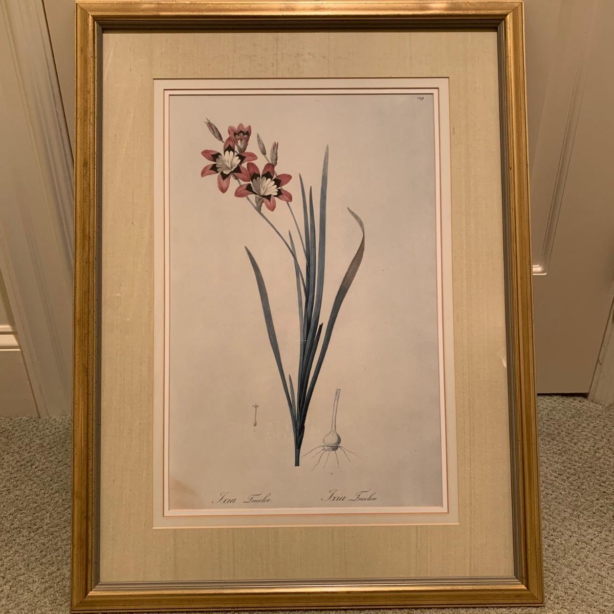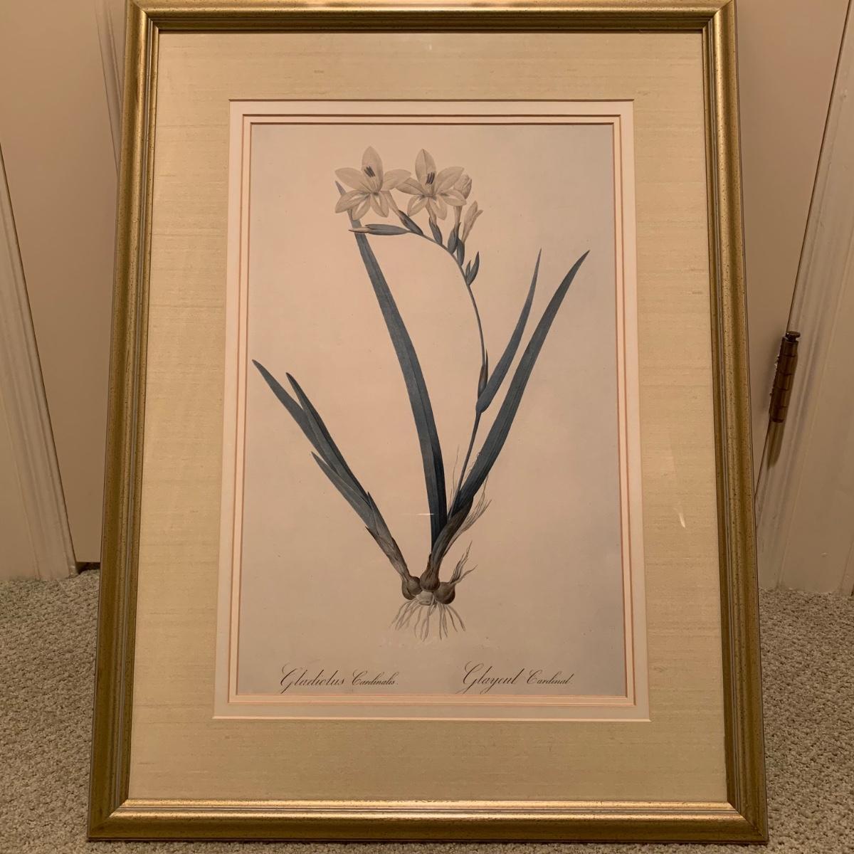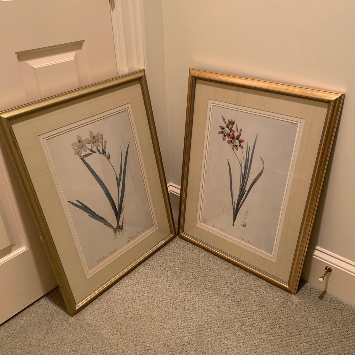 Two framed botanical prints behind glass. Prints are matted in engineered wood frame with gold paint finish. Each piece measures, 22” x 29”.