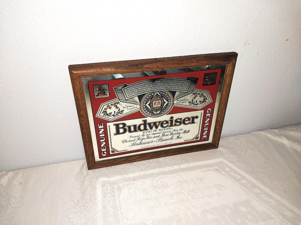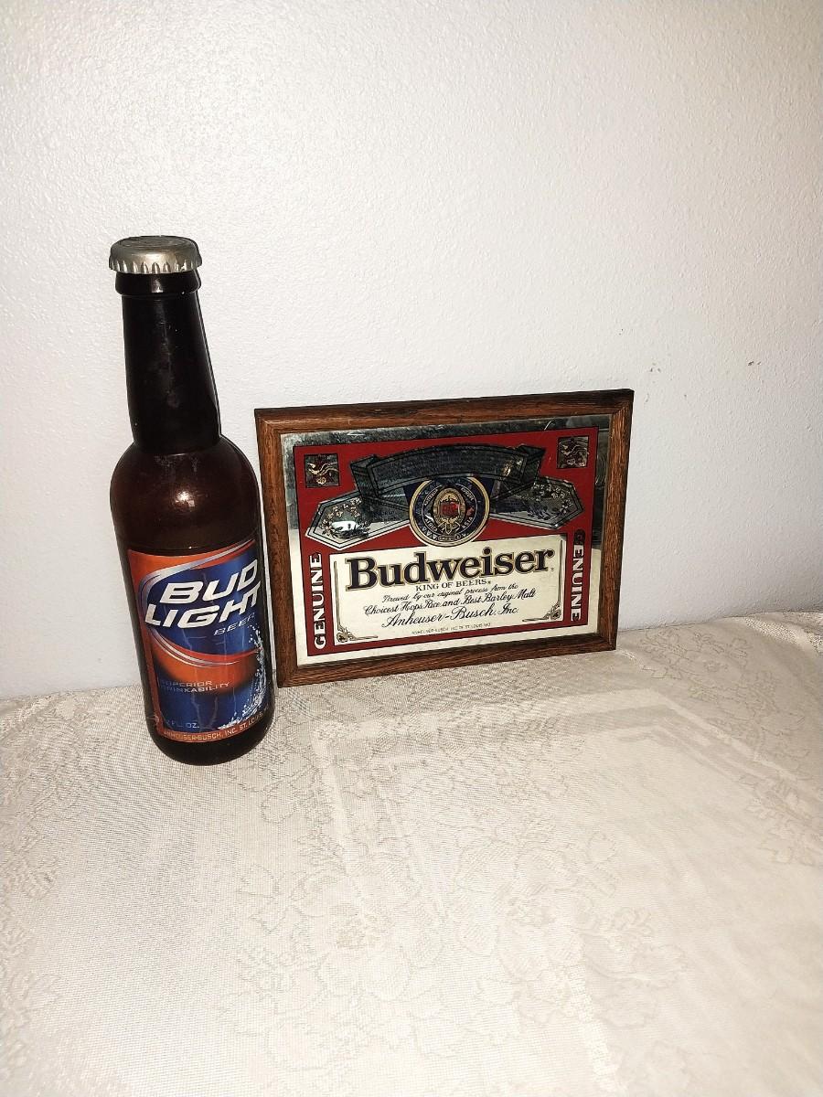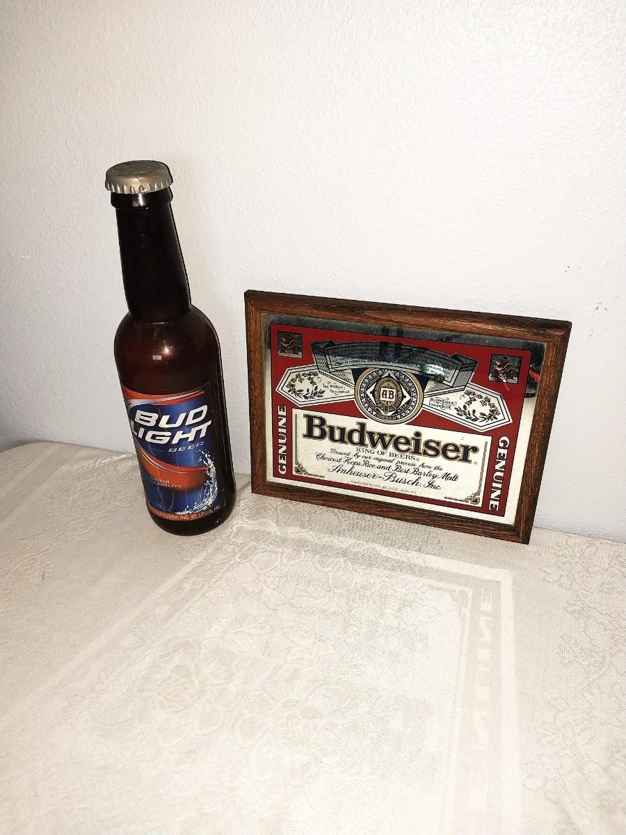 FRAMED BUDWEISER MIRROR AND PLASTIC BUDWEISER STORAGE BOTTLE