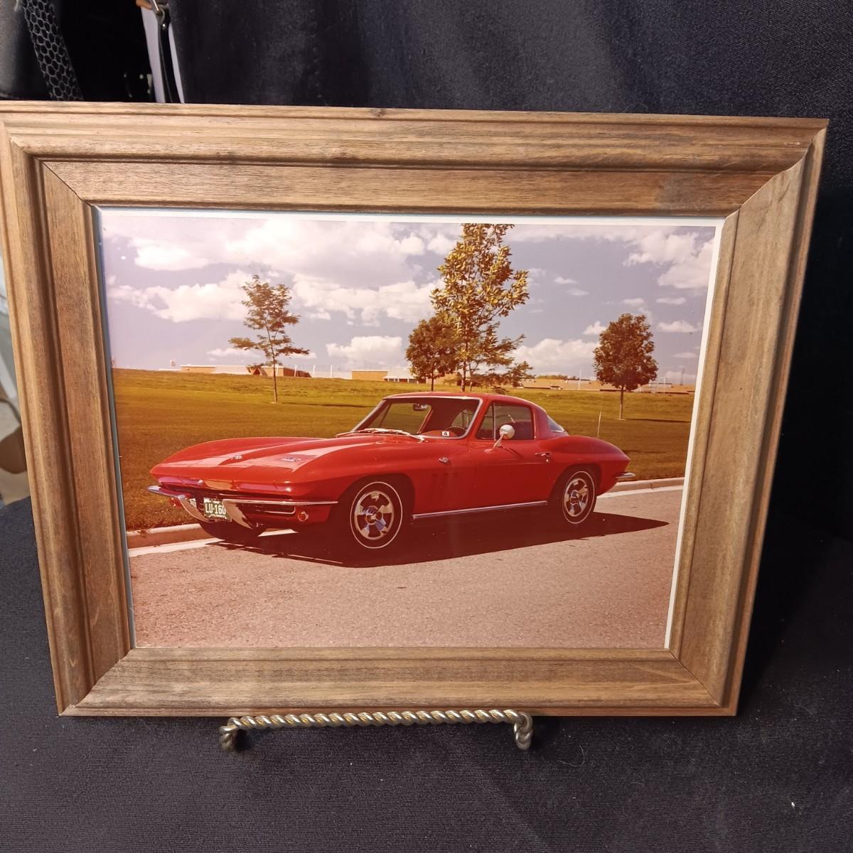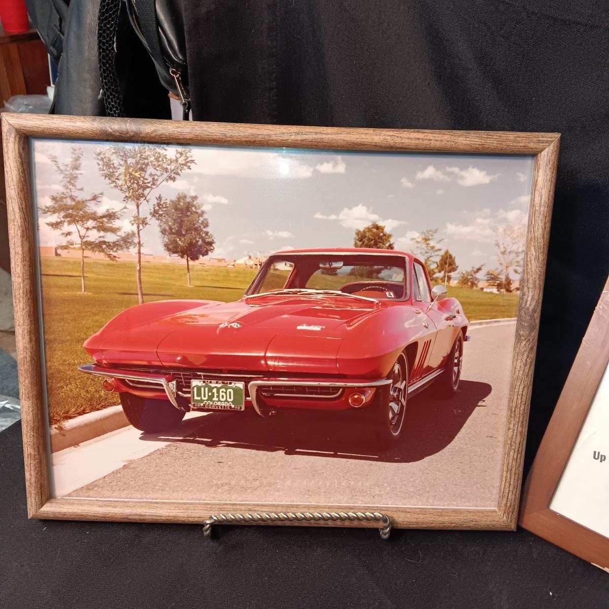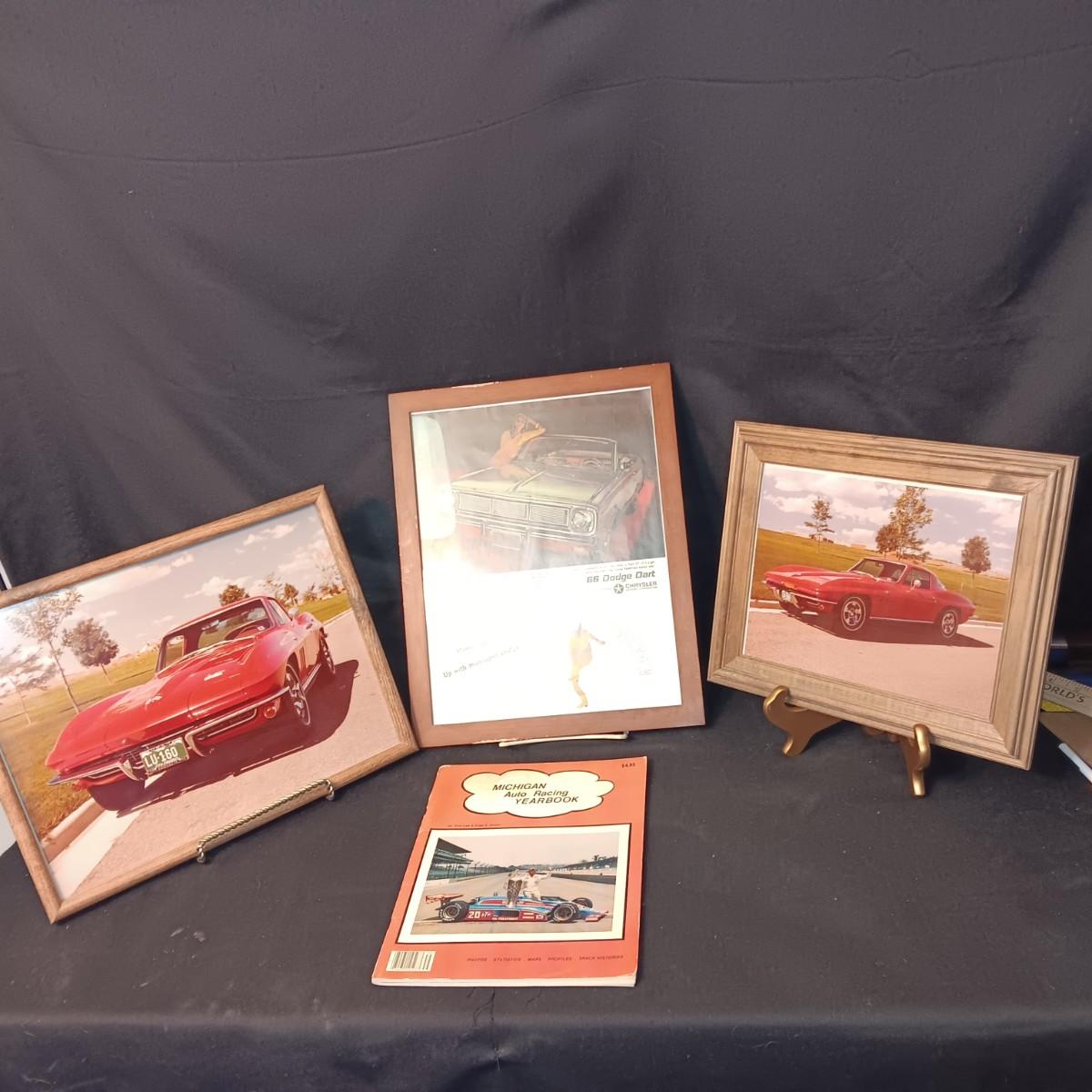 FRAMED CAR ADVERTISEMENT, 2 PHOTOS OF A CORVETTE AND A AUTO RACING YEARBOOK