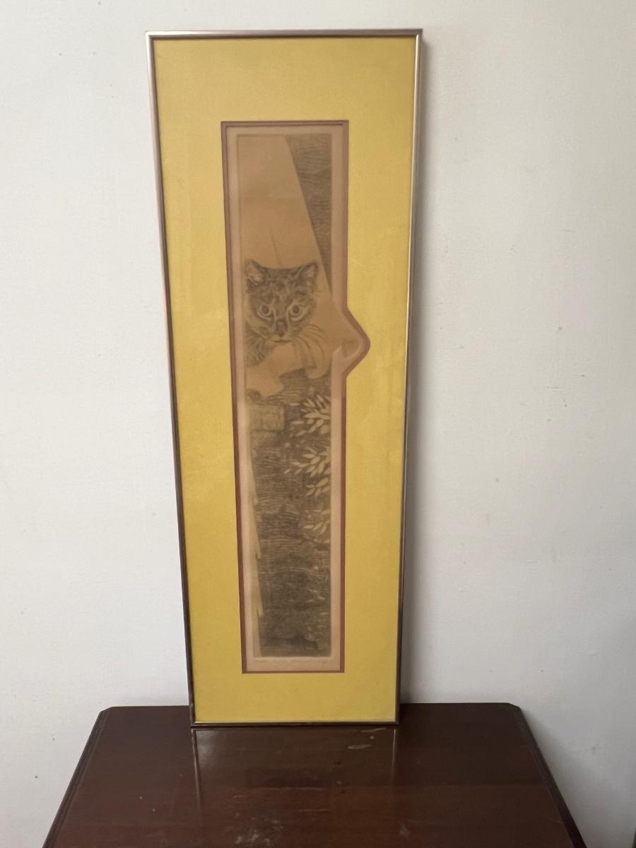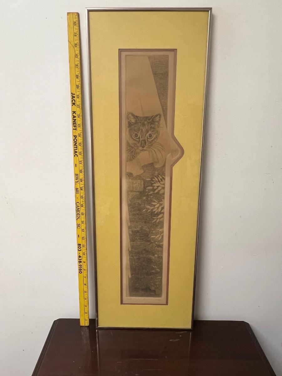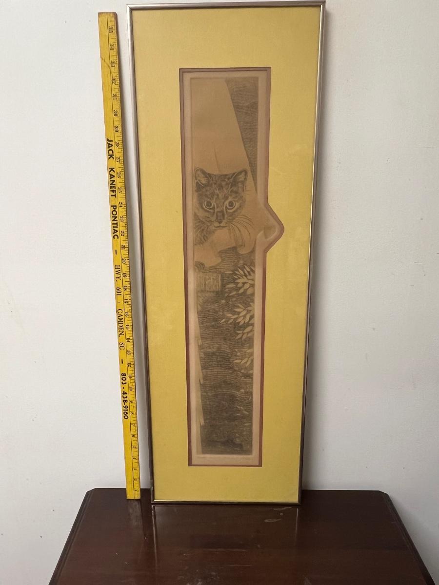 framed cat print titled watch, 1976, artist richard volpe, signed & numbered 136/250, 36 in tall