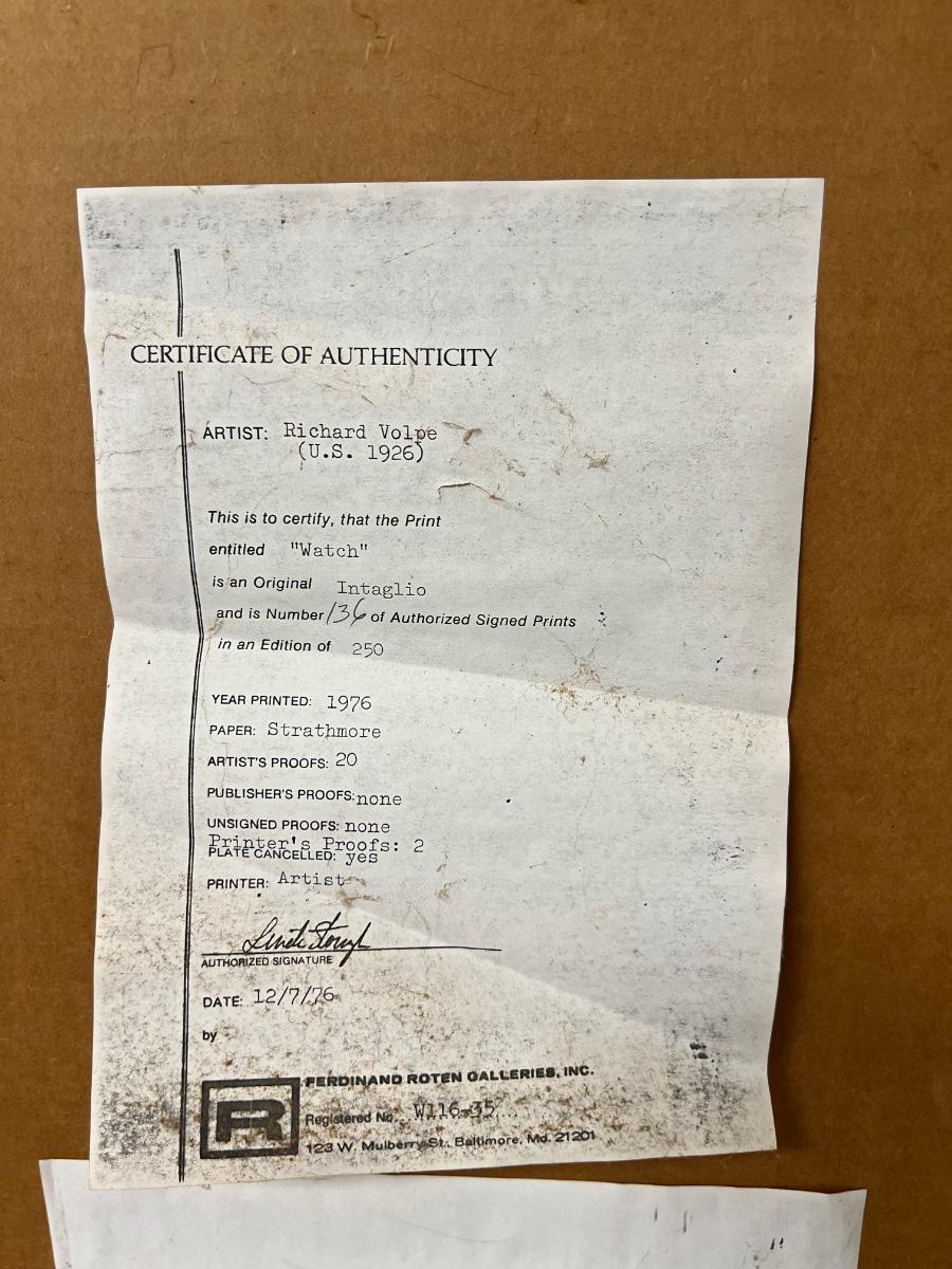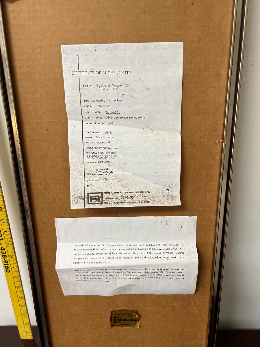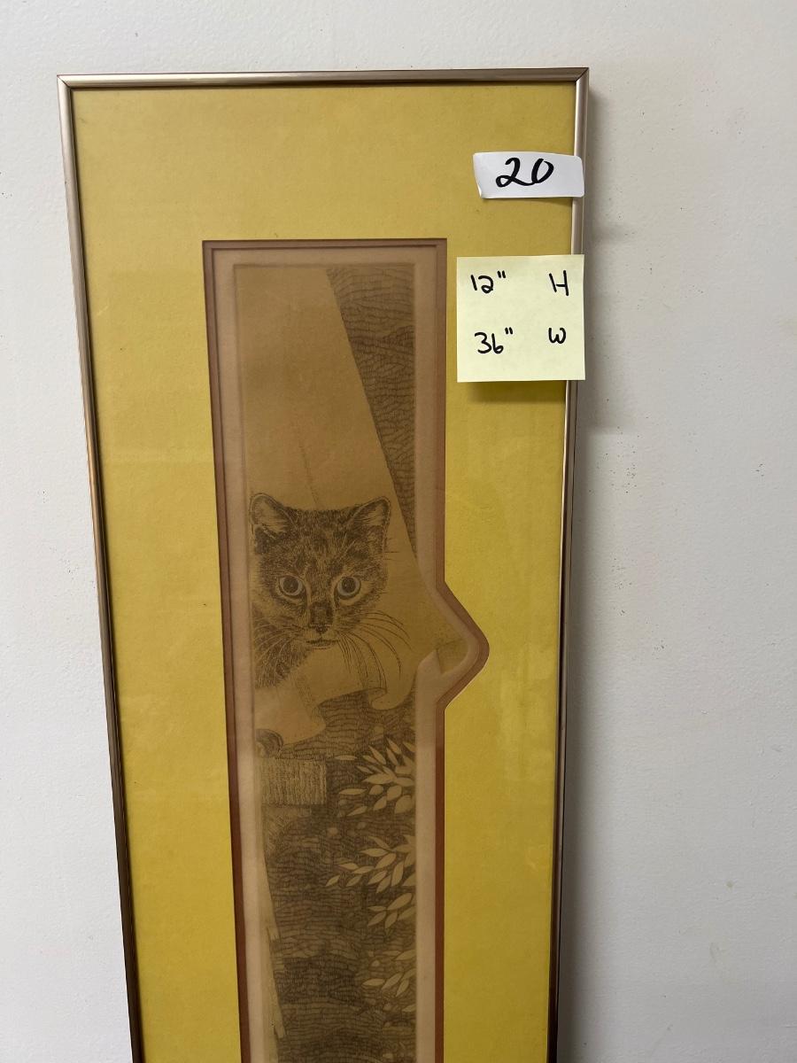 framed cat print titled watch, 1976, artist richard volpe, signed & numbered 136/250, 36 in tall