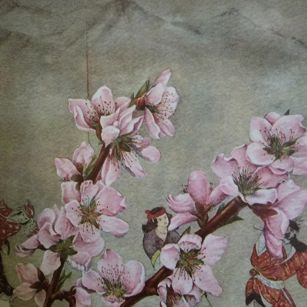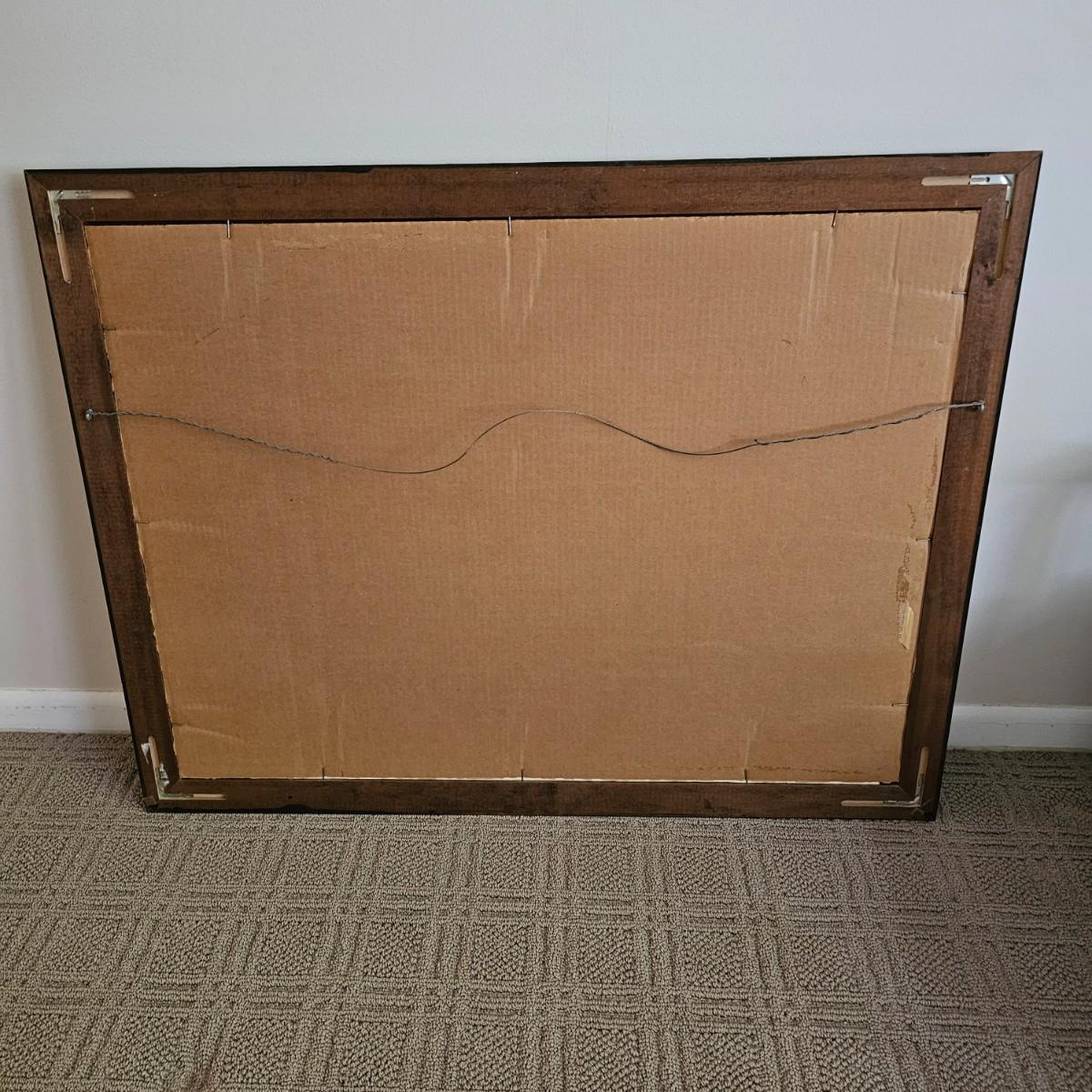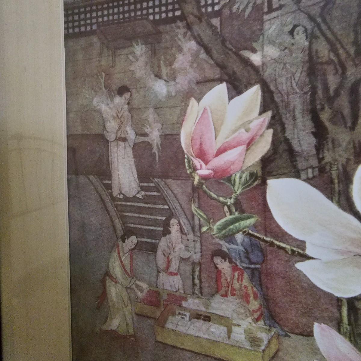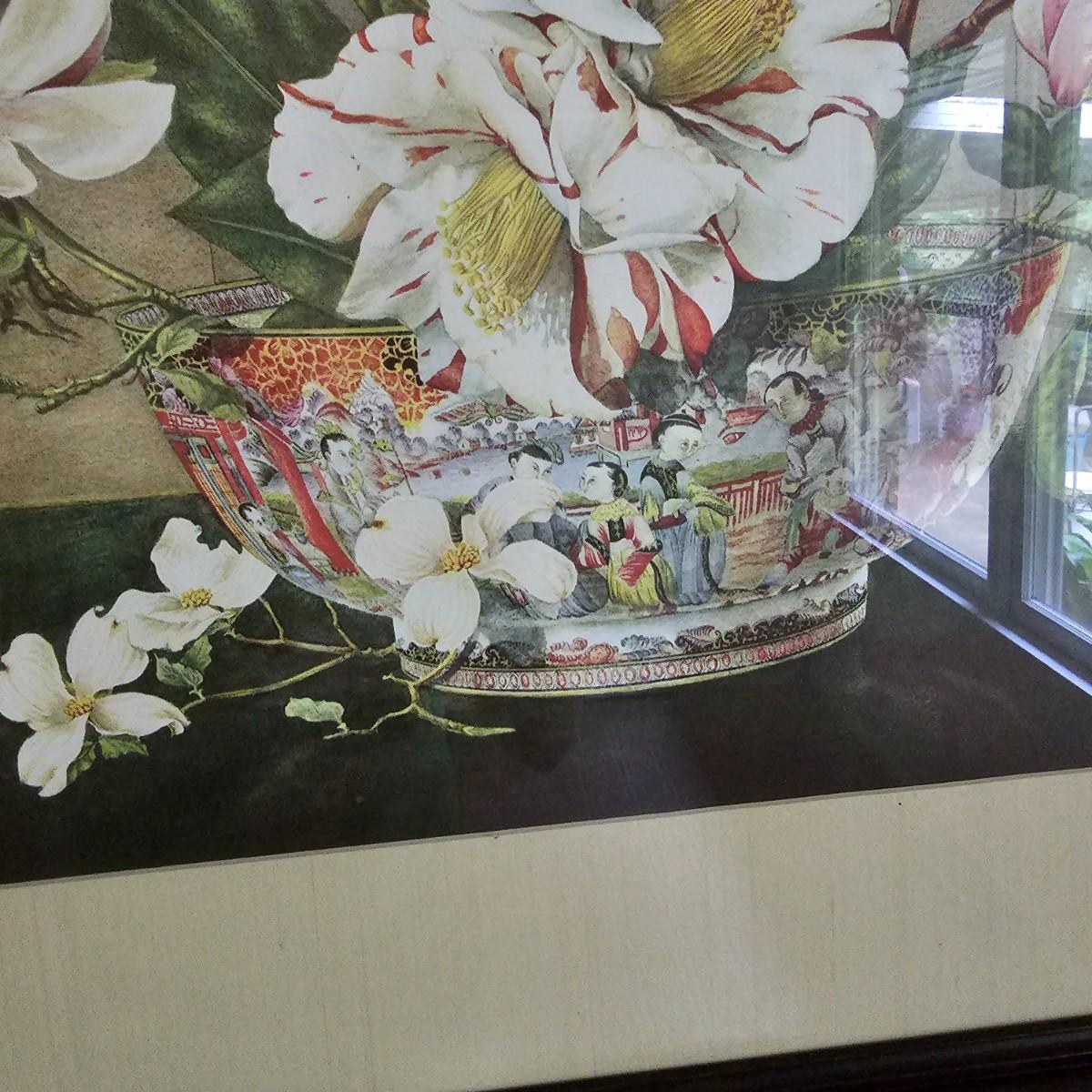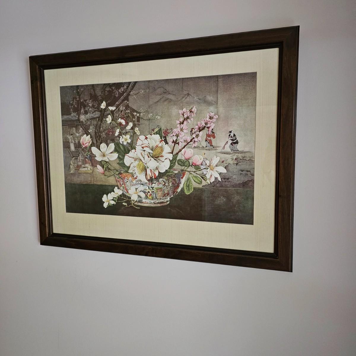 Wood framed print of Asian theme with a bowl of cherry blossoms and gardenias with a temple background. Traditional figures are shown across the back. Picture measures 39.5" x 1.5" x 31"H, has single mat in decorative frame. See photos for details. Shipping available. Shipping can be costly. We suggest contacting our preferred local shipping provider, Postage Express, with dimensions and getting an estimate before bidding: (828) 670-5501 or postageexpress@yahoo.com.