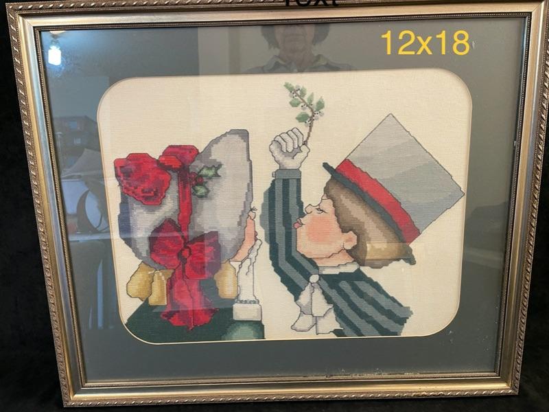 12X18 framed cross stitched picture with a Christmas theme. Hand made