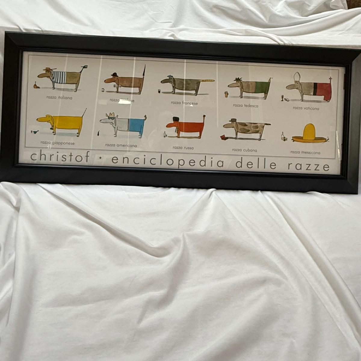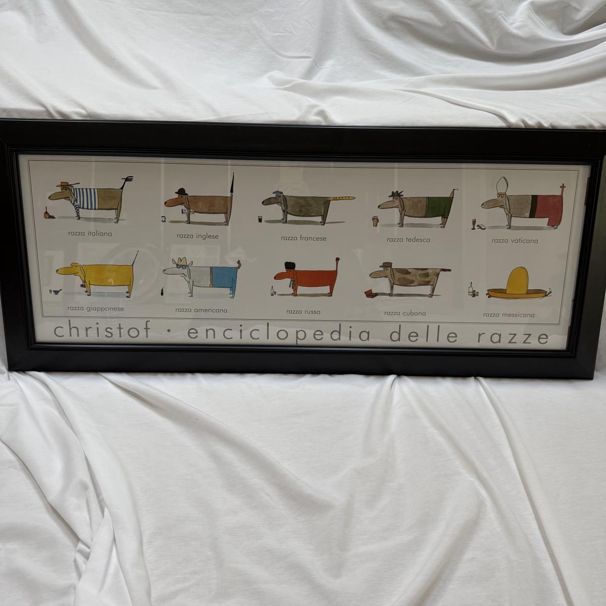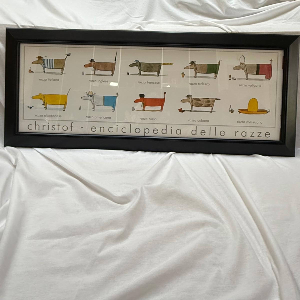 This lot contains a framed print of Christof Enciclopedia delle Razze by artist Christof Eugster. The piece displays fun takes of dachshunds representing different nationalities. This piece is under glass and in a black wooden frame and does have hardware to be hung. It measures 44” x 18”D. Shipping available.