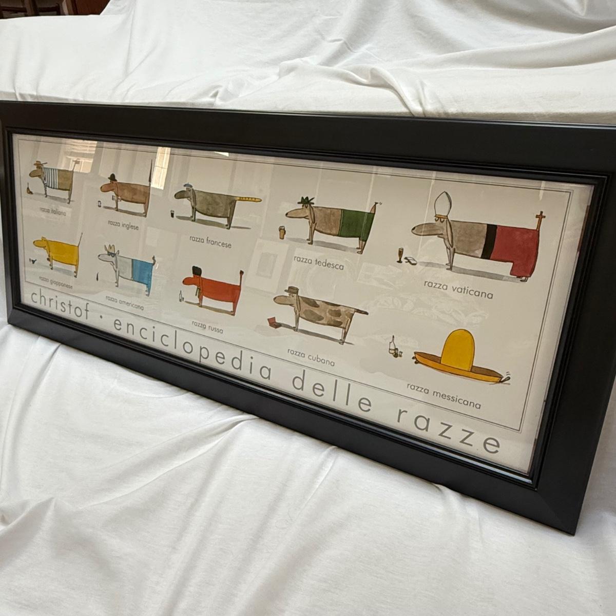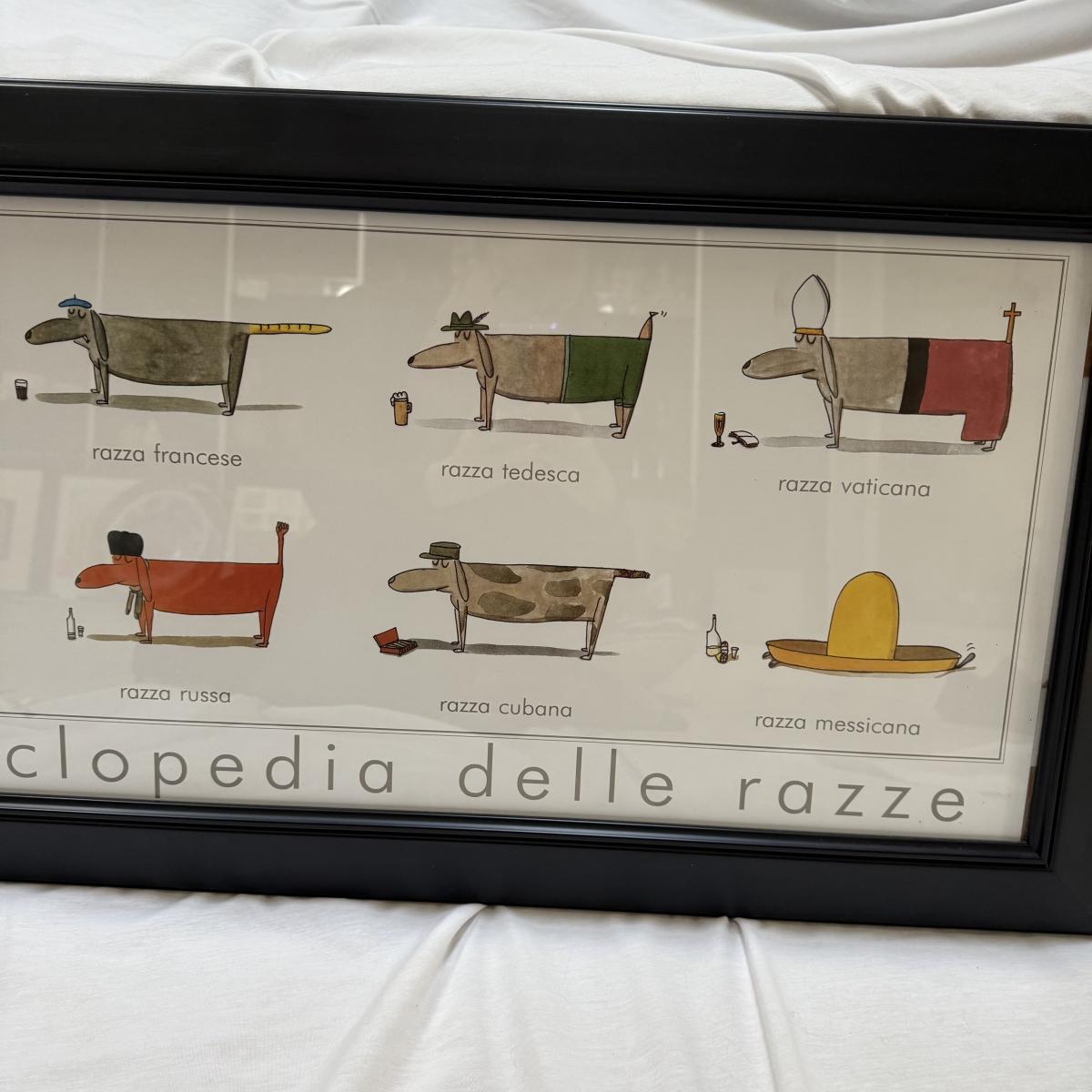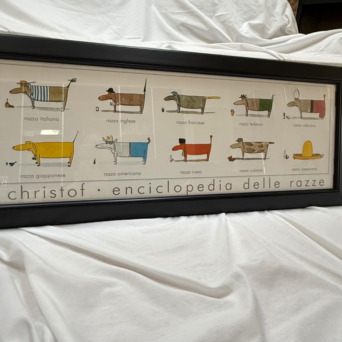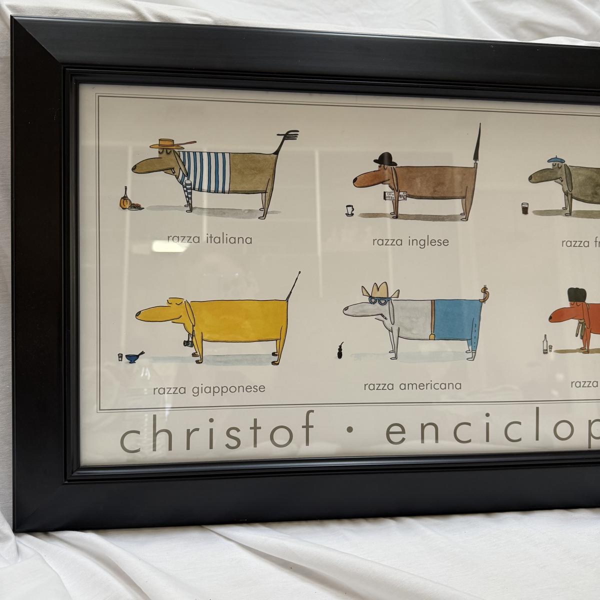 This lot contains a framed print of Christof Enciclopedia delle Razze by artist Christof Eugster. The piece displays fun takes of dachshunds representing different nationalities. This piece is under glass and in a black wooden frame and does have hardware to be hung. It measures 44” x 18”D. Shipping available.