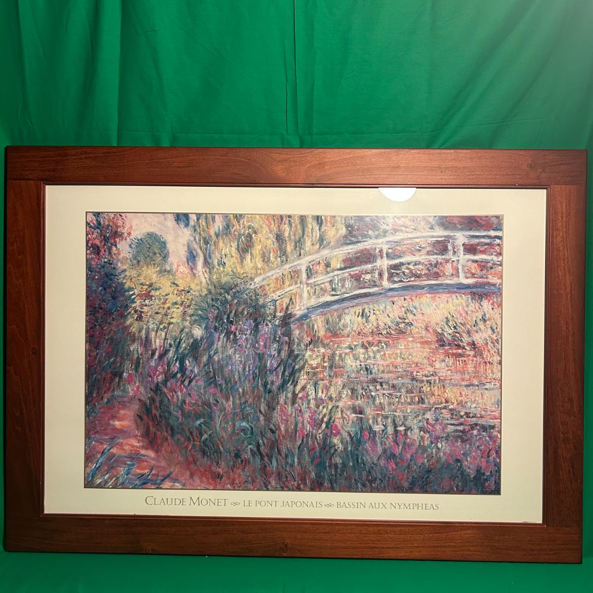 Framed print of Claude Monet's "The Japanese Footbridge," featuring vibrant colors on a cream-colored mat with a wooden frame. The mat includes the printed title and artist's name below the artwork. Frame shows minor wear consistent with display. Exact dimensions available upon request.