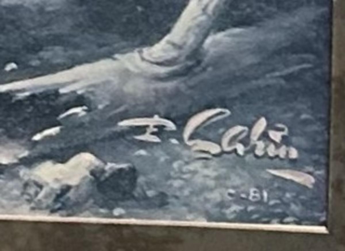 Framed coastal seascape featuring turbulent waves and a rocky shoreline with distant mountains in soft blue tones. The piece is signed by the artist, "Sabin" and includes an additional marking "C-81." The ornate gold-tone frame with textured details complements the artwork, and the matting highlights the central painting.