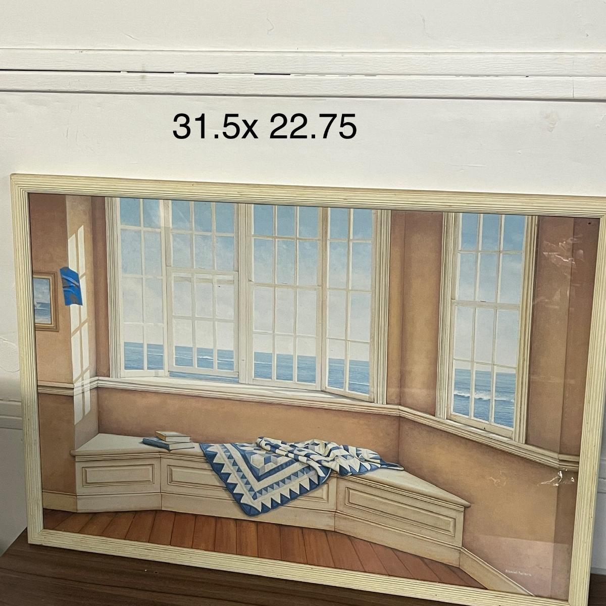 Ocean view, window seat, quilt, book, sunlight, peaceful decor.