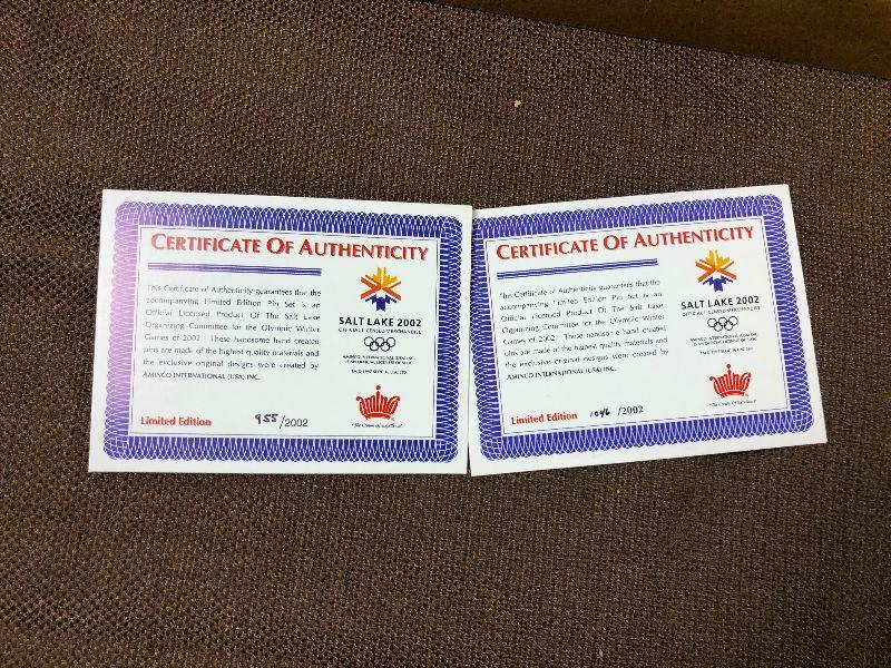 Framed Collection of Salt Lake City, Utah 2002 Olympic Pins nicely framed in shadow box, certificates included.