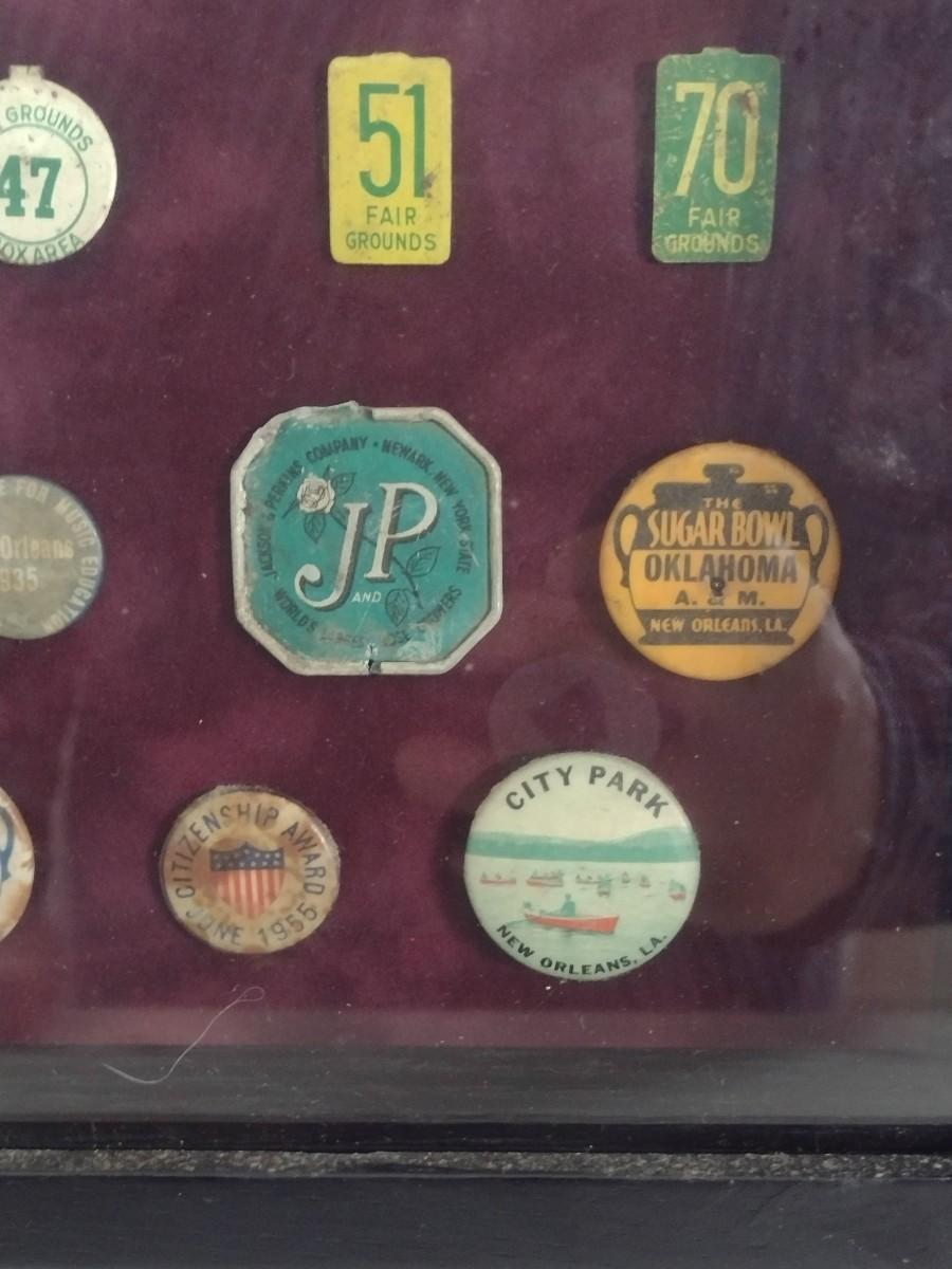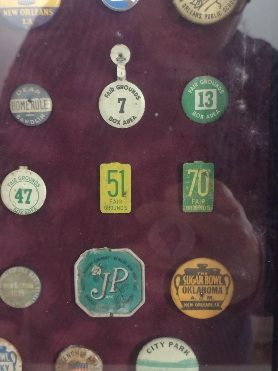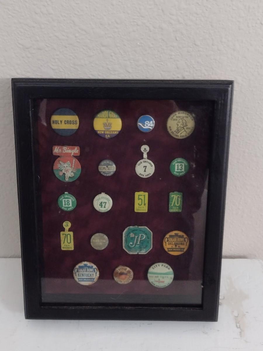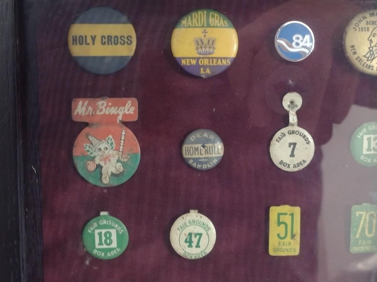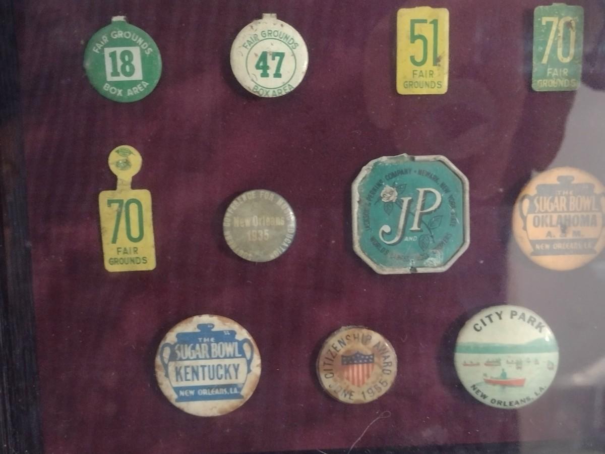 Framed Collection of Vintage Metal Lapel and Pocket Pins New Orleans Fair Grounds, Bowl Games, ETC (#16)