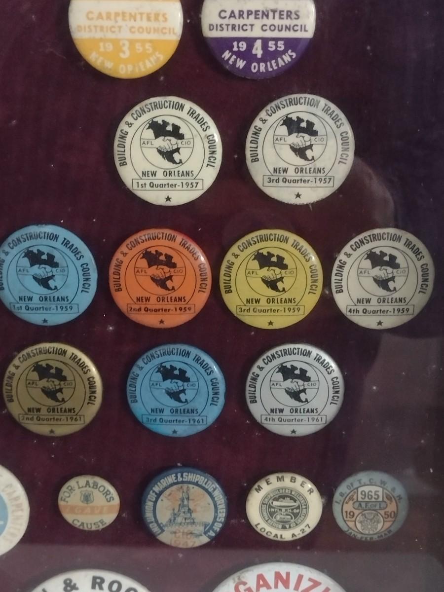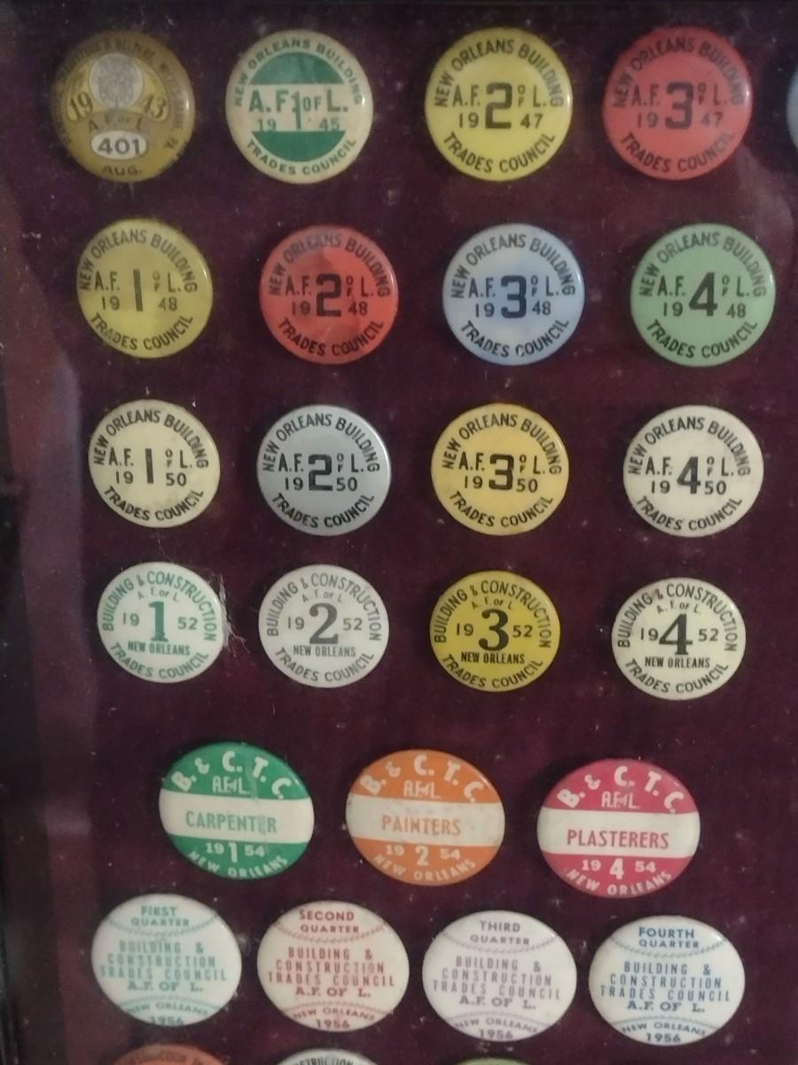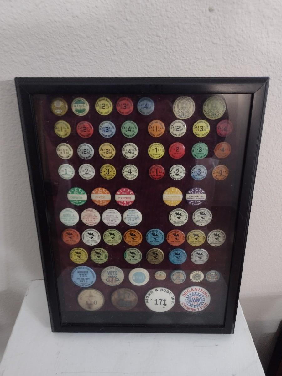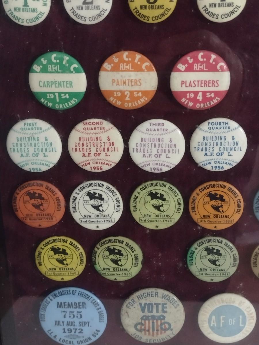 Framed Collection of Vintage New Orleans Union Workers Lapel or Pocket Pins Various Trades (#9)