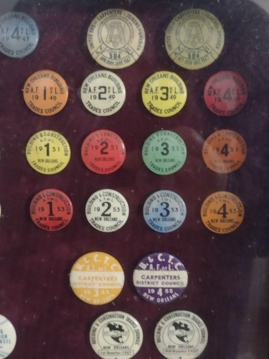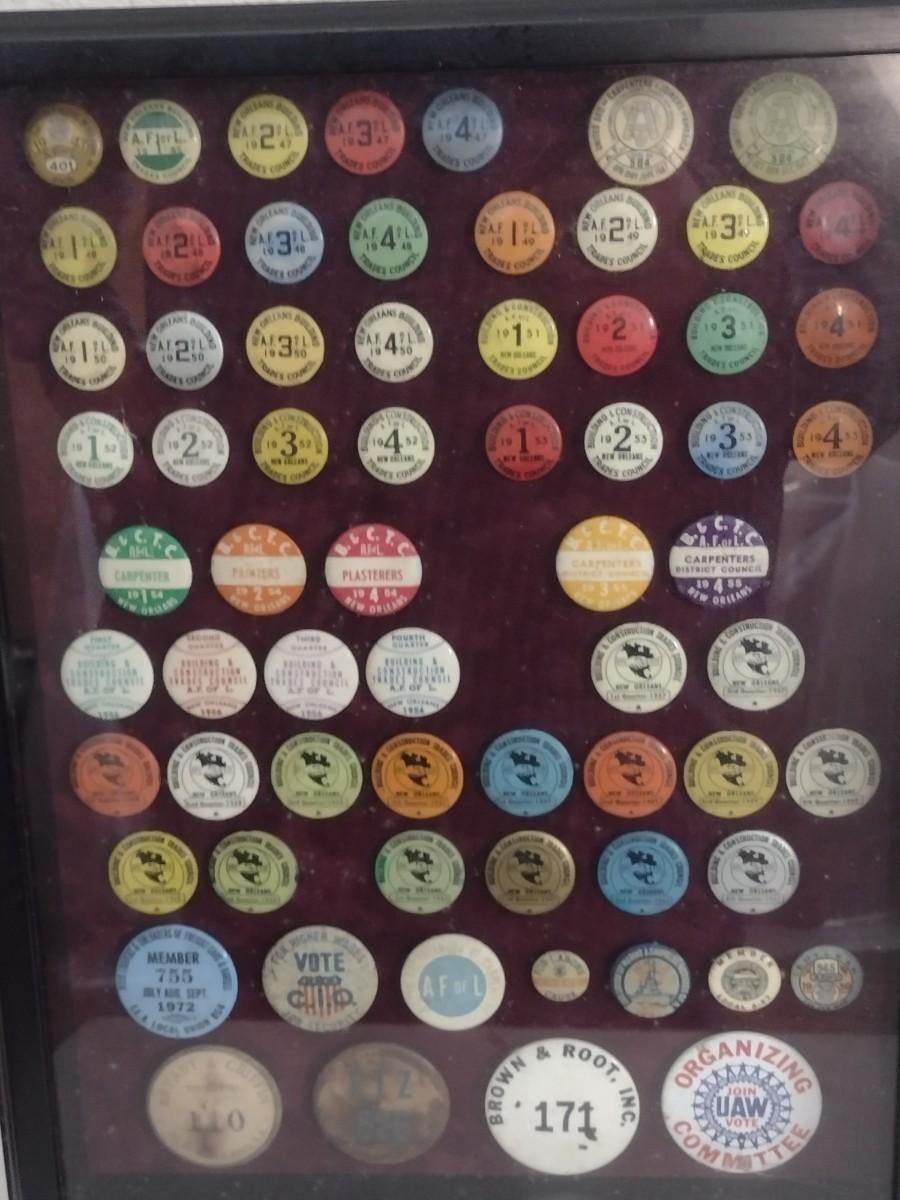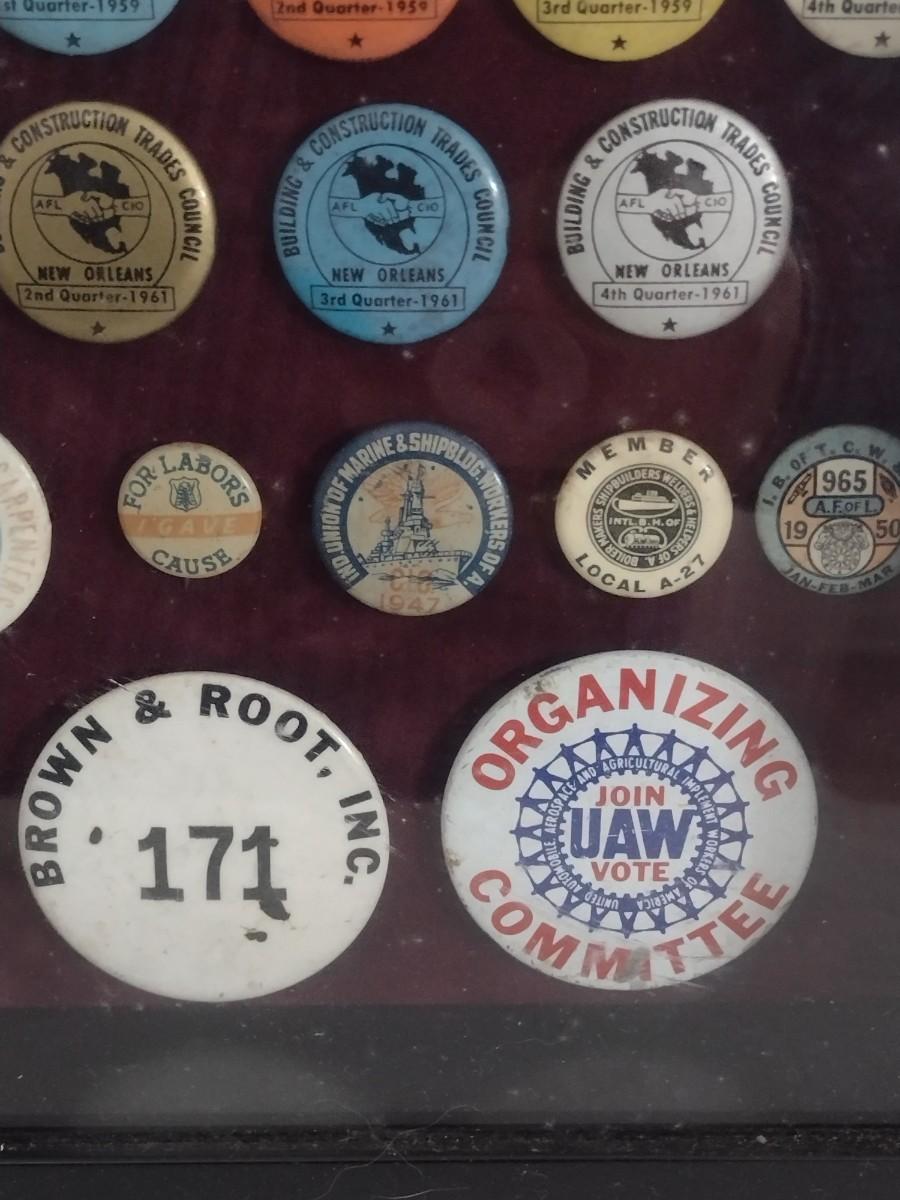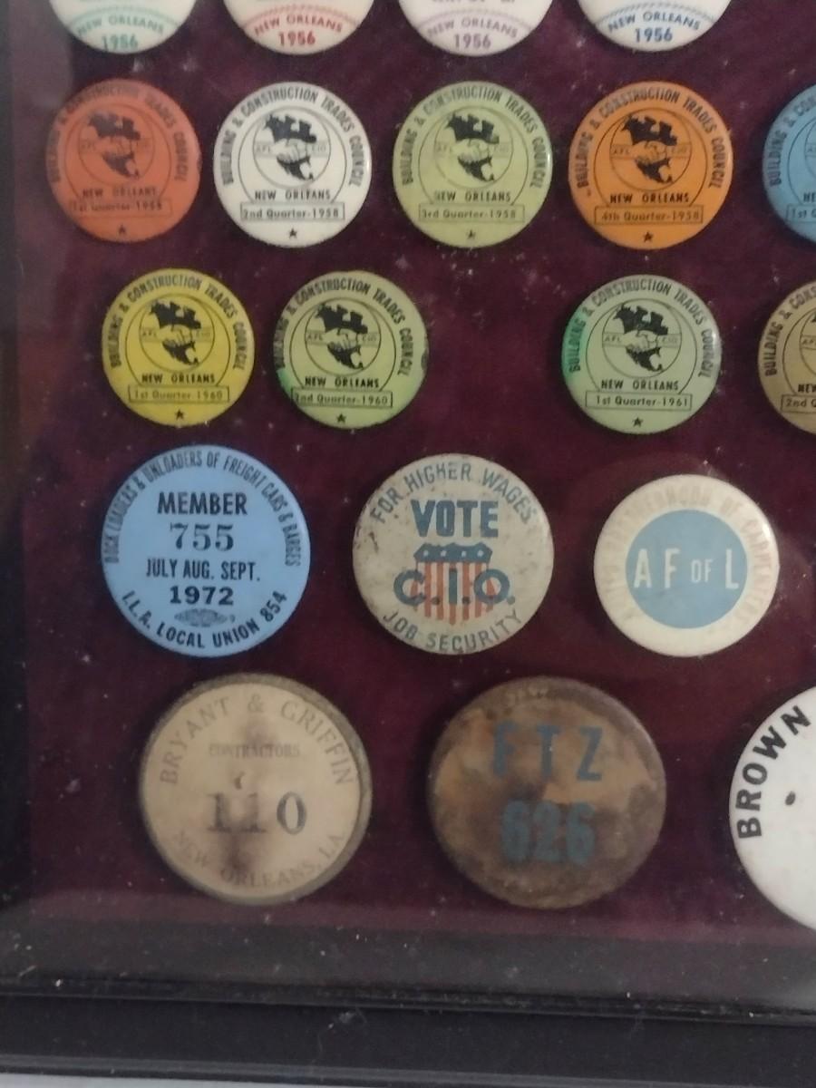 Framed Collection of Vintage New Orleans Union Workers Lapel or Pocket Pins Various Trades (#9)