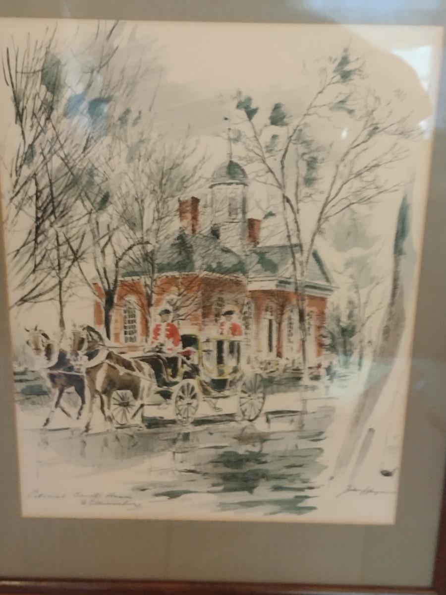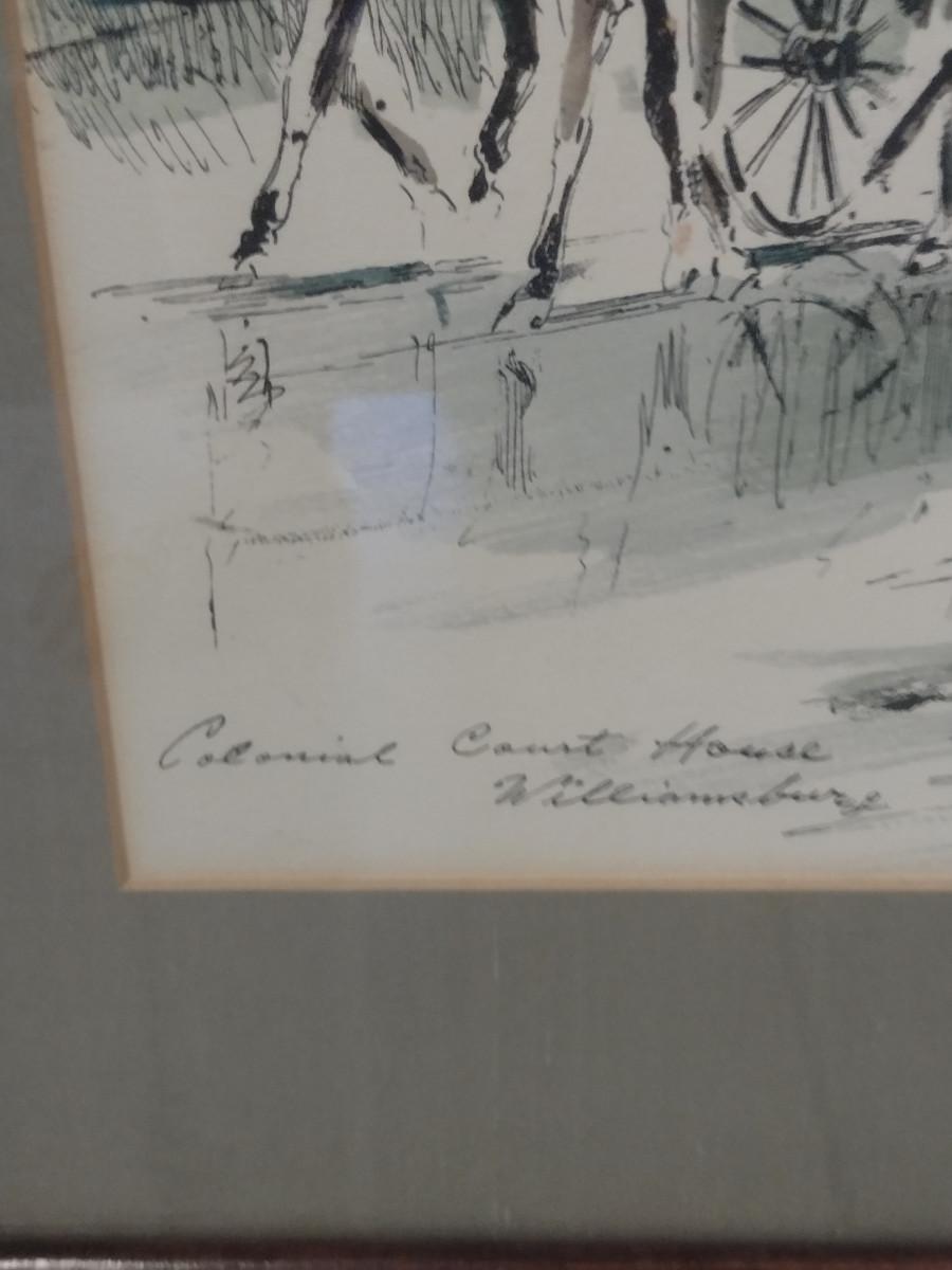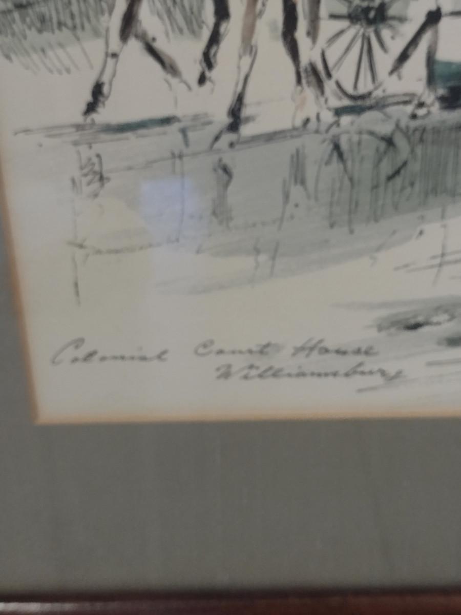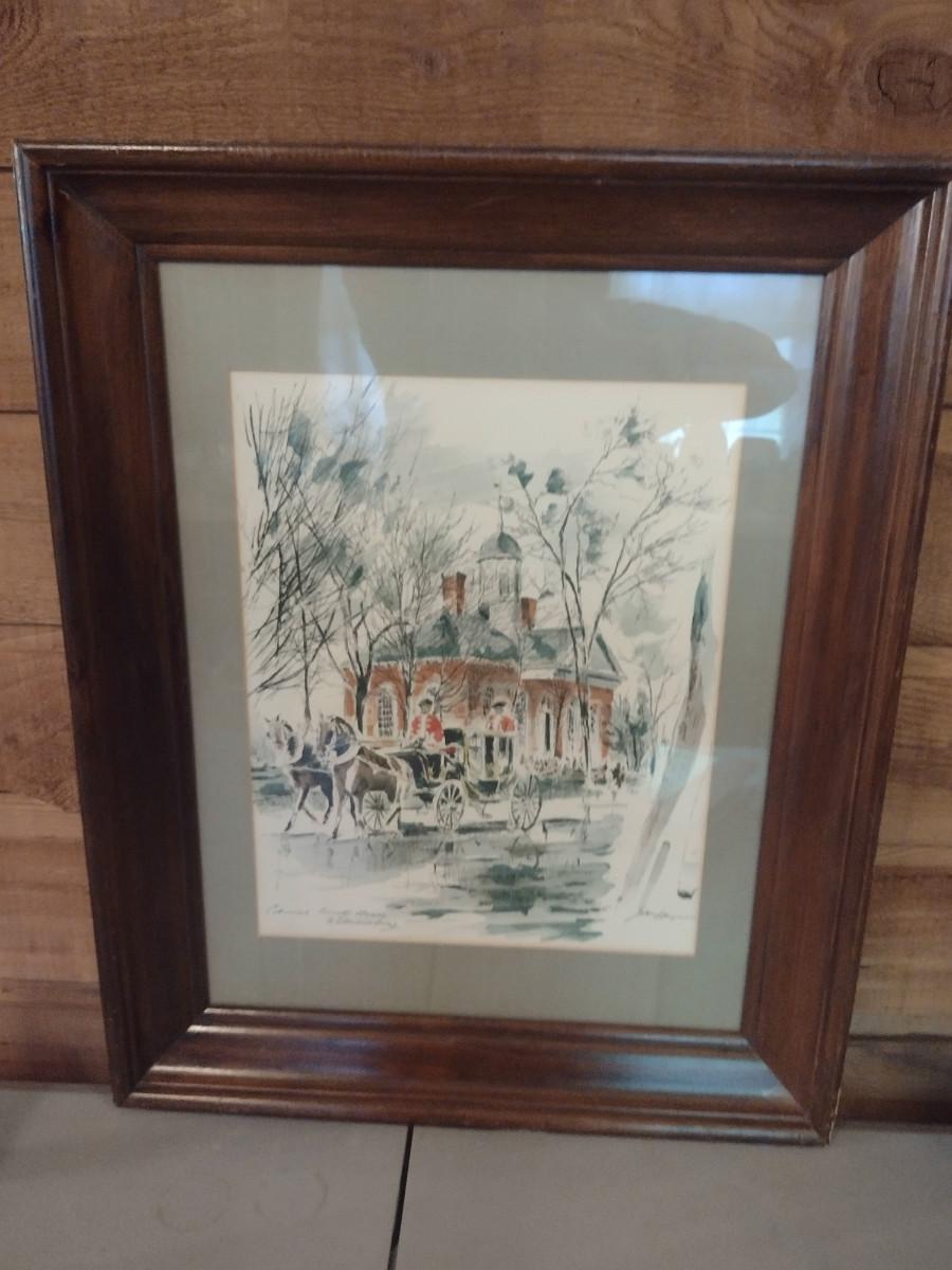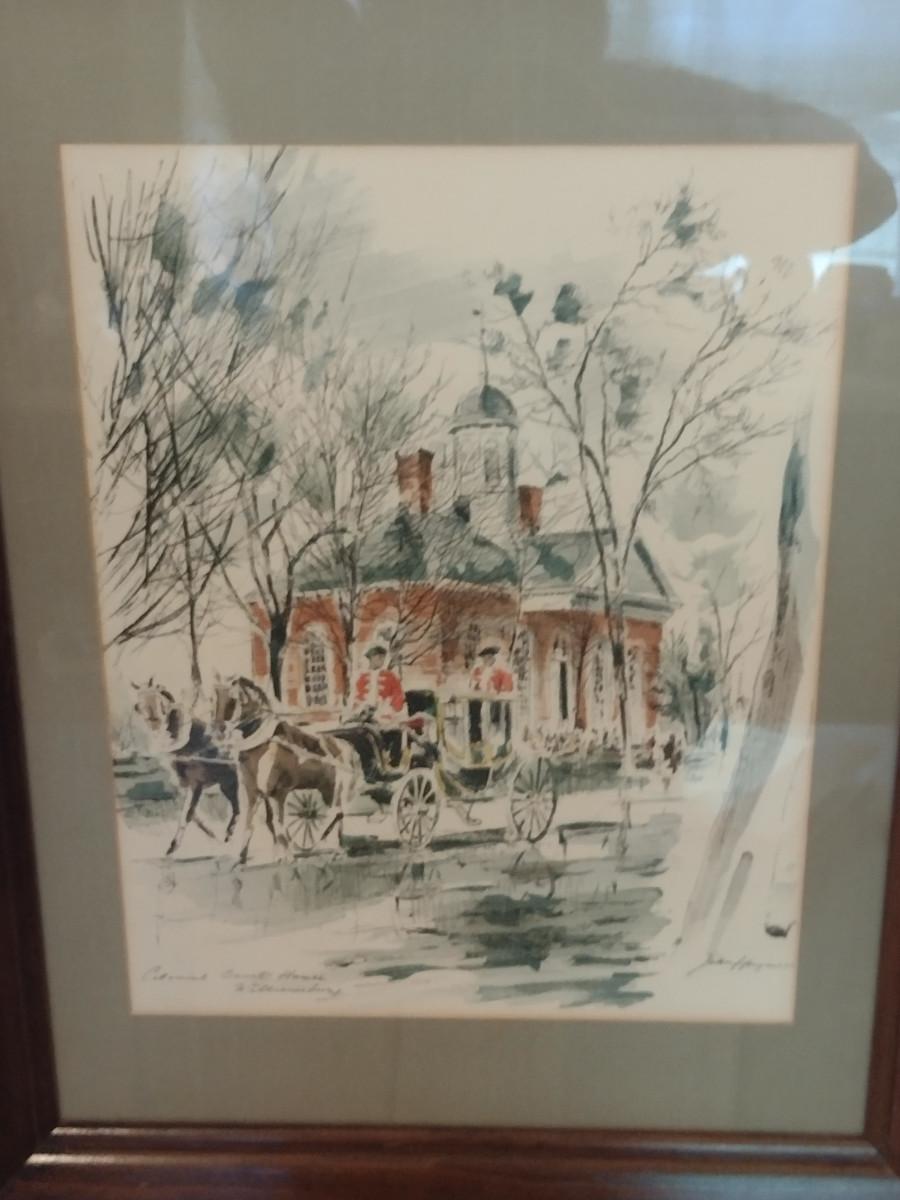 Framed 'Colonial Court House Williamsburg' Print- Approx 23 1/2" x 29". Frame has some damage to finish.