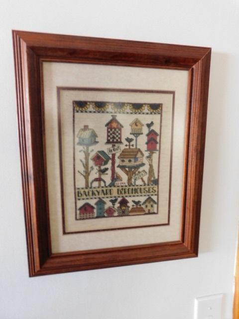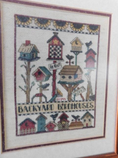 Framed Colorful Cross Stitch Backyard Birdhouses 16" x 13"