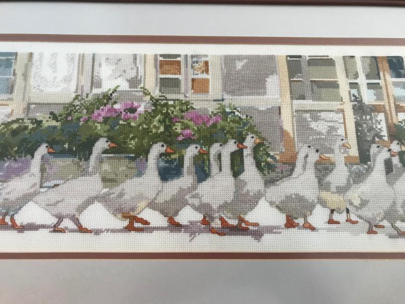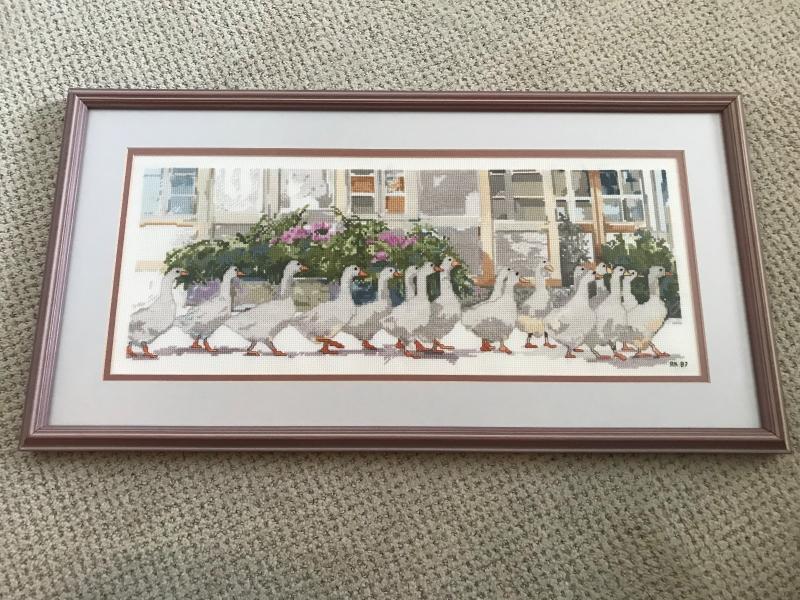 Lot 378-Framed Counted Cross Stitch Piece of White Geese