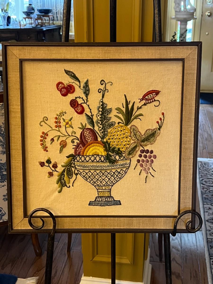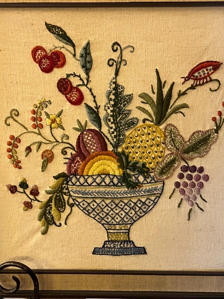 Framed Crewel Embroidery Art- Fruit Bowl