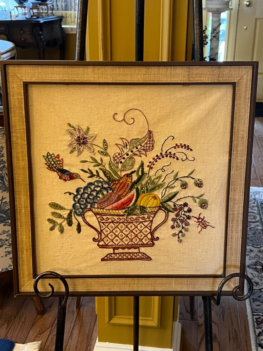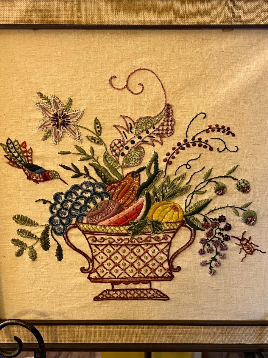 Framed Crewel Embroidery Art- Fruit Bowl w/ Humming Bird