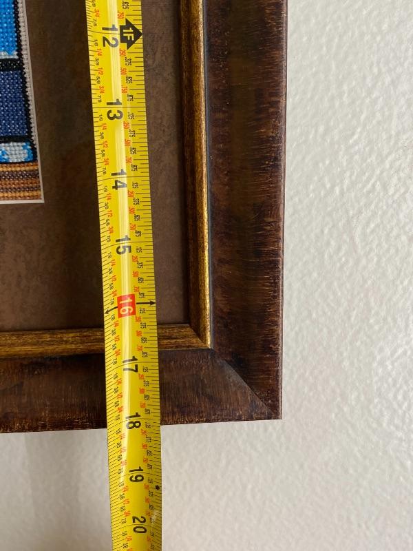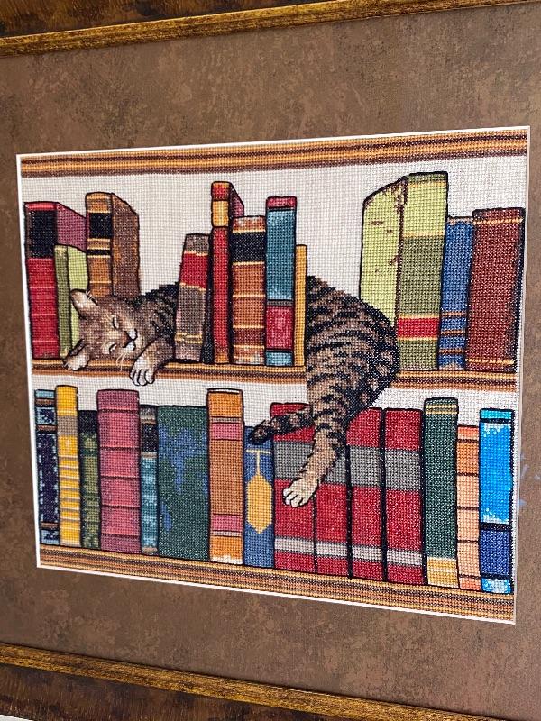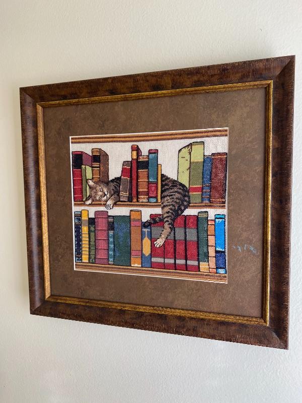 Cat sleeping amongst the books, framed cross stitch art. About 18"x20".