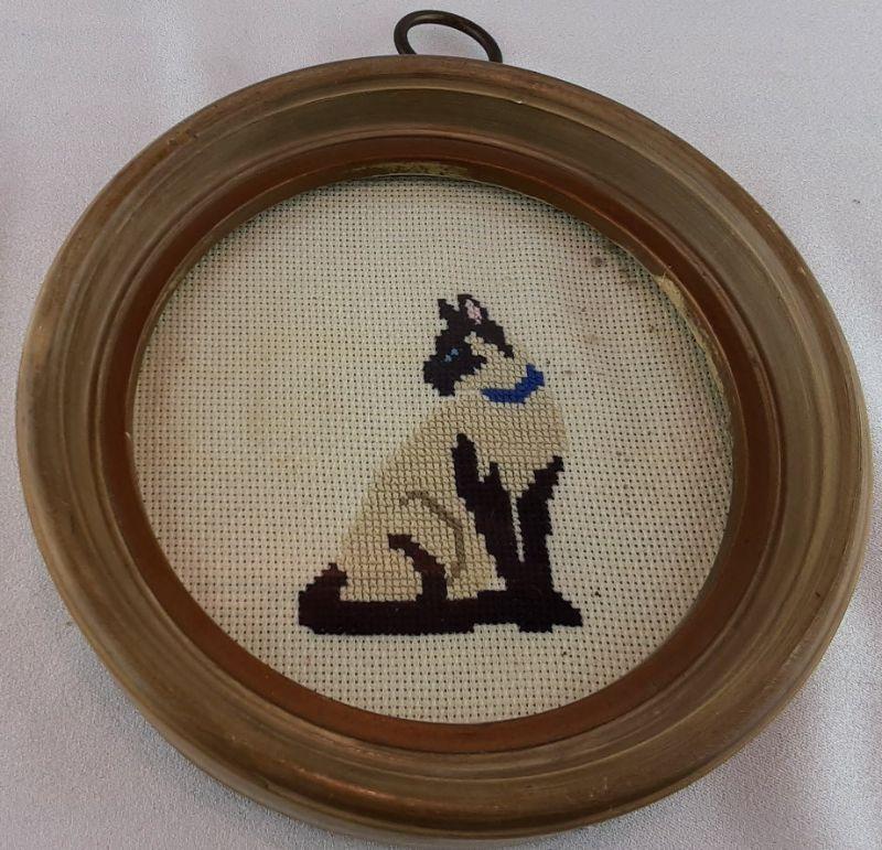 Well done cross-stich in a round frame. Measures 6in. diameter and 1in. thick.