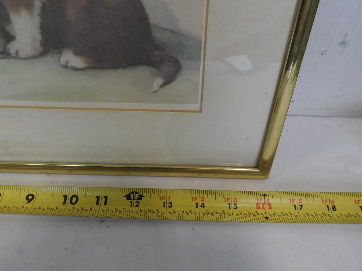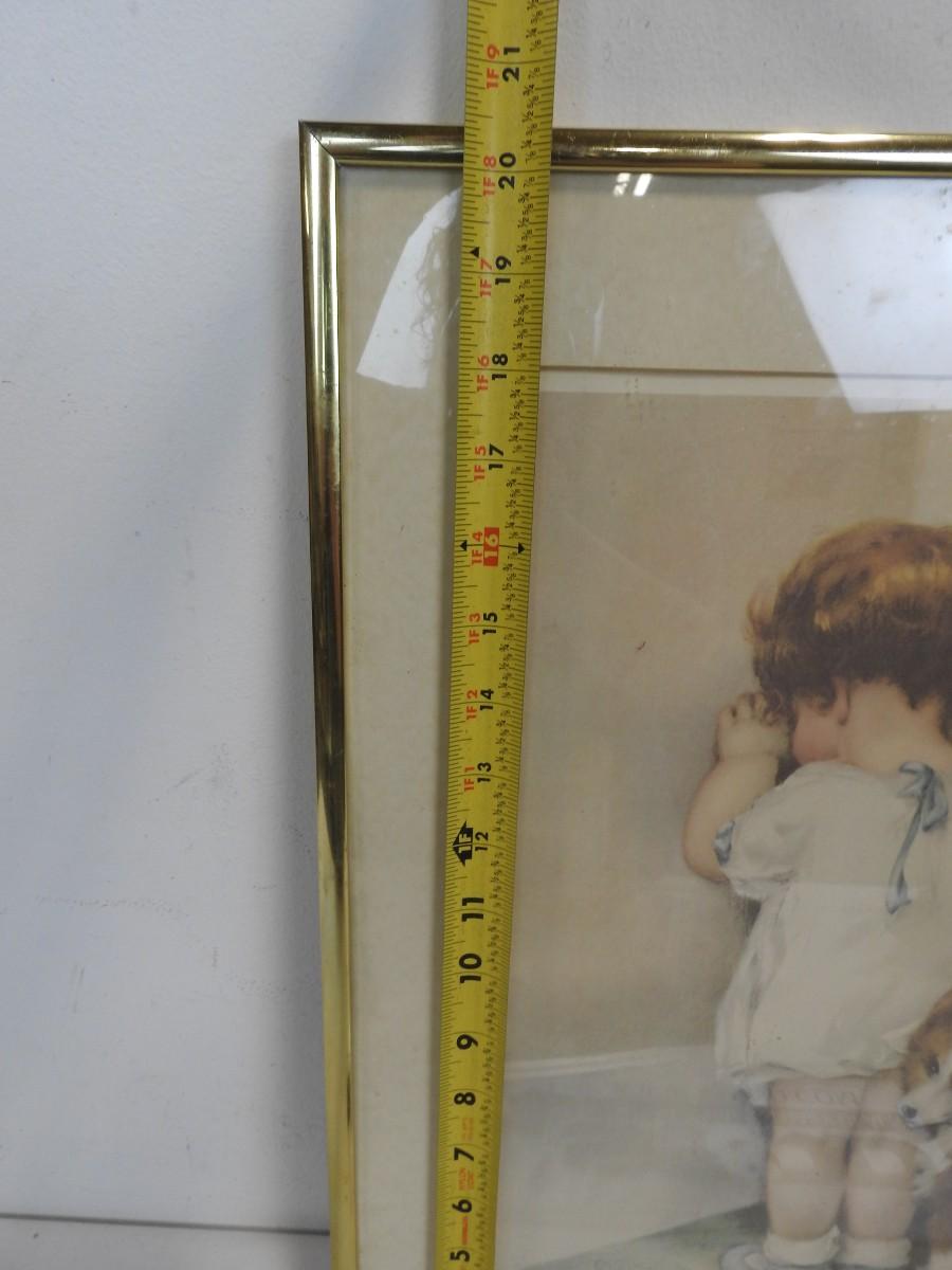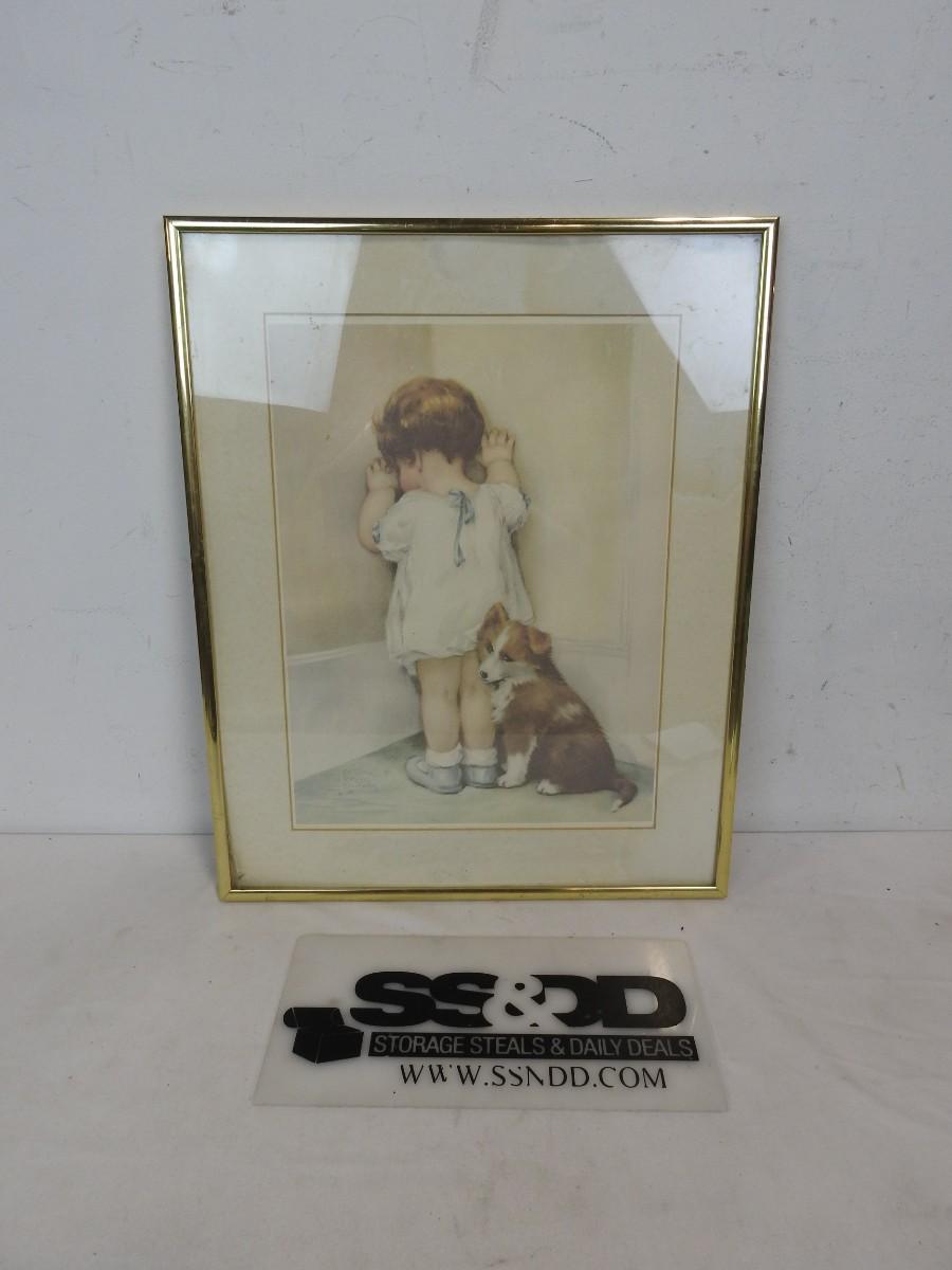 Framed Home Decor Art, Vintage Style Child & Puppy in Corner Bessie Pease Gutmann. Brass Frame, needs new glass