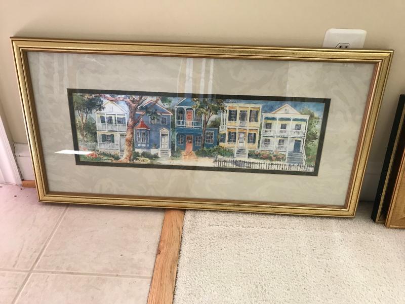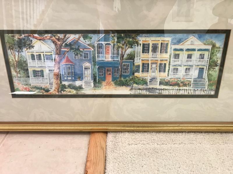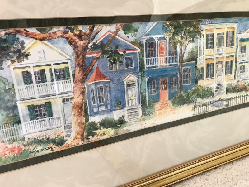 Nice framed and matted print of brightly colored pencil drawing of Southern row houses. Matted in black and cream marbled matting and framed in gilt frame. Labeled on back. 34" x 17"H