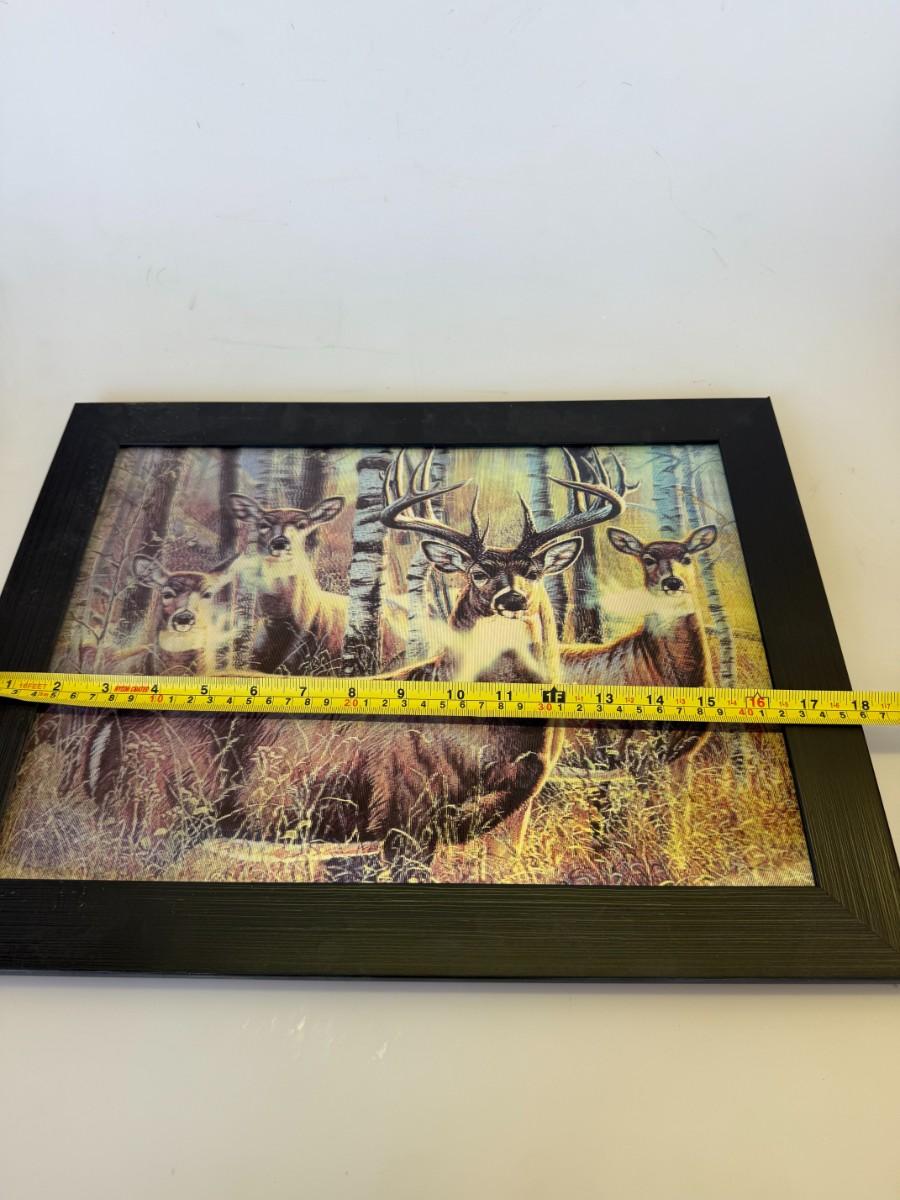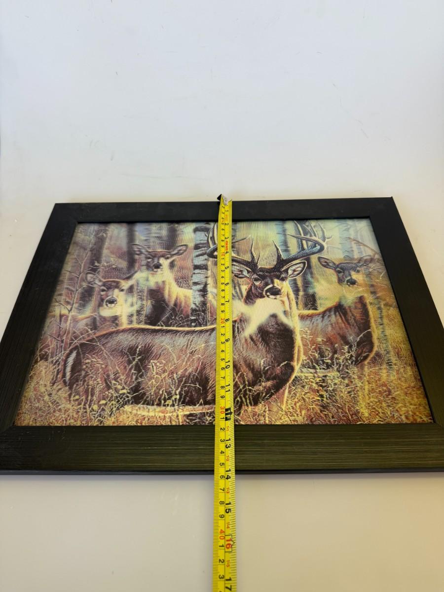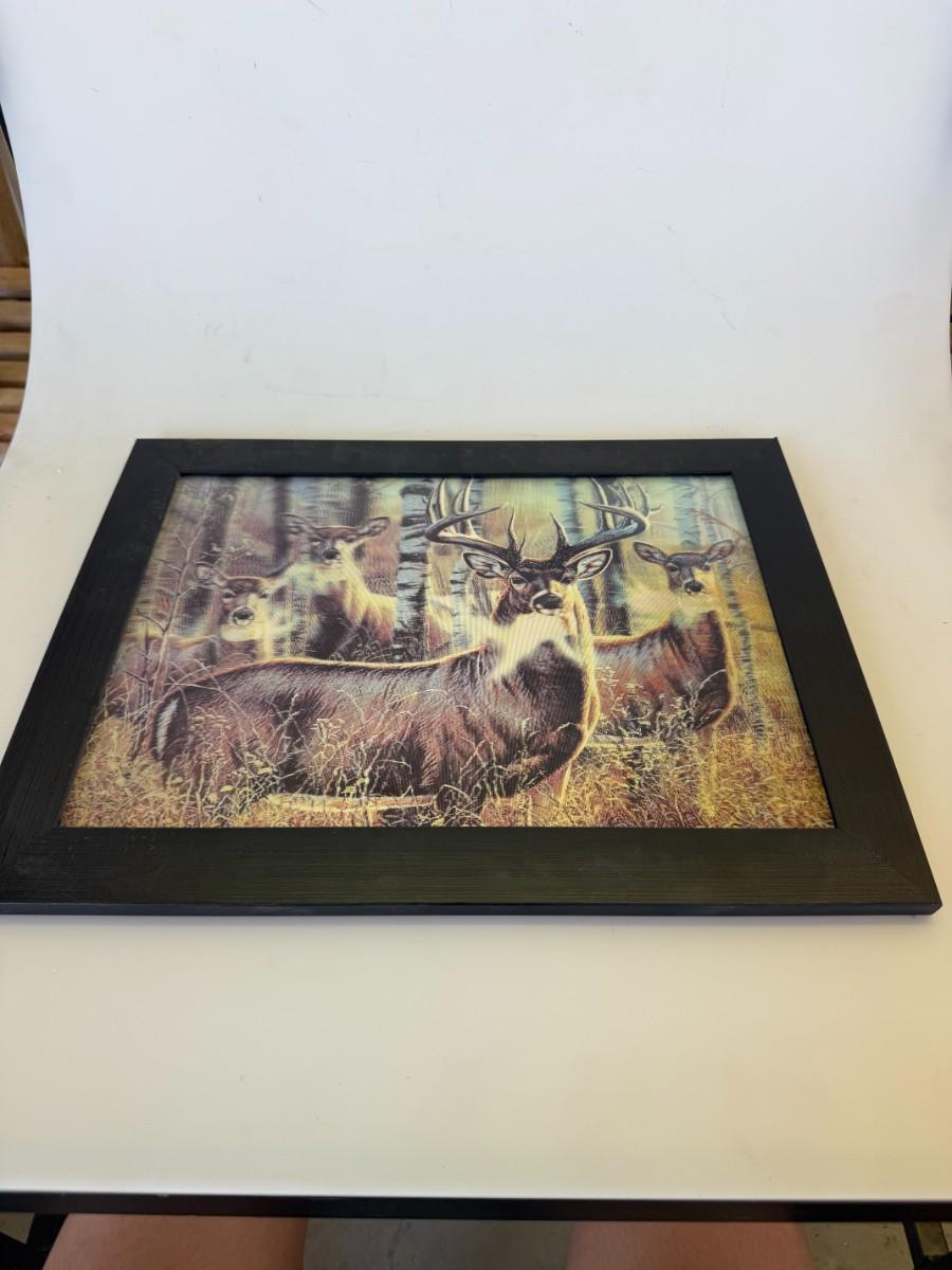 Rustic framed wall art featuring a group of deer in a forest. Perfect for lodge or cabin-style decor. Ready to hang.