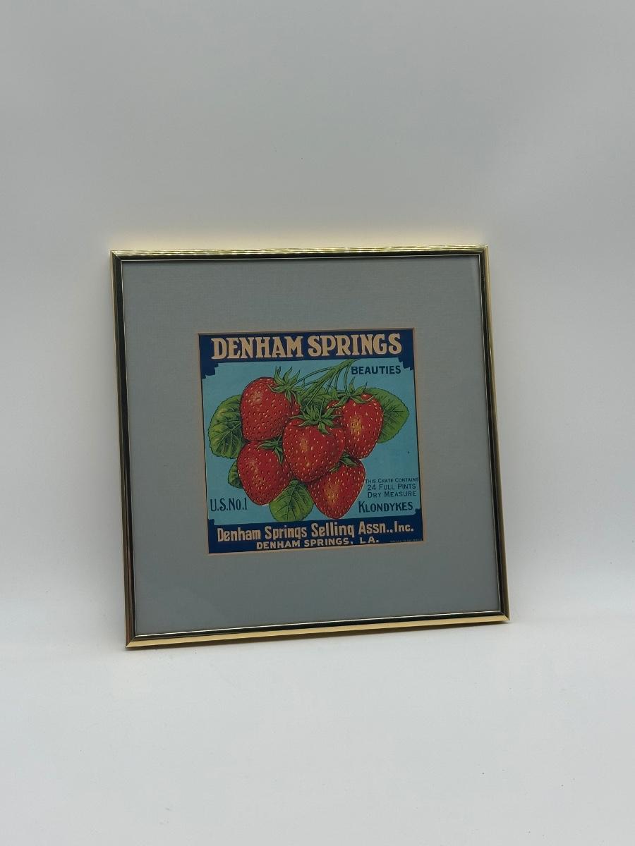 Framed decorative print of a vintage-style strawberry crate label reading “Denham Springs Beauties” from Denham Springs, Louisiana.