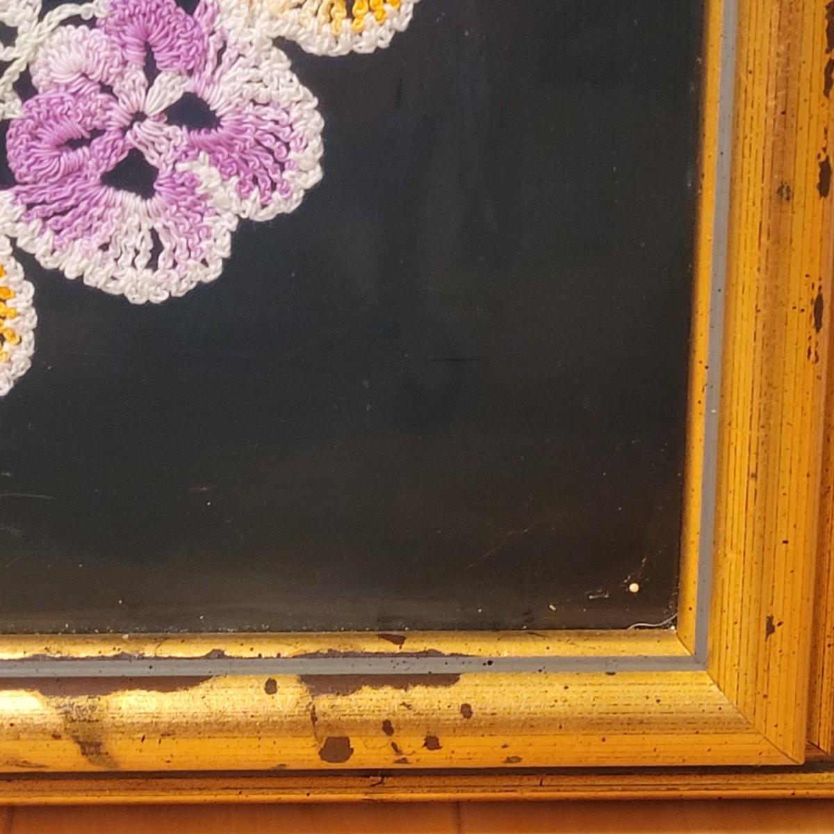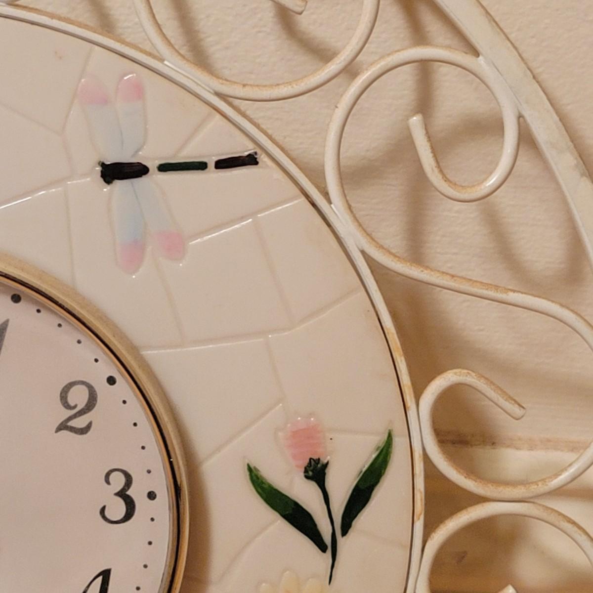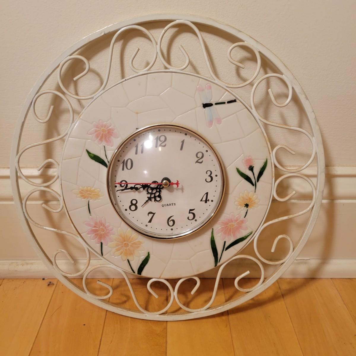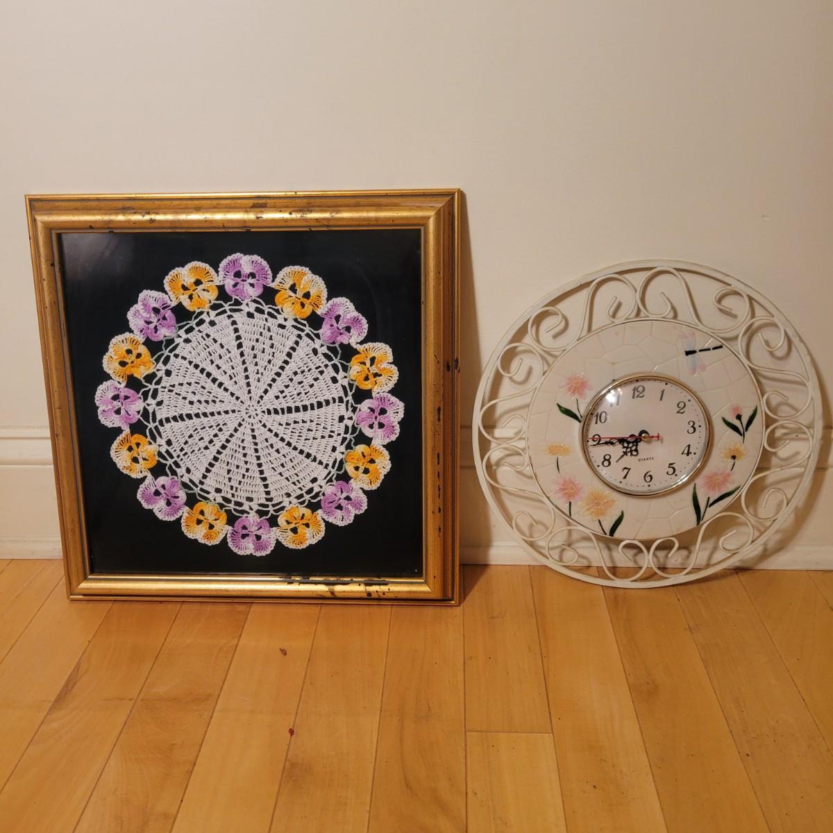 A framed doilie and metal wall clock in good condition. Doilie is in a wooden gold leaf frame with some blemishes on a black mat. Measures approximately 14.5 " x 14.5 " x 1.5". Clock is made of metal with flowers and dragonflies in a mosaic motif. It is battery powered and could not be tested. Local pickup only