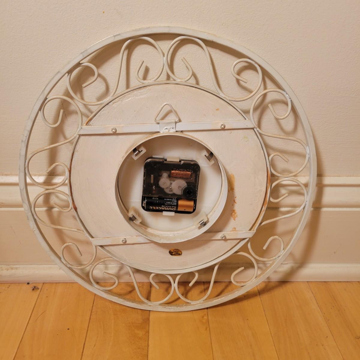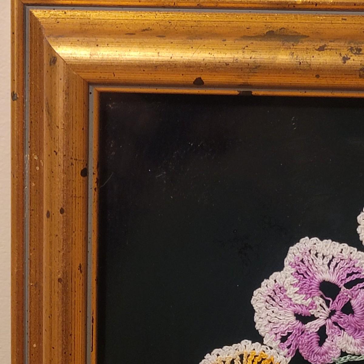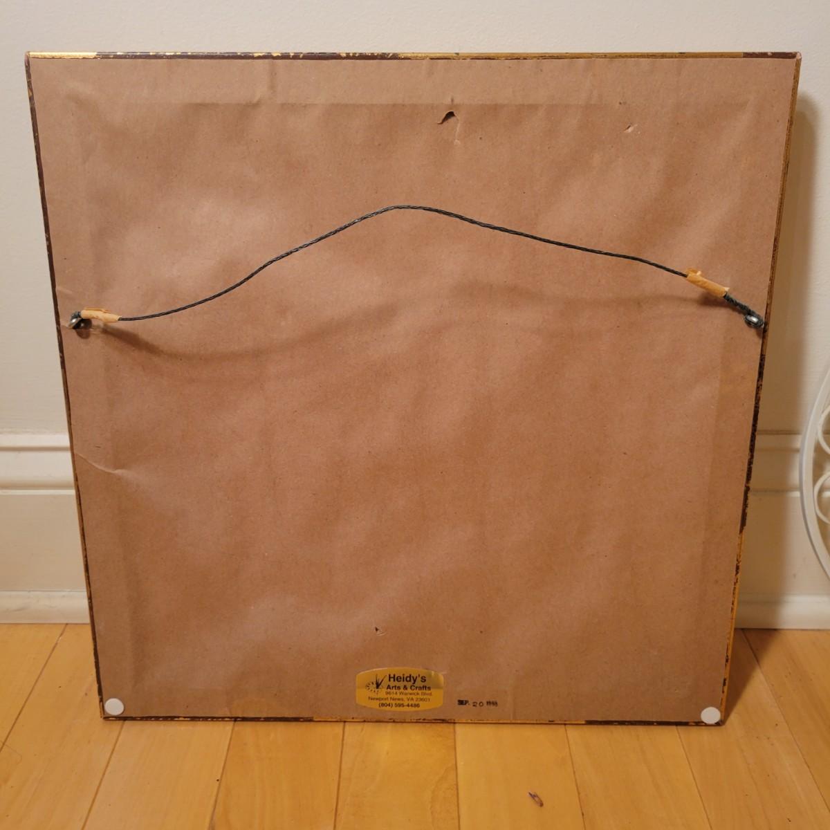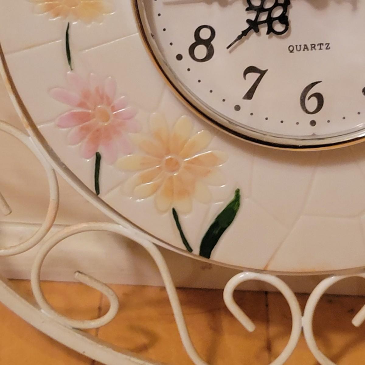 A framed doilie and metal wall clock in good condition. Doilie is in a wooden gold leaf frame with some blemishes on a black mat. Measures approximately 14.5 " x 14.5 " x 1.5". Clock is made of metal with flowers and dragonflies in a mosaic motif. It is battery powered and could not be tested. Local pickup only