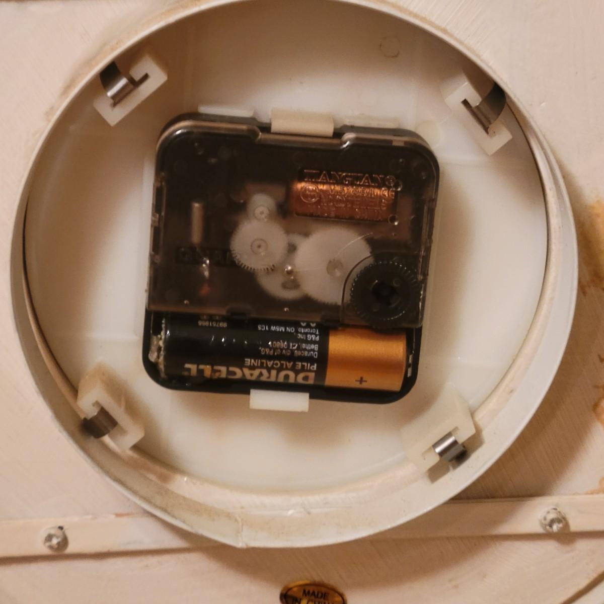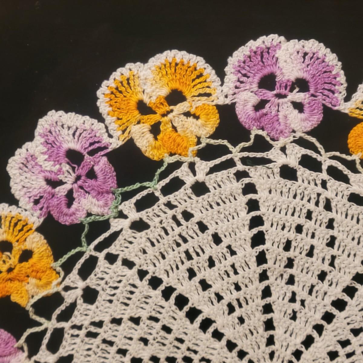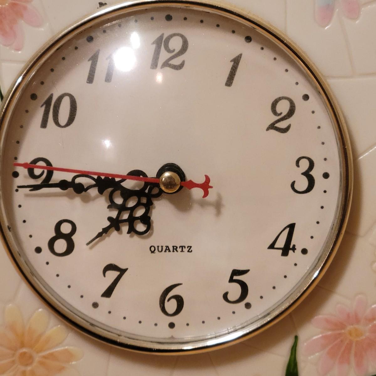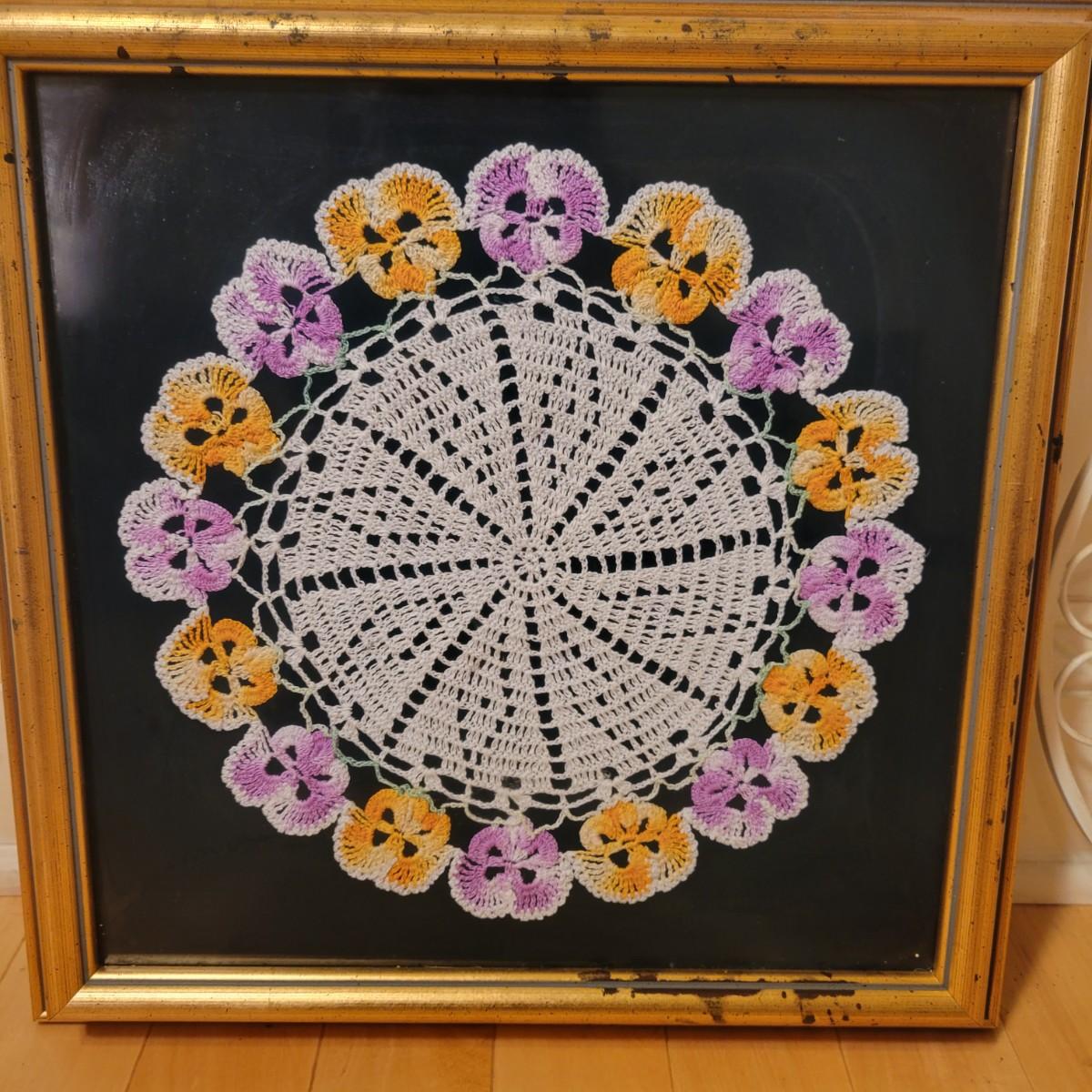 A framed doilie and metal wall clock in good condition. Doilie is in a wooden gold leaf frame with some blemishes on a black mat. Measures approximately 14.5 " x 14.5 " x 1.5". Clock is made of metal with flowers and dragonflies in a mosaic motif. It is battery powered and could not be tested. Local pickup only