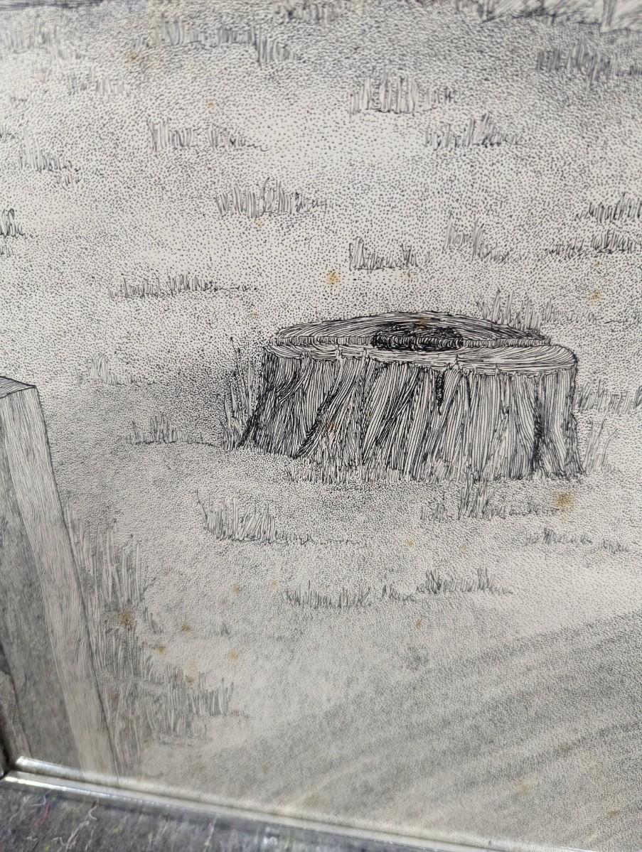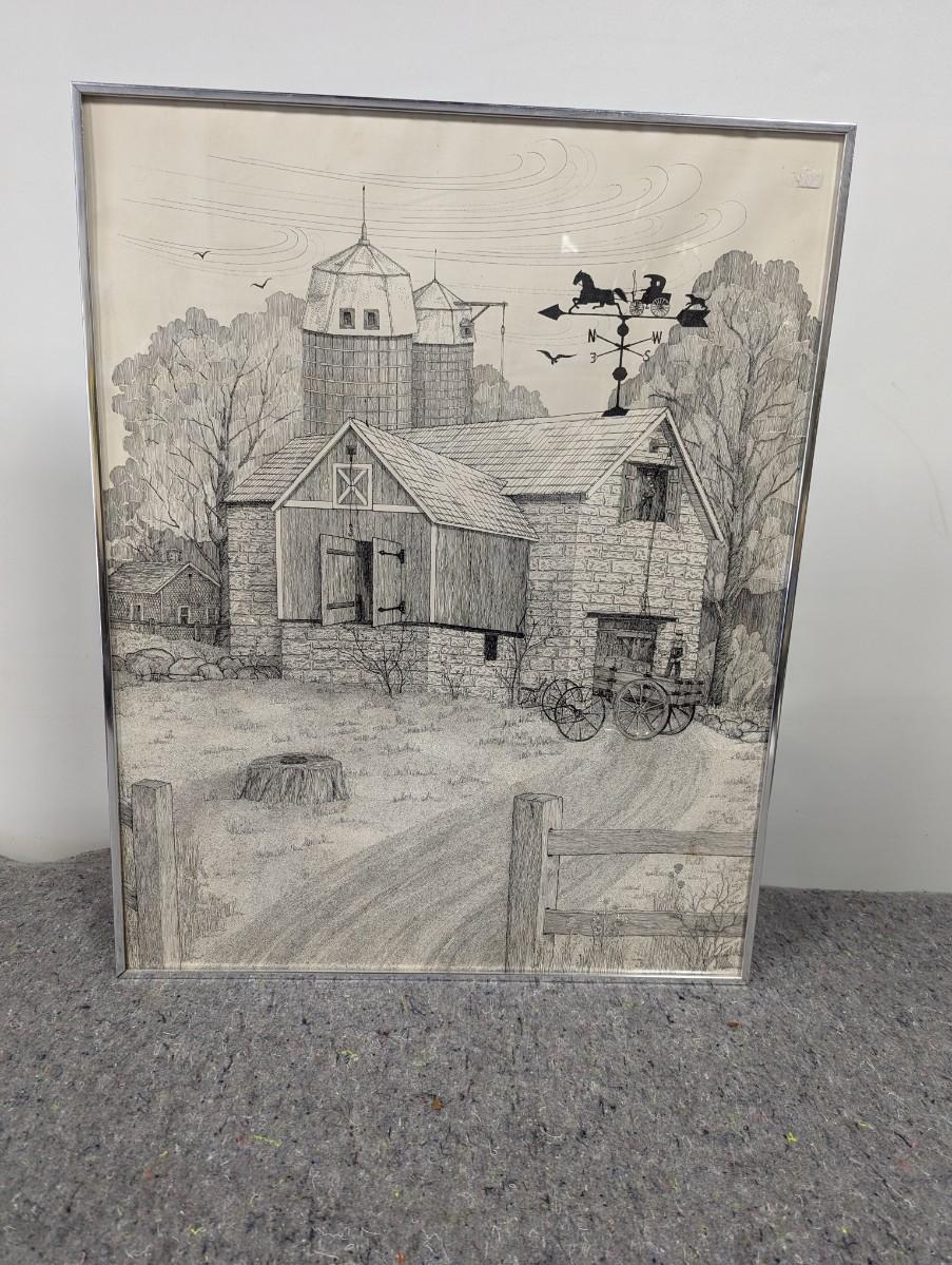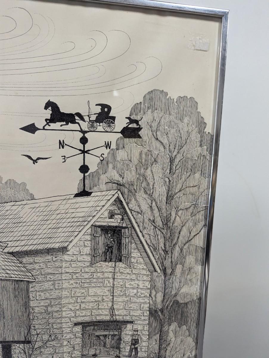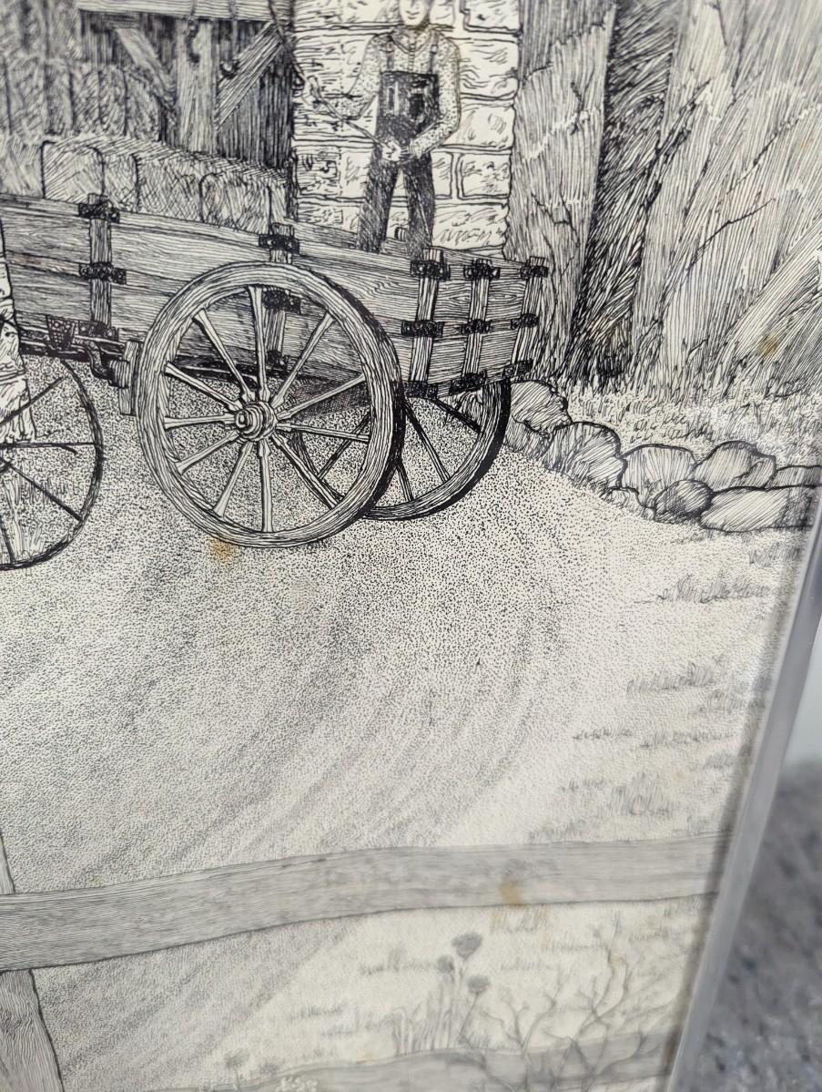 Framed Ink and Pen Drawing "Hay in Time" Signed 23" x 29"
